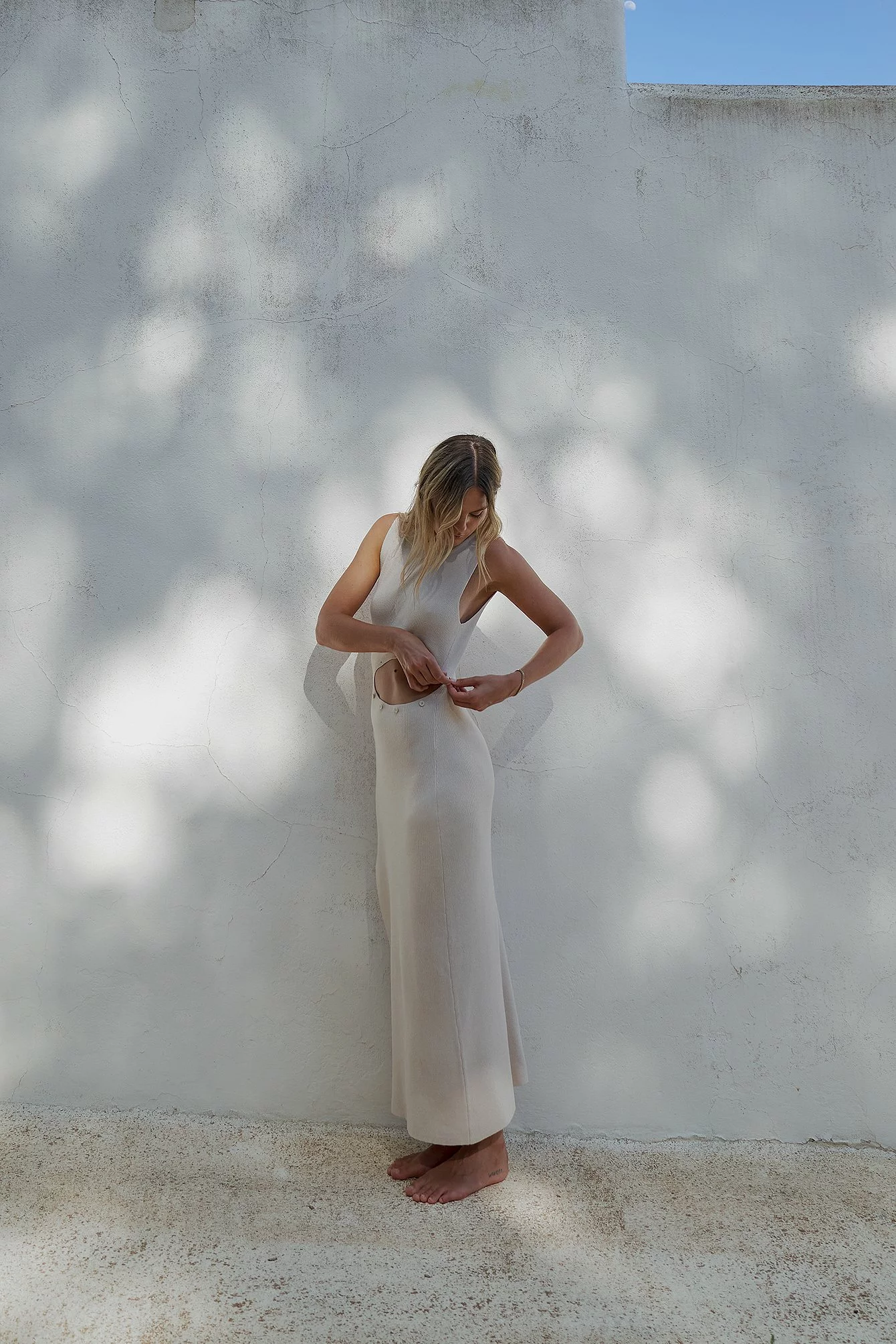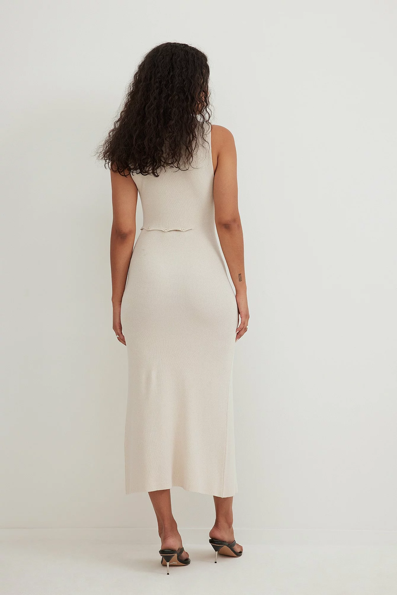 This midi dress features a rounded neckline, a sleeveless design, a cutout detail with a button closure, a high slit and a stretchy, rib-knit material.