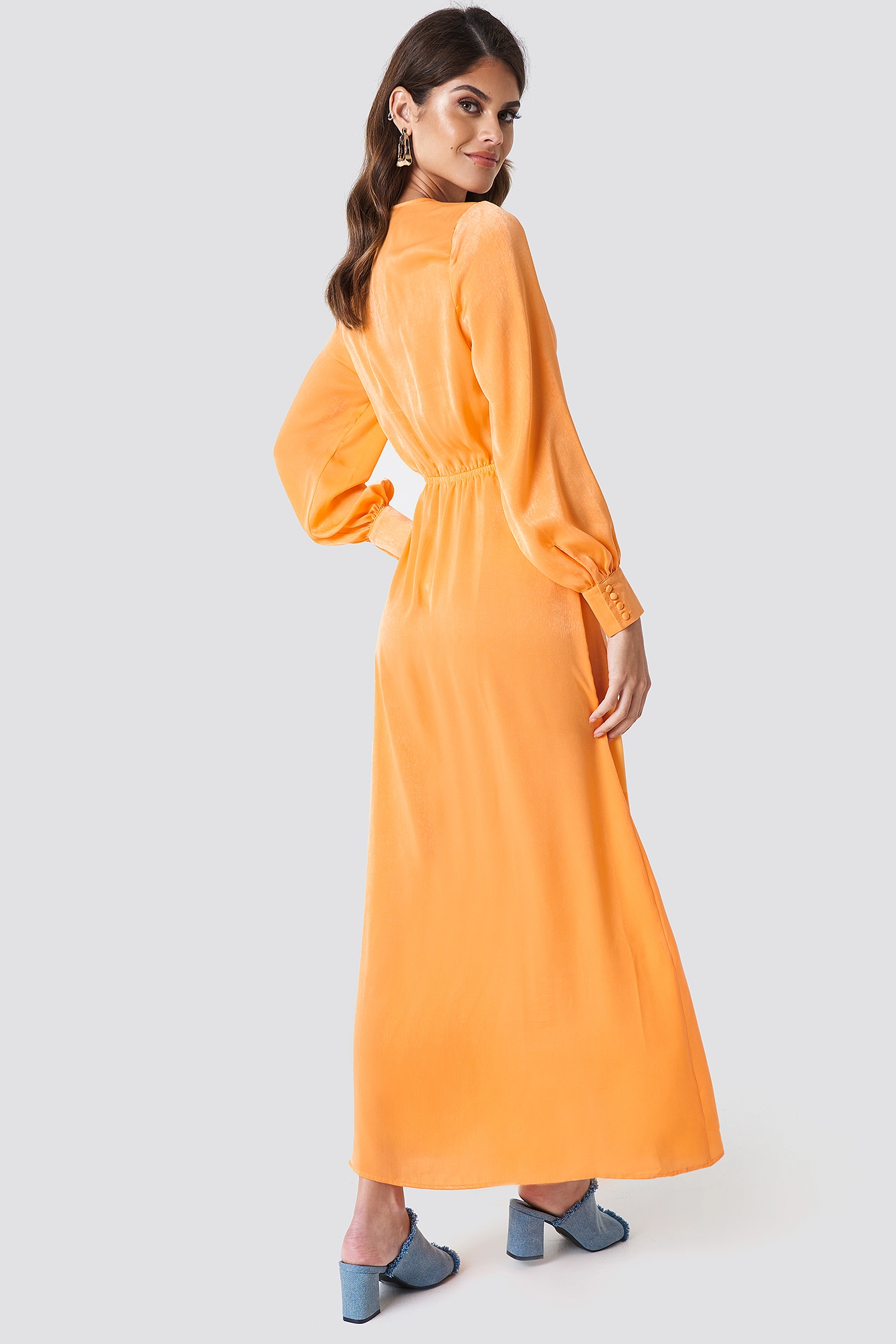 The Front Button Maxi Dress by Andrea Hedenstedt for NA-KD features a v-neck, long sleeves, and buttons on the front.
