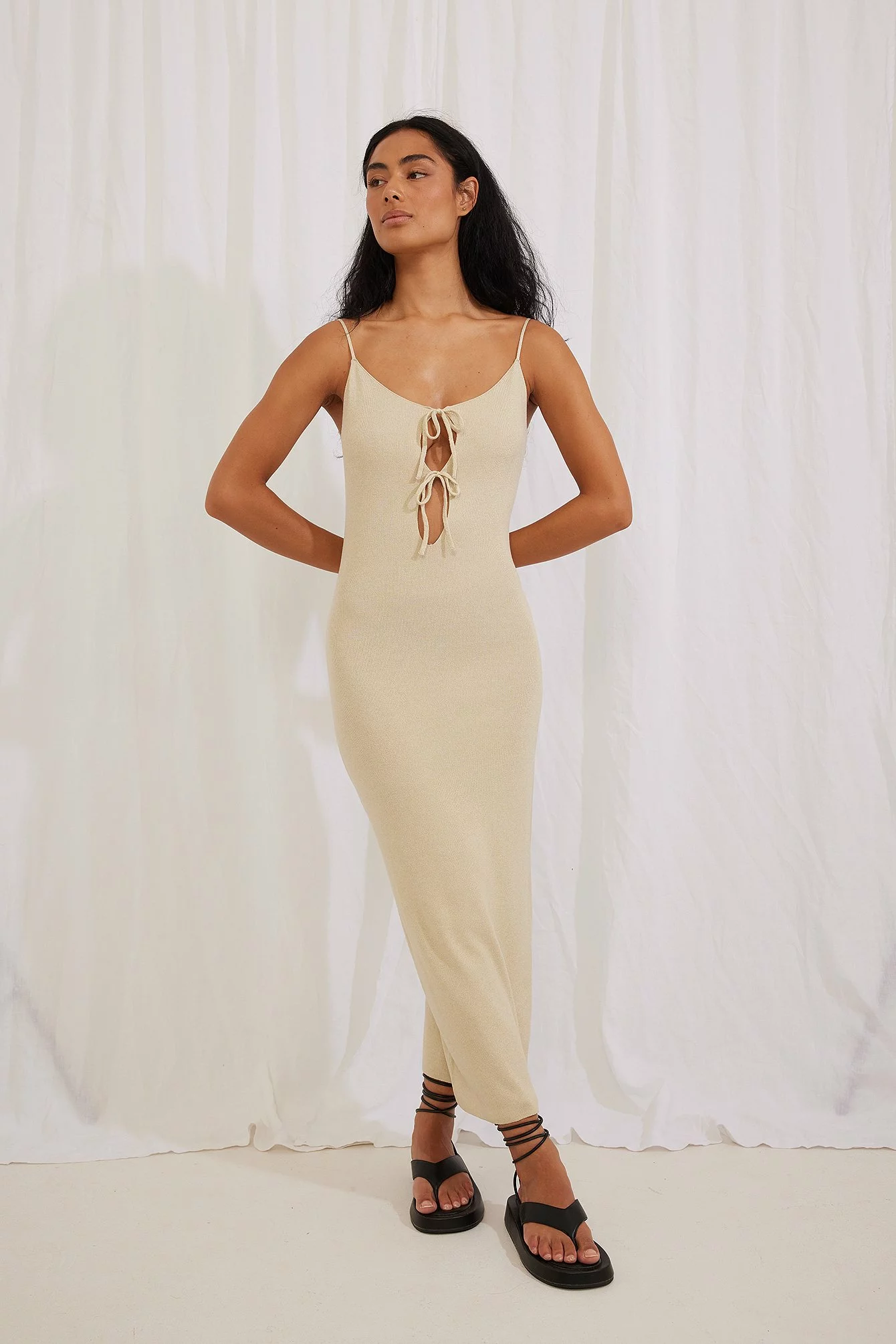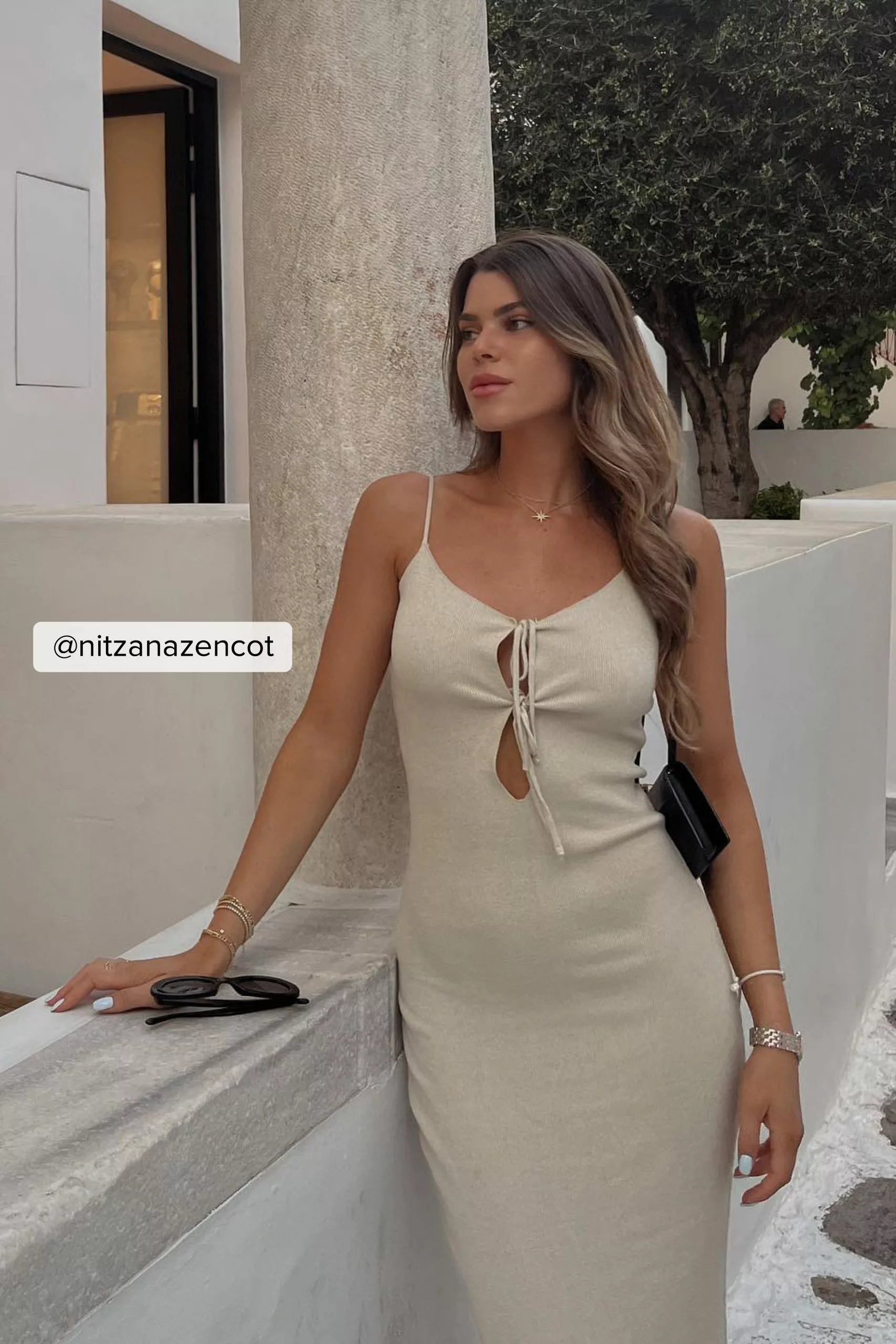 This midi dress features a v neckline with cutout details with self-tie bands, adjustable spaghetti straps and a form fit.