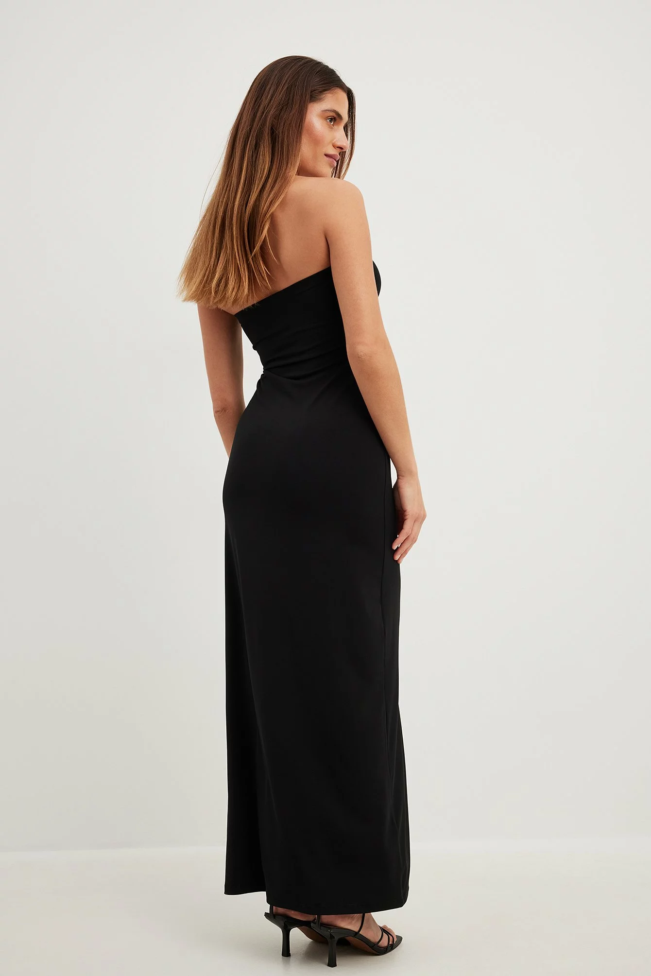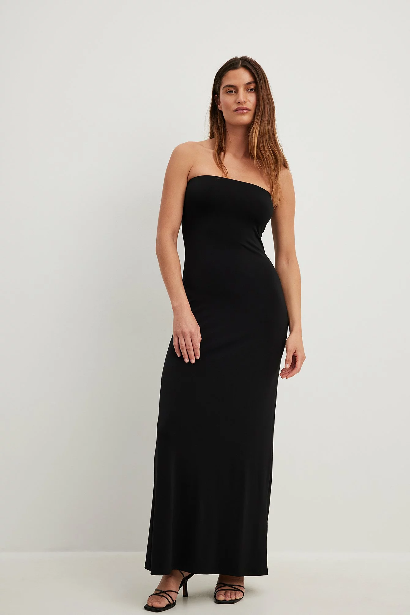 This maxi dress is elasticized and features a bandeau design. It has a bodycon fit and an inner silicone trim.