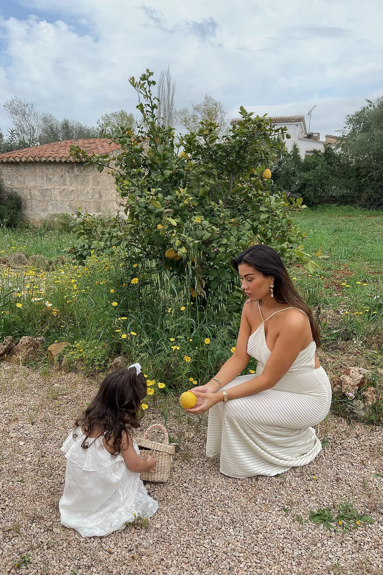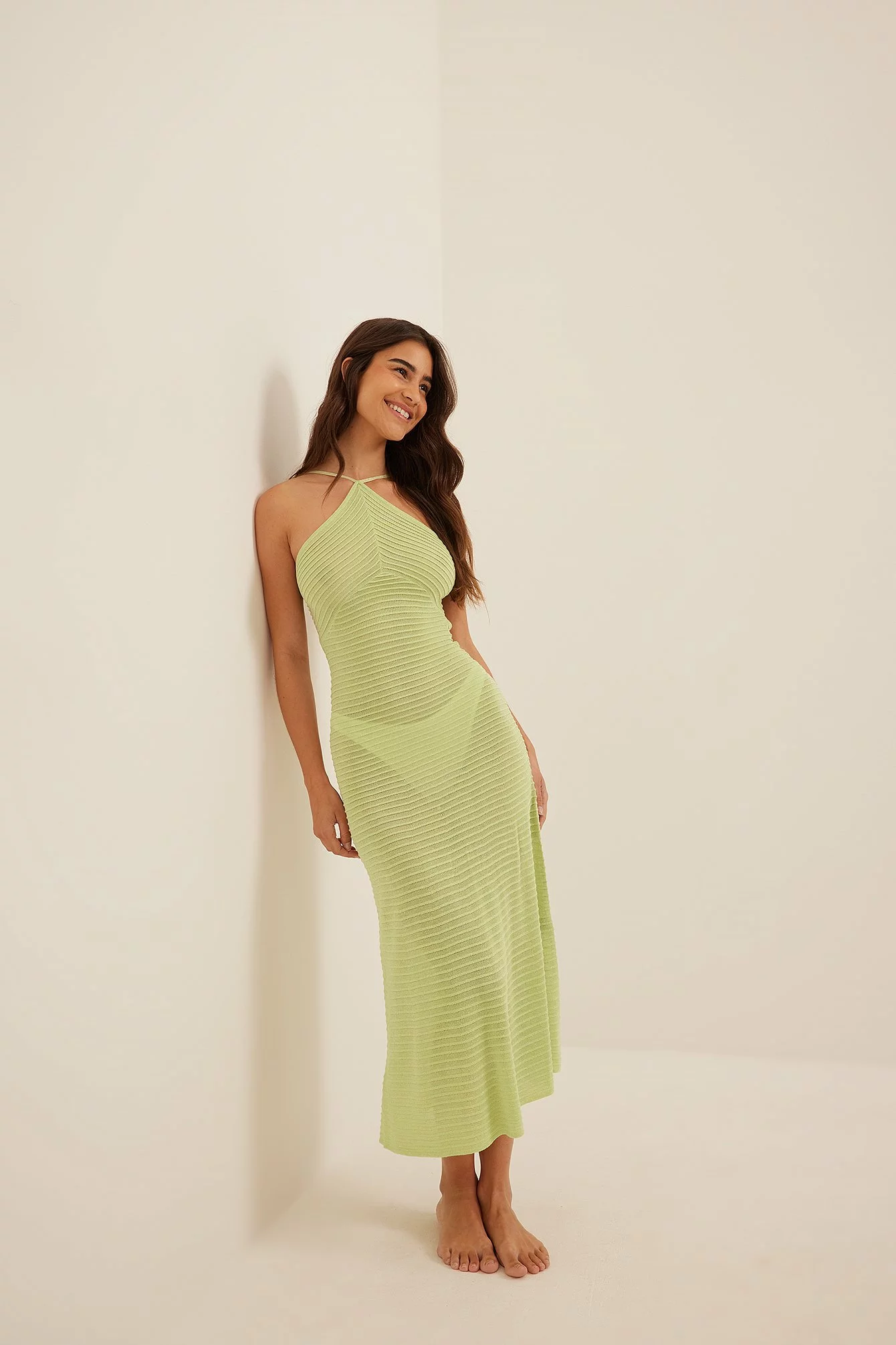 This midi dress features a triangle shaped neckline, adjustable shoulder straps with a self-tie knot on the back, an open back design, a flowy fit and a ribbed, slightly stretchy, glittery material.