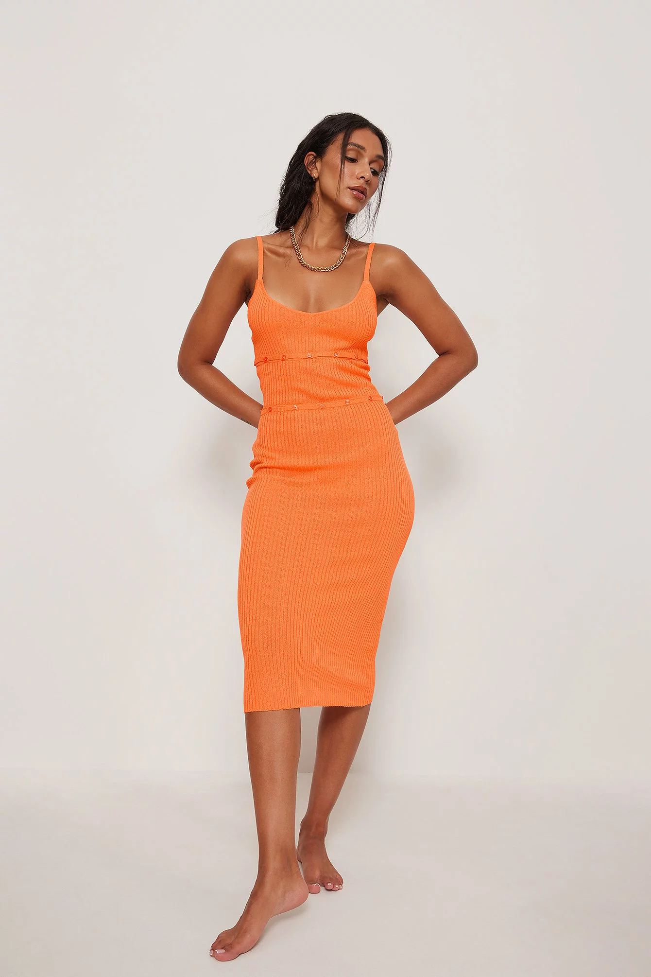This midi dress features shoulder straps, two rows with button details and a rib-knit, stretchy material.