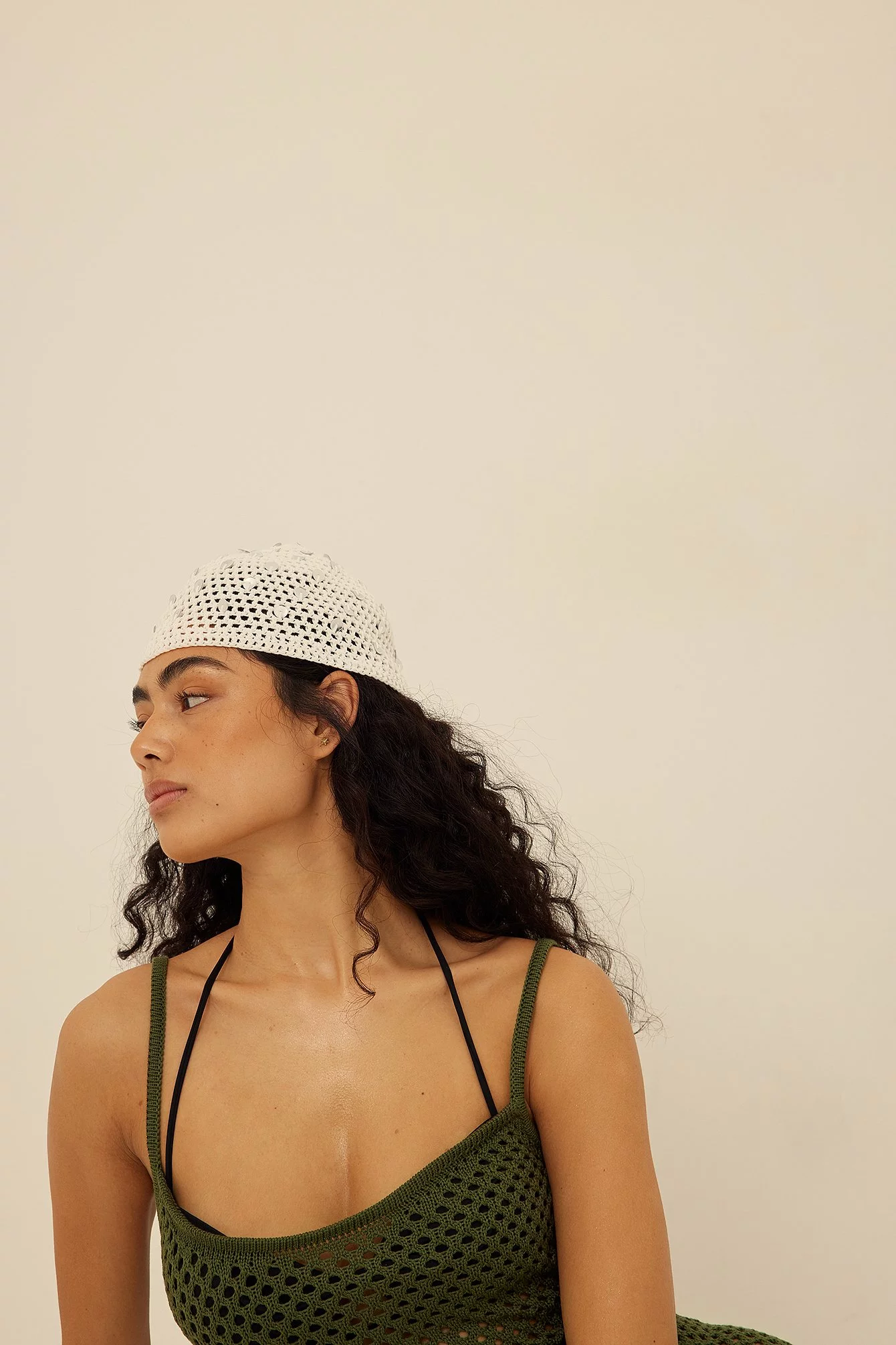 This midi dress features shoulder straps. It has a knit material with fishnet holes.