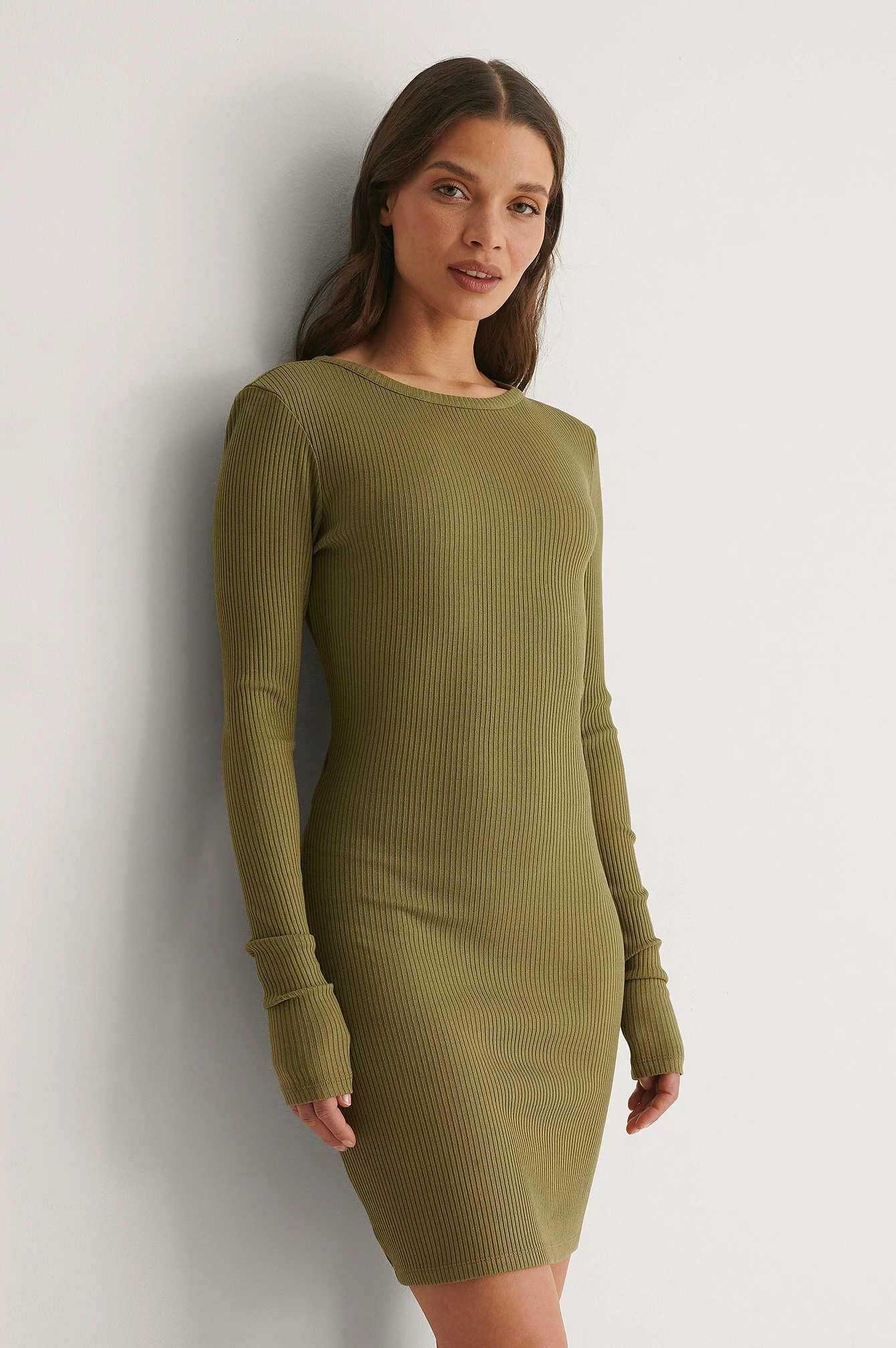 This mini dress features a round neckline, cut out details at the back and a stretchy, ribbed material.