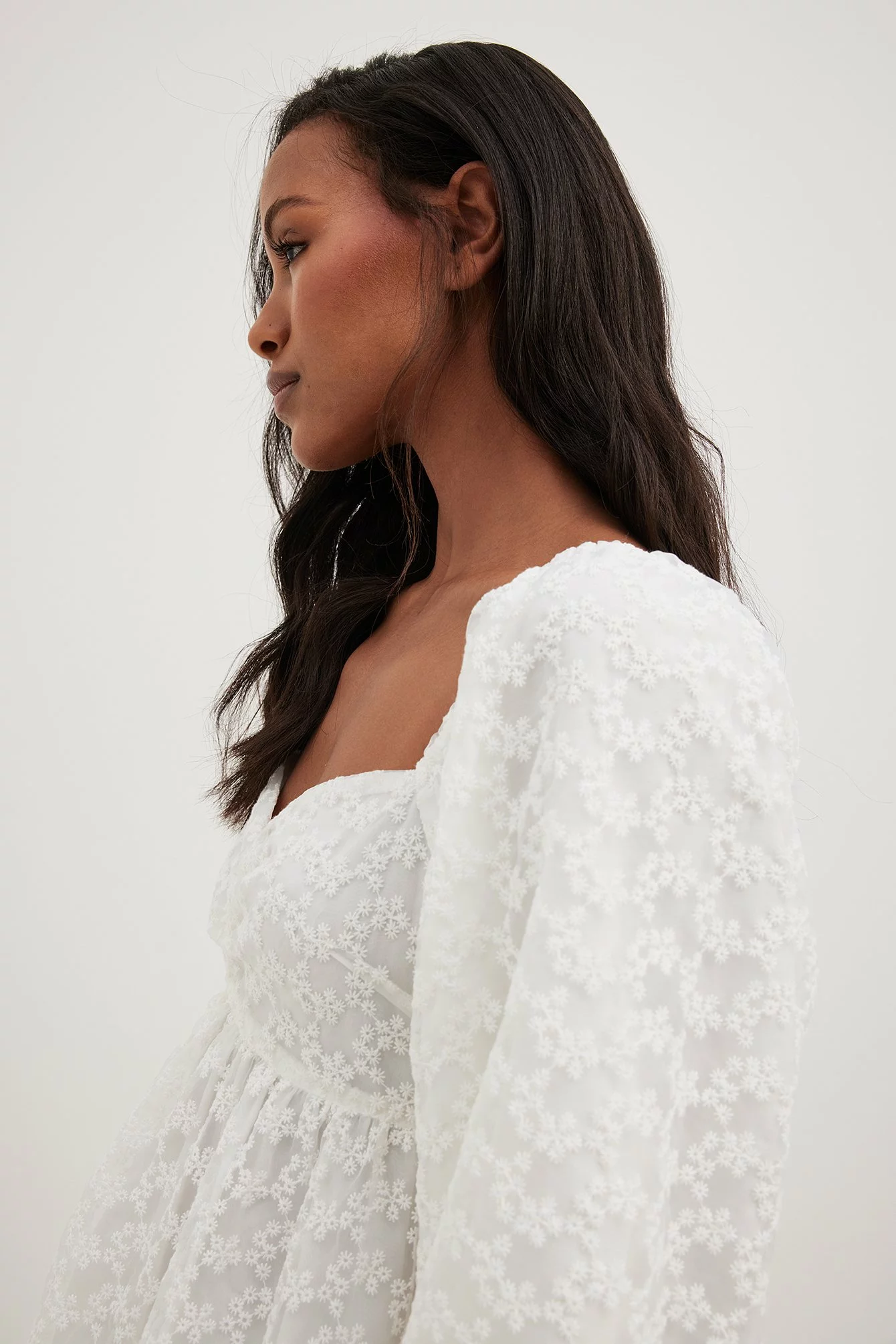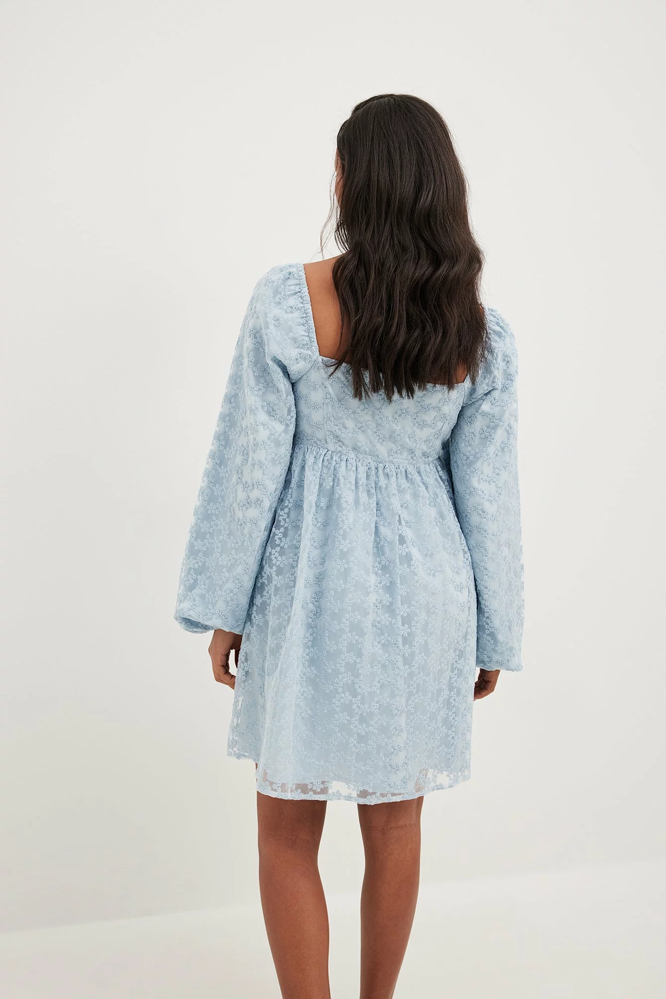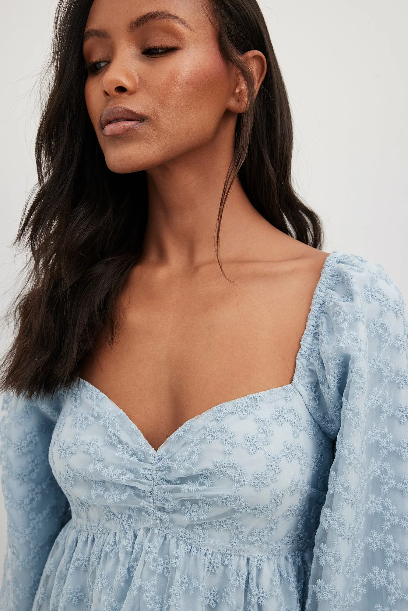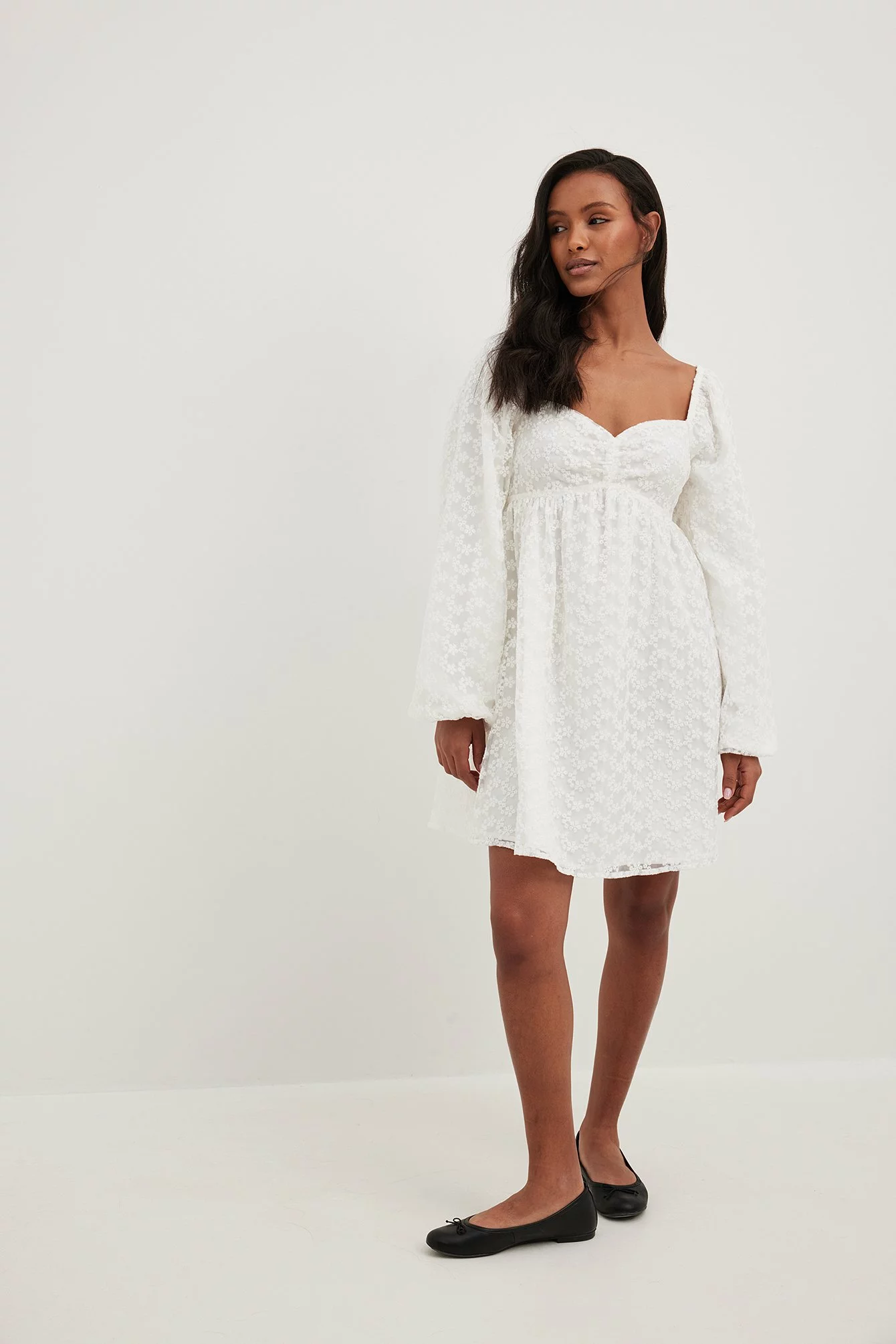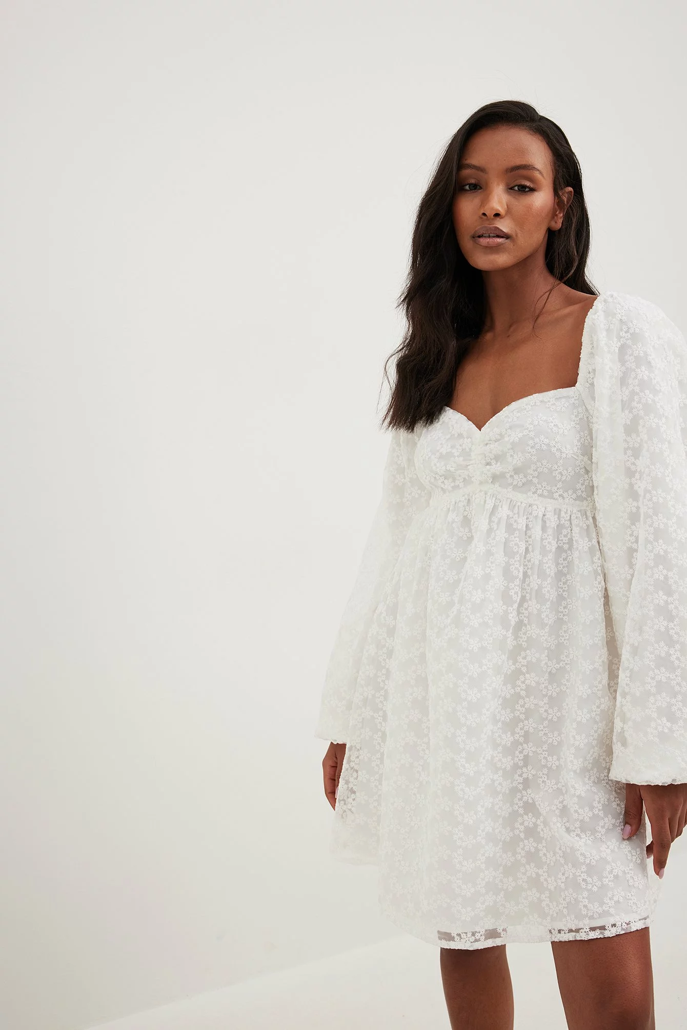 This mini dress features a sweetheart neckline with gathered details on the chest. It has puffy long sleeves and a structured material.