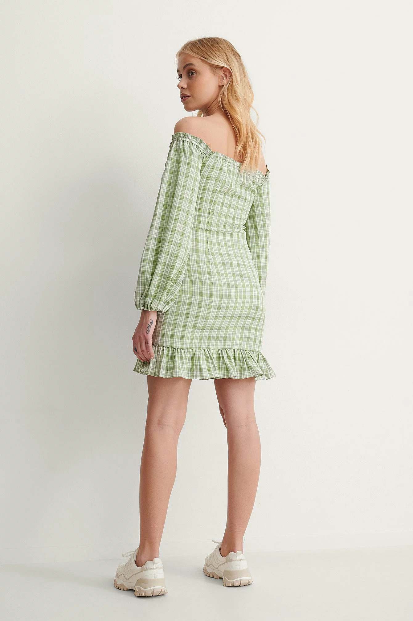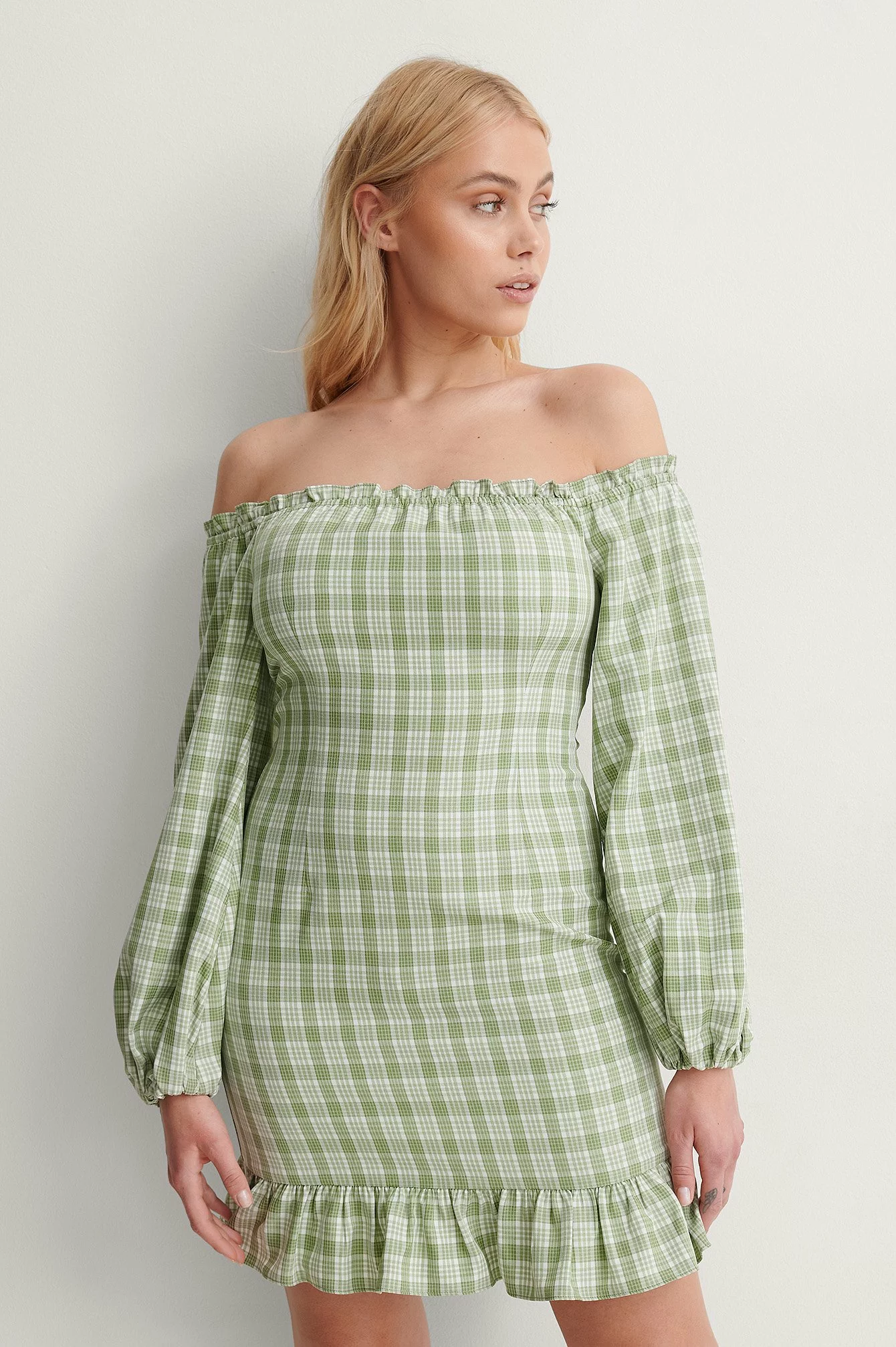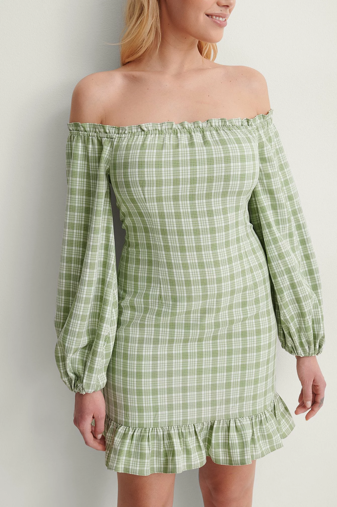 This dress features an off shoulder look with frilled details, long sleeves with elasticized, tight cuffs, a concealed side zipper closure, a flowy fit with frilled details at the bottom hem, a mini length and a checkered pattern.