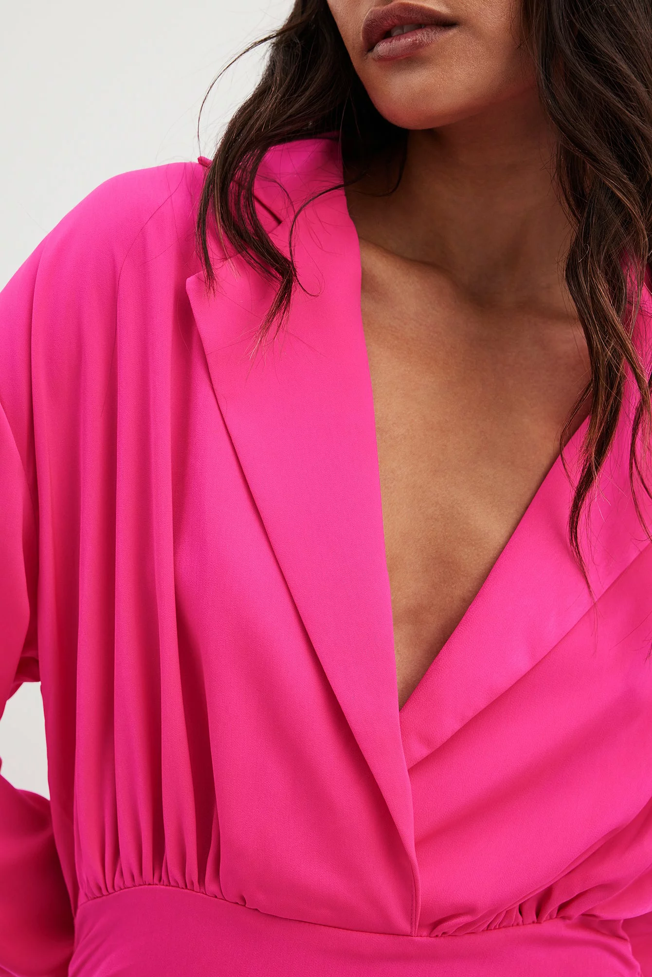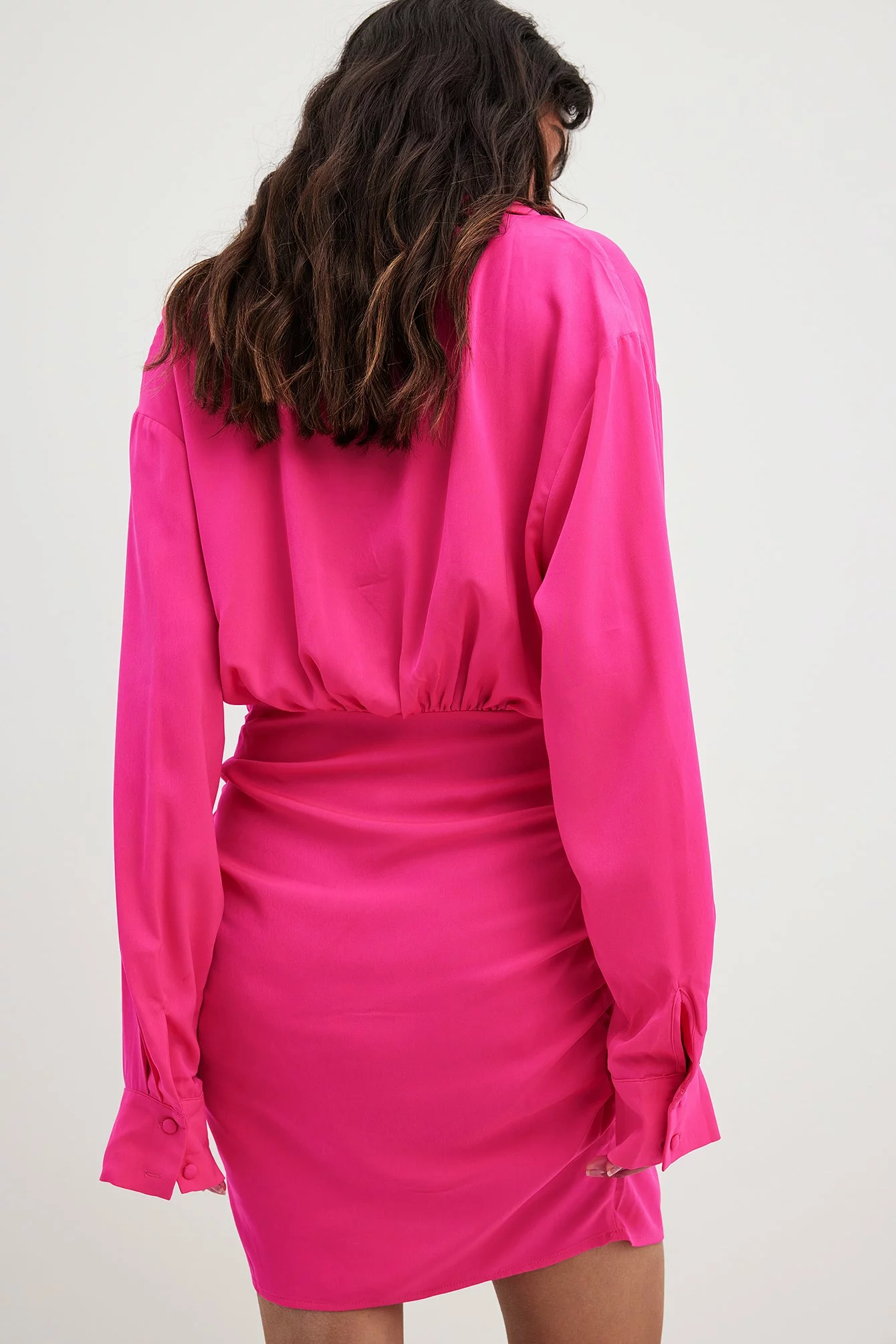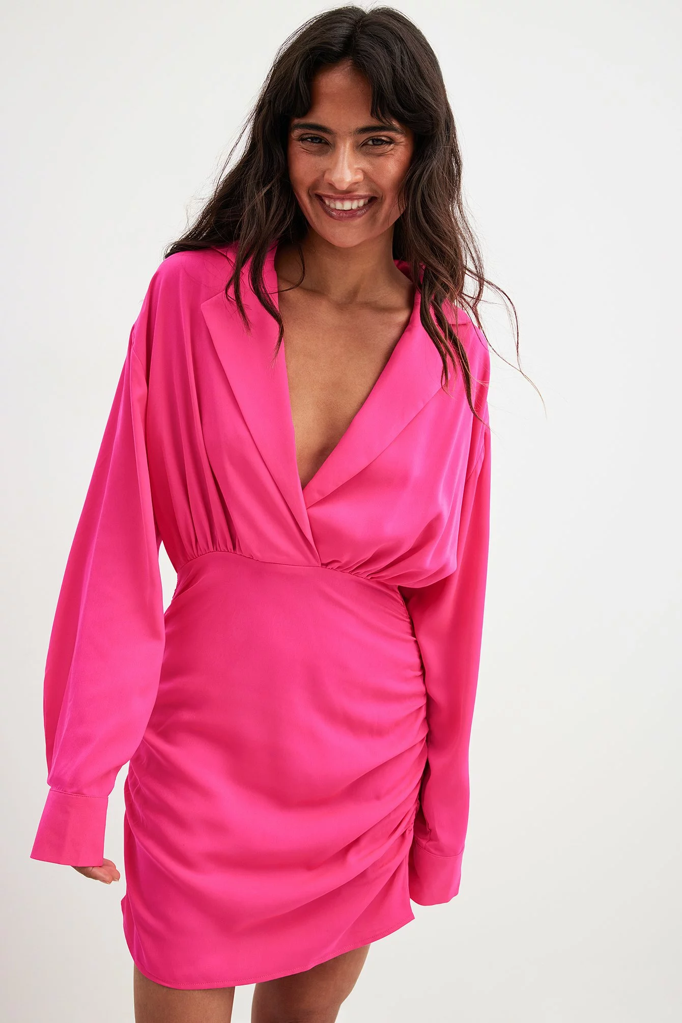This mini dress features a lapel neckline, long sleeves with double button cuffs, gathered seams on the sides, a side zipper closure and a soft material.