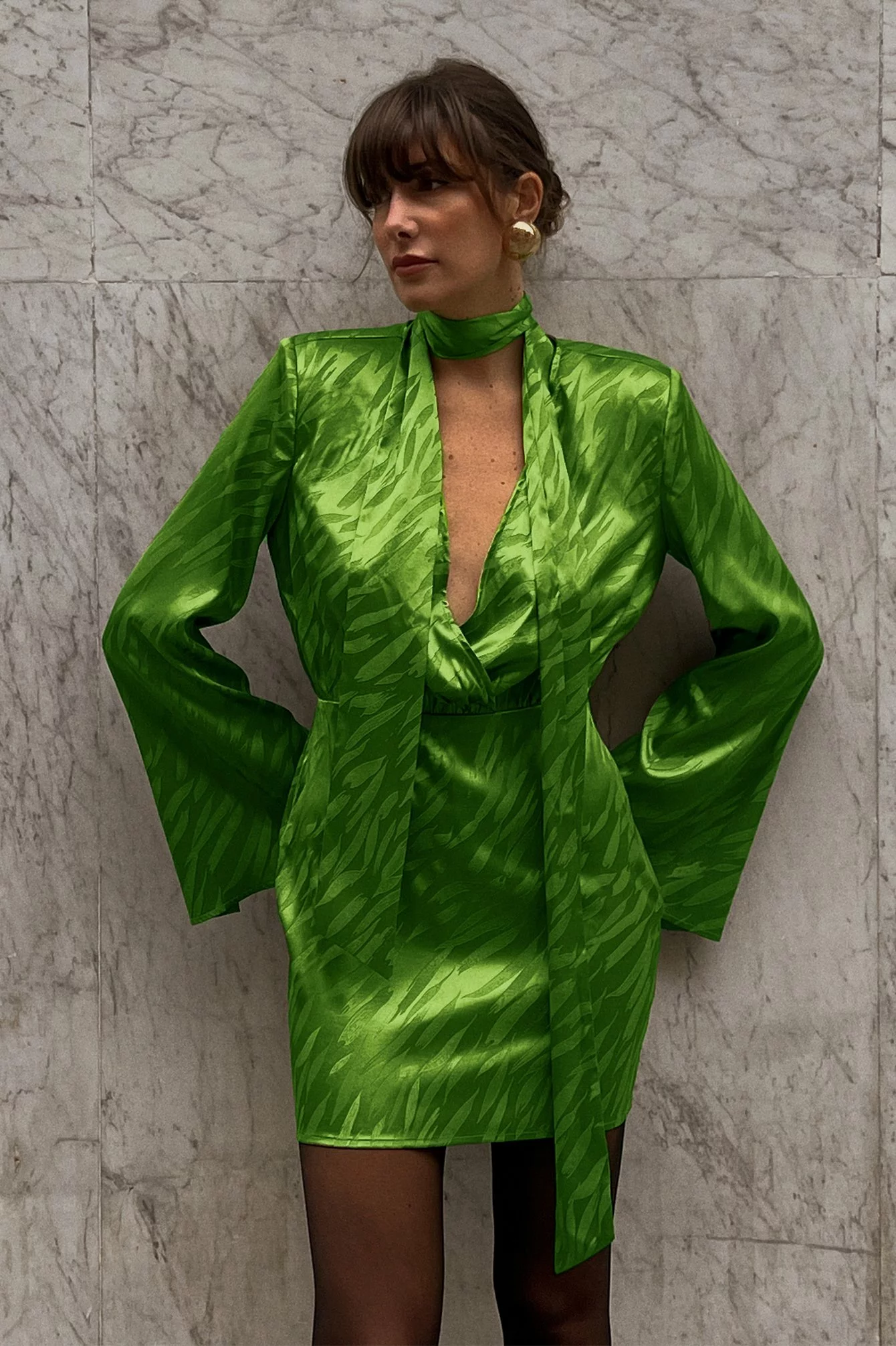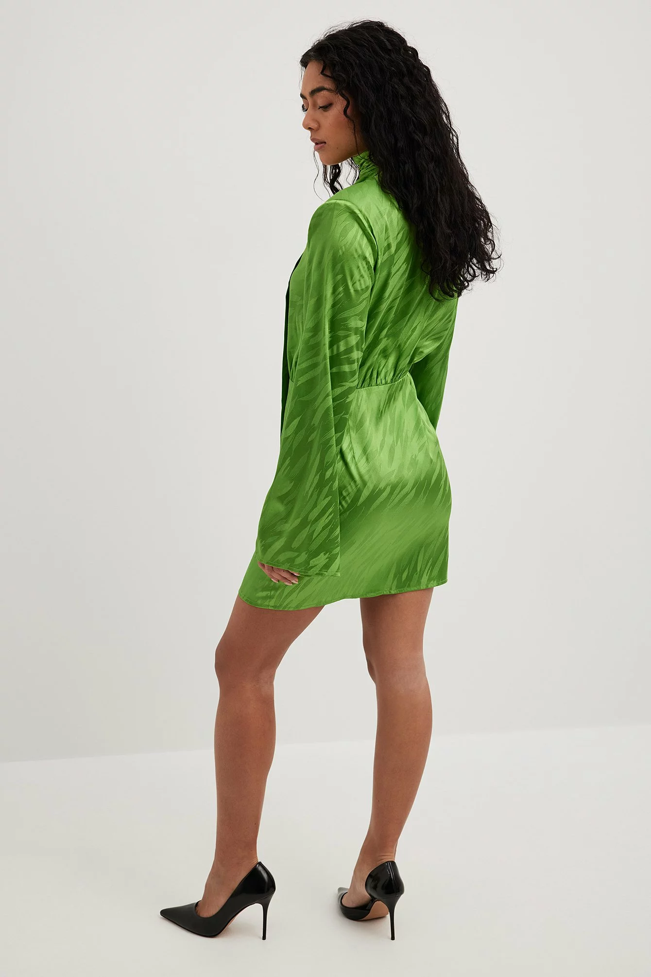 This mini dress features a textured material with a satin touch. It has a removable scarf and padded shoulders. This mini dress features long sleeves with slit details, an overlap detail with a hook-and-eye closure and a side zipper closure.