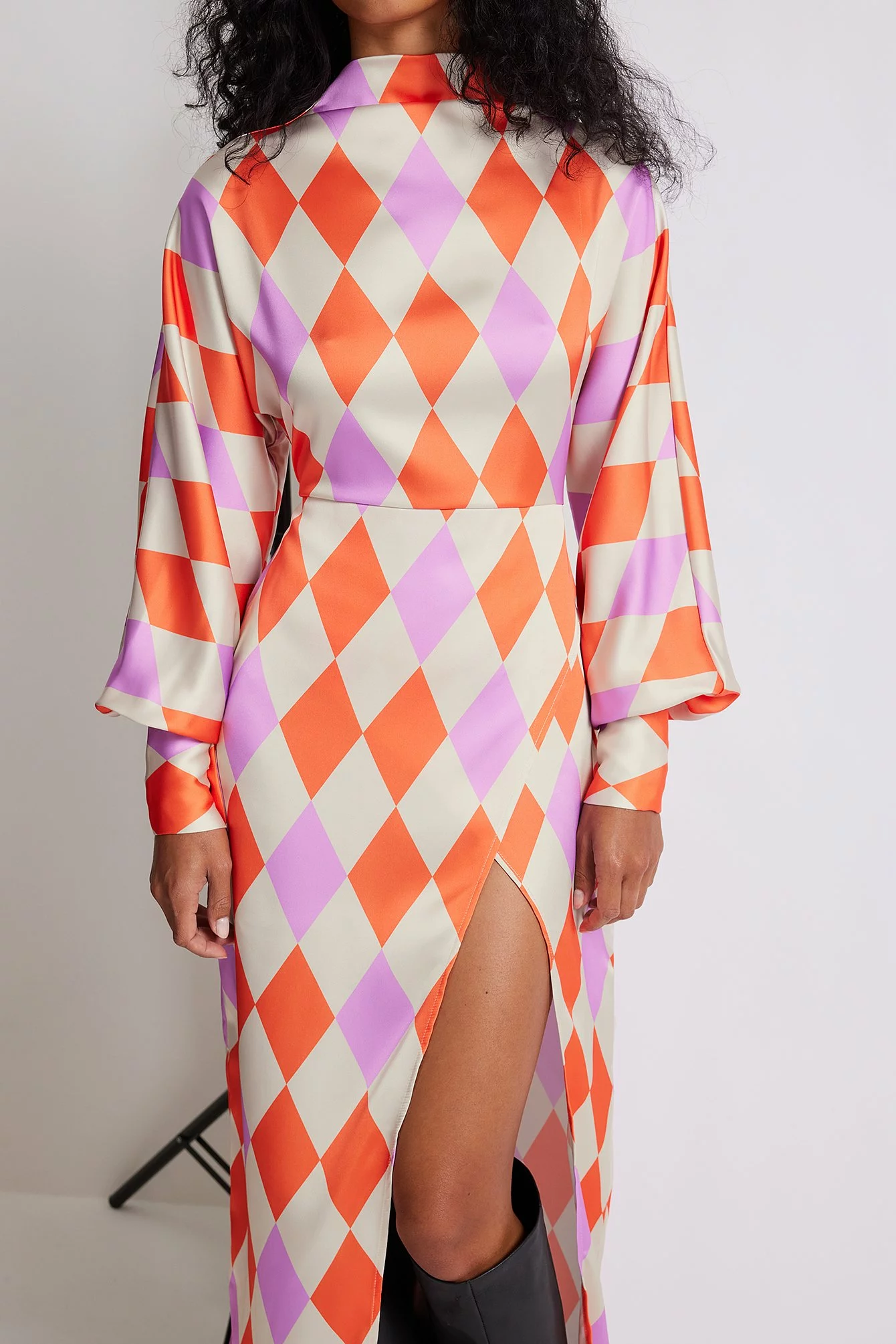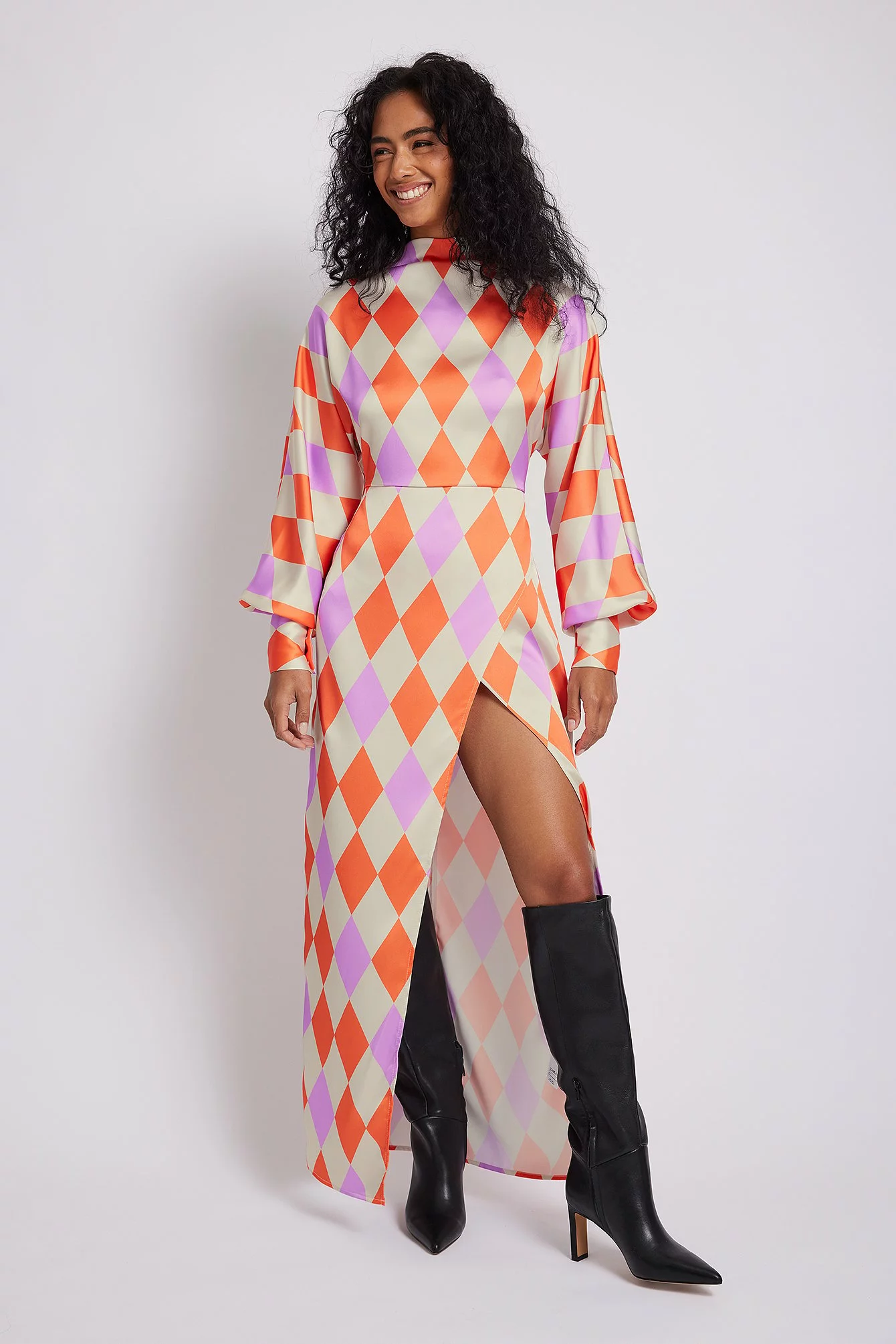 This maxi dress features a high neckline, long sleeves with a triple button cuff, a back zipper and a high slit with an overlap design.