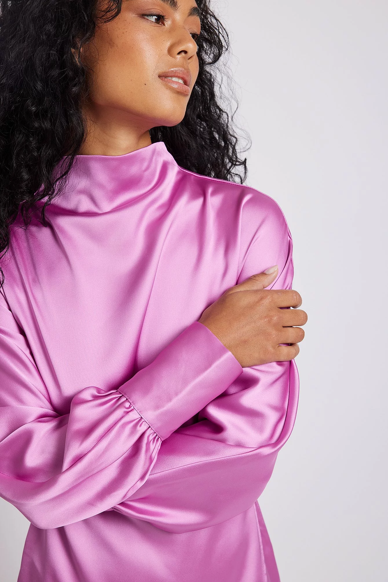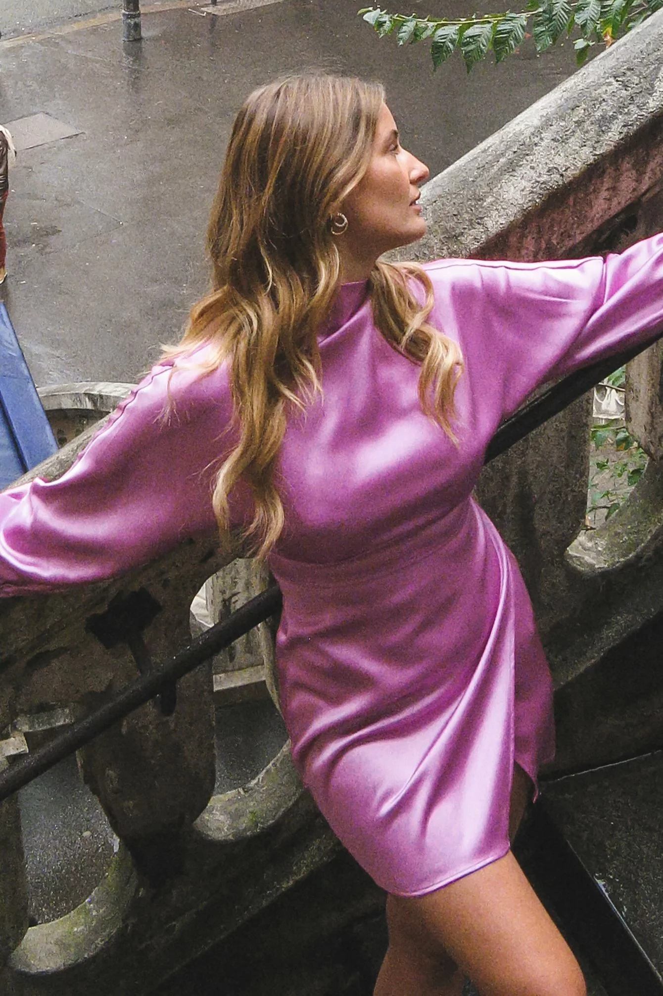 This satin dress features a high neckline, long sleeves with a triple button cuff, a back zipper, a slit detail with an overlap design and a mini length.