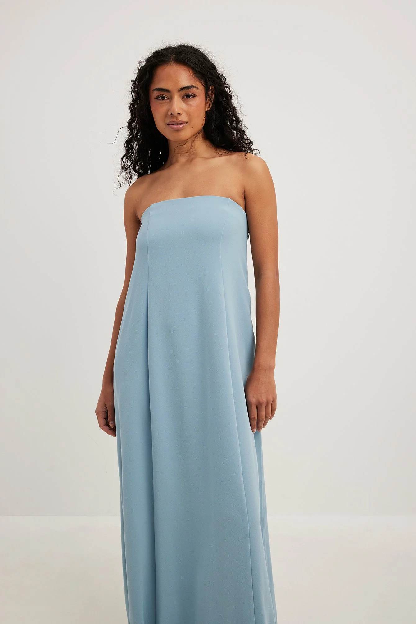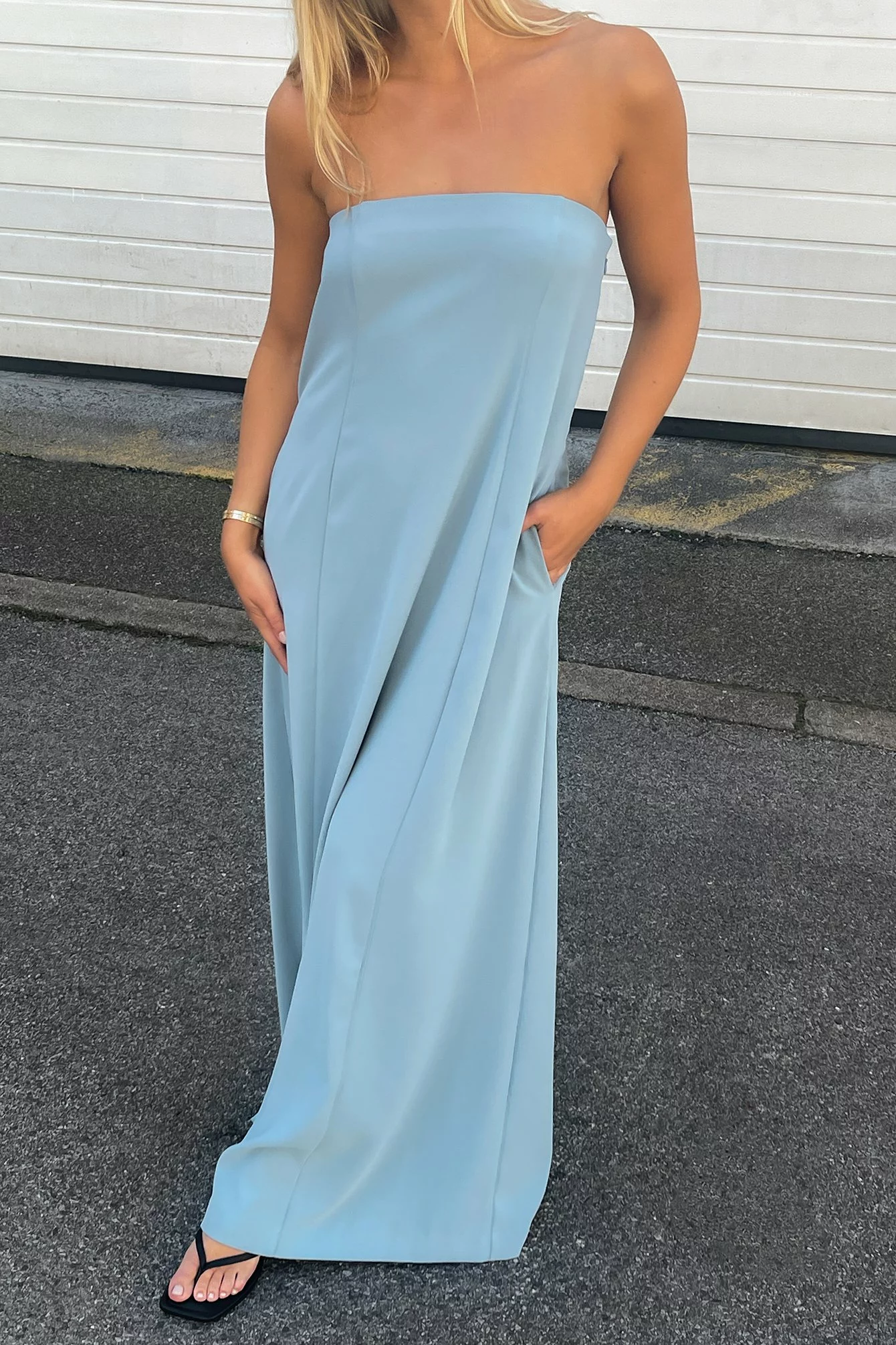 This maxi dress features an inner silicone trim. It has adjustable, removable spaghetti straps and hidden side pockets. This maxi dress features a zipper closure on the side and a lining on the upper half.
