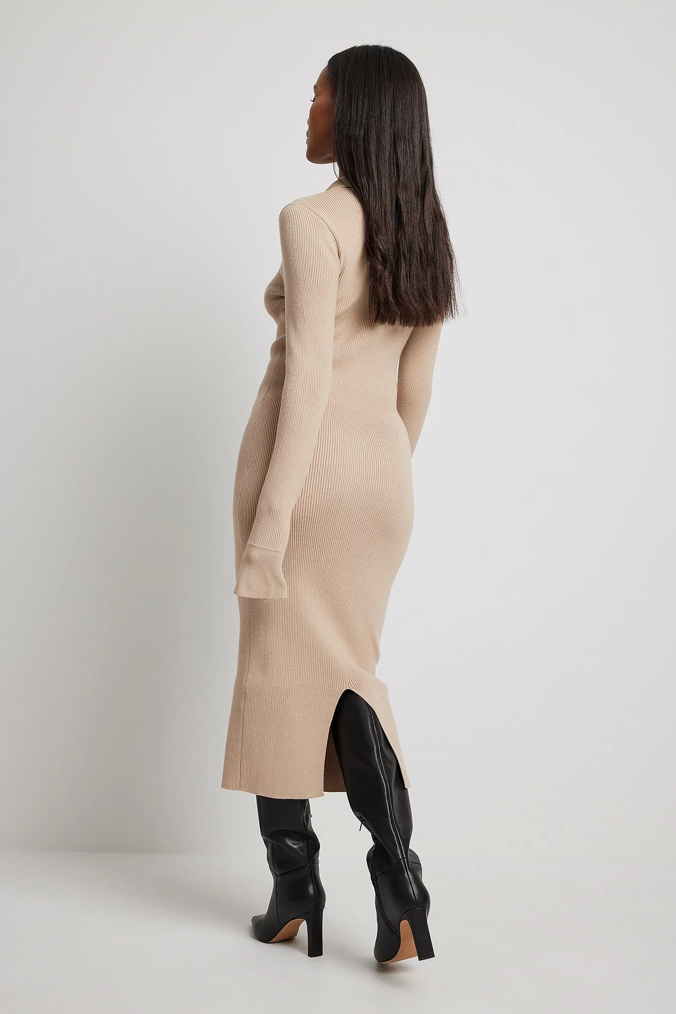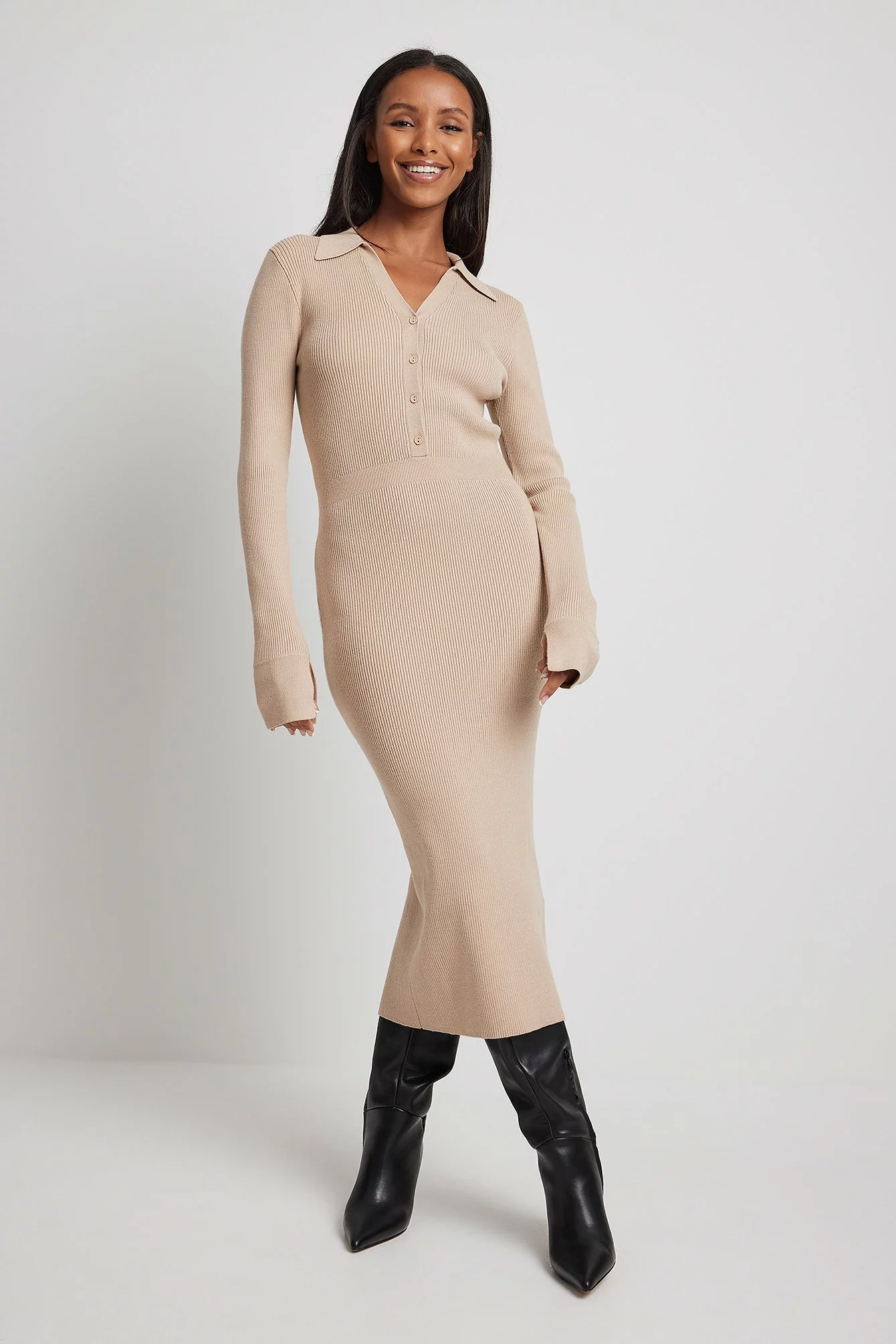 This midi dress is knitted and ribbed and features a shirt collar, a polo design, long sleeves and a back slit detail.