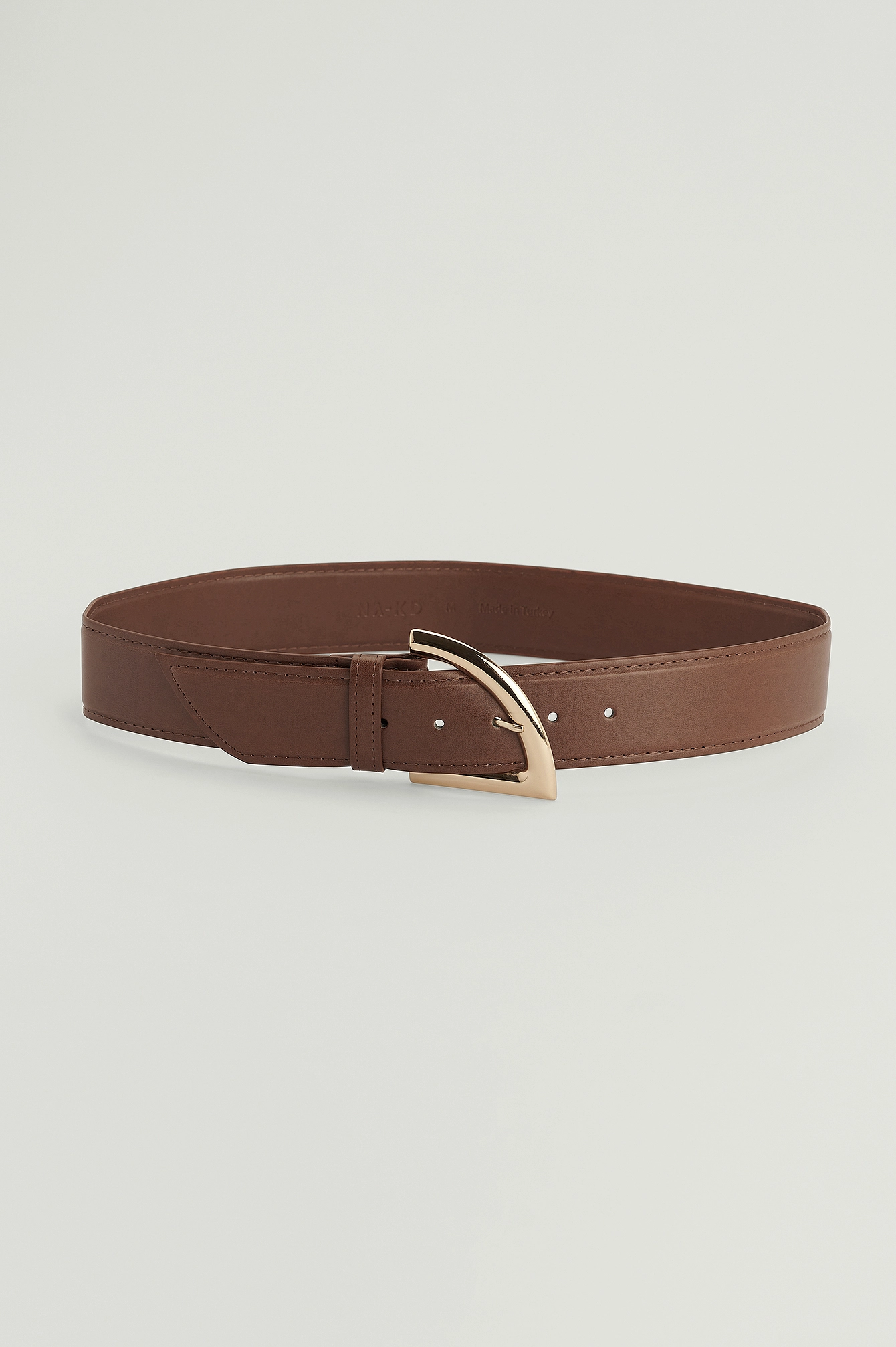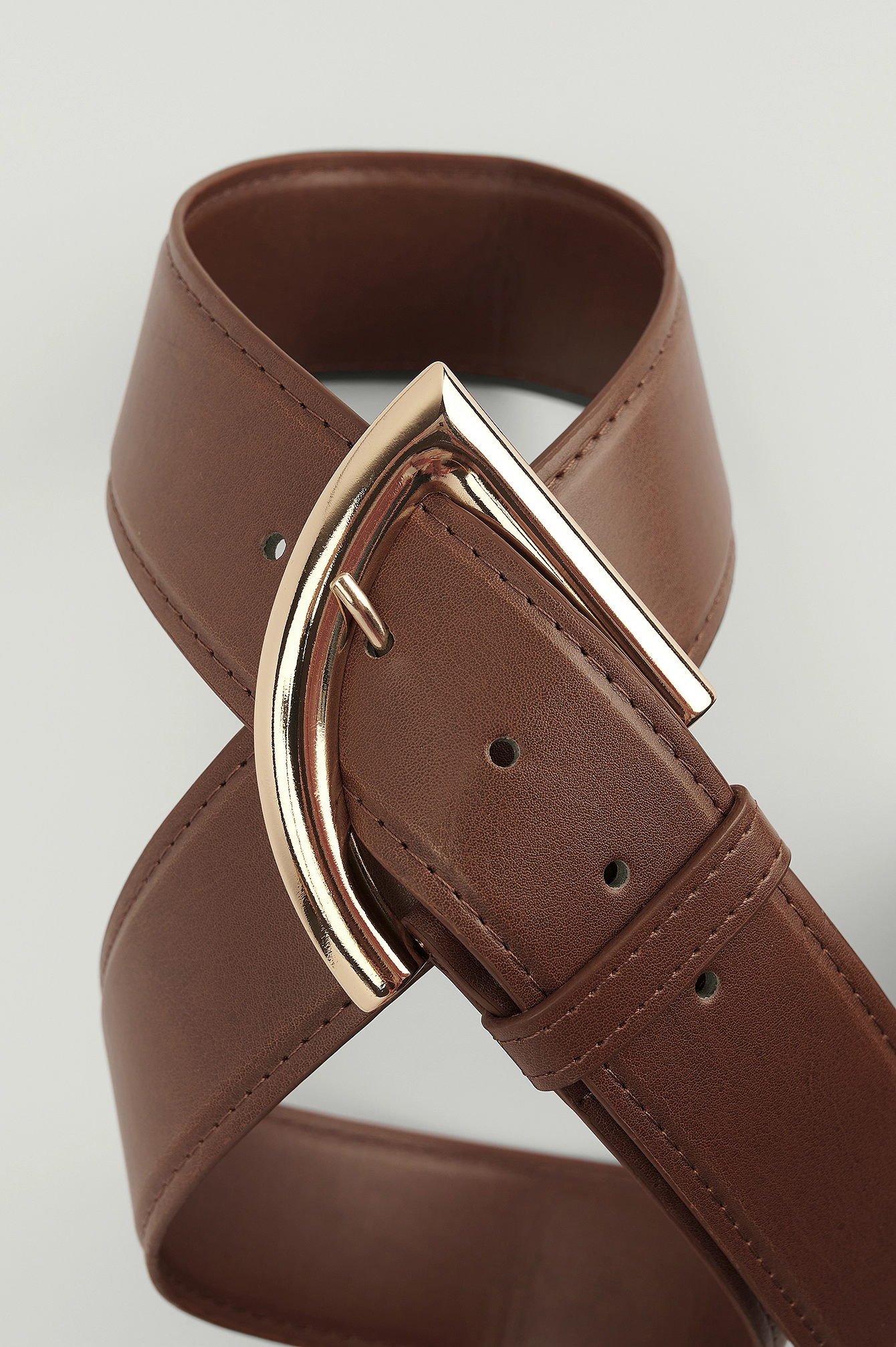 This belt features a gold-colored, angular buckle closure and a faux-leather design. Length in size S: 95 cm/37 in. Width in size S: 4,6 cm / 1.14 in.