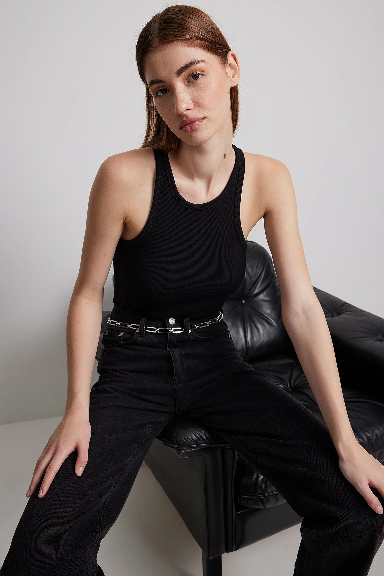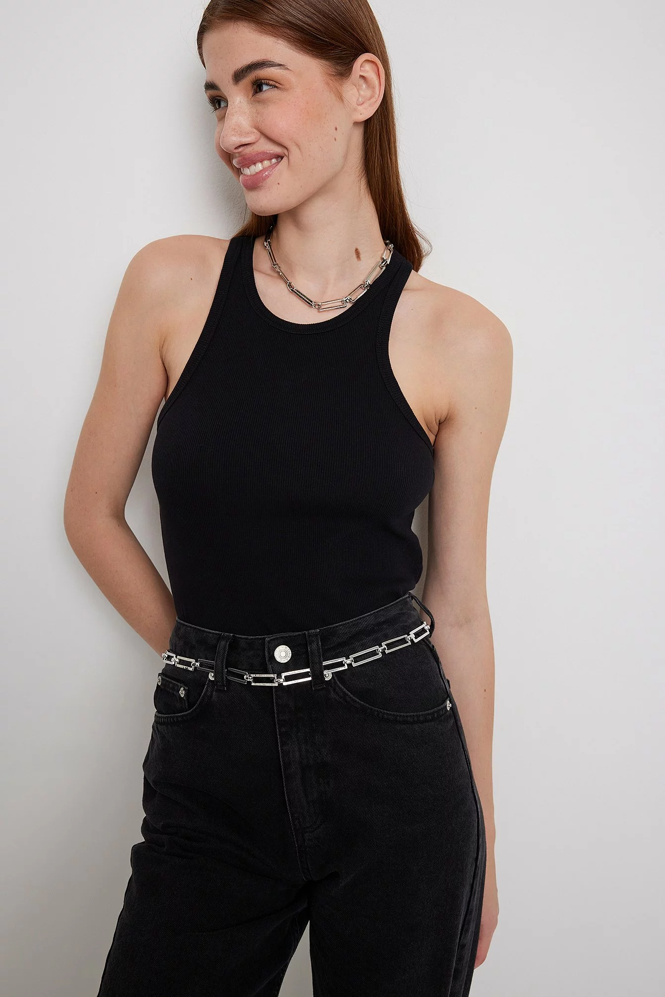 This belly chain is adjustable and features a rectangle design and a clasp closure. Measurements: Length: 86 cm / 34 in. Width: 1 cm / 0.4 in.
