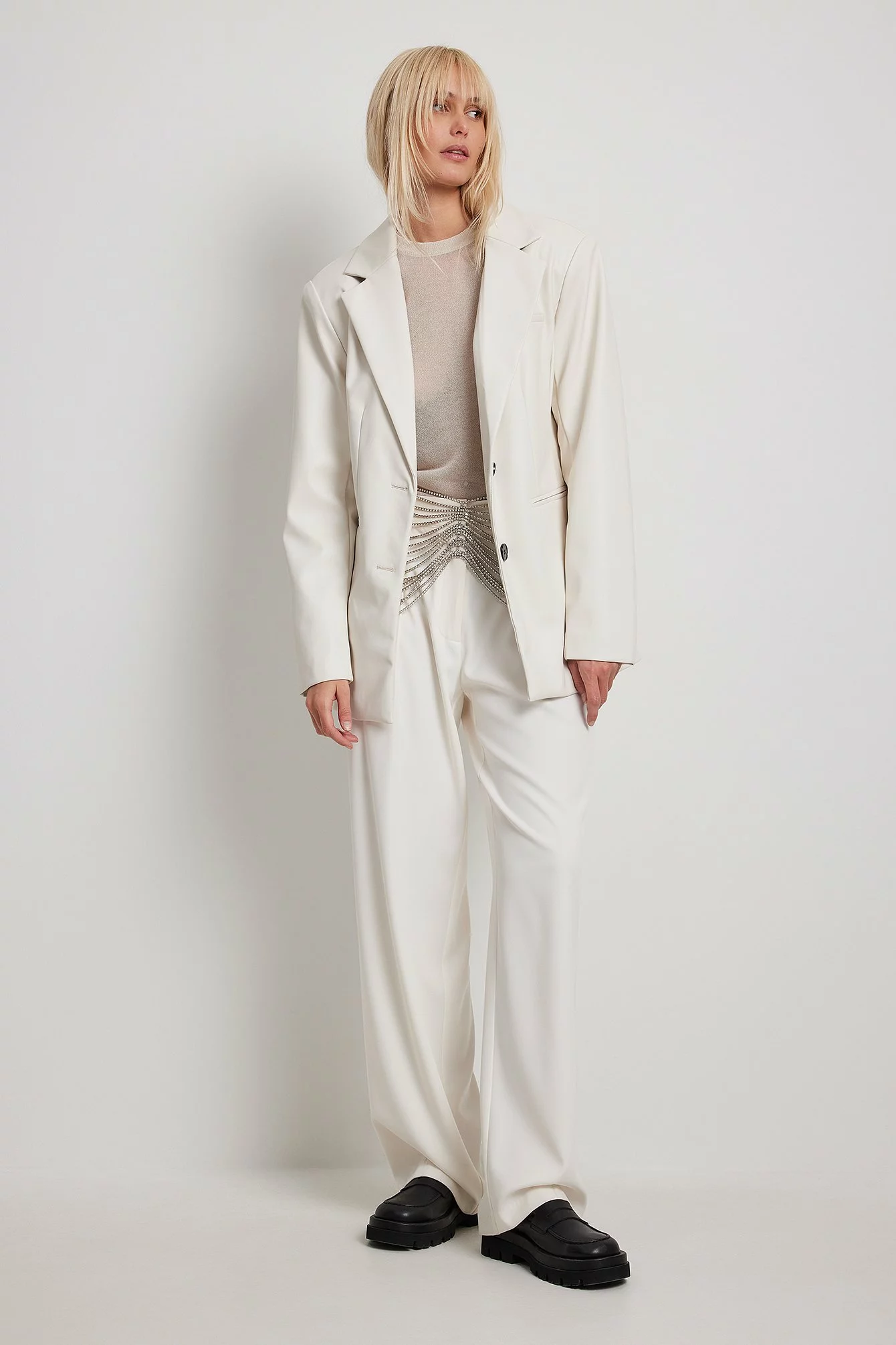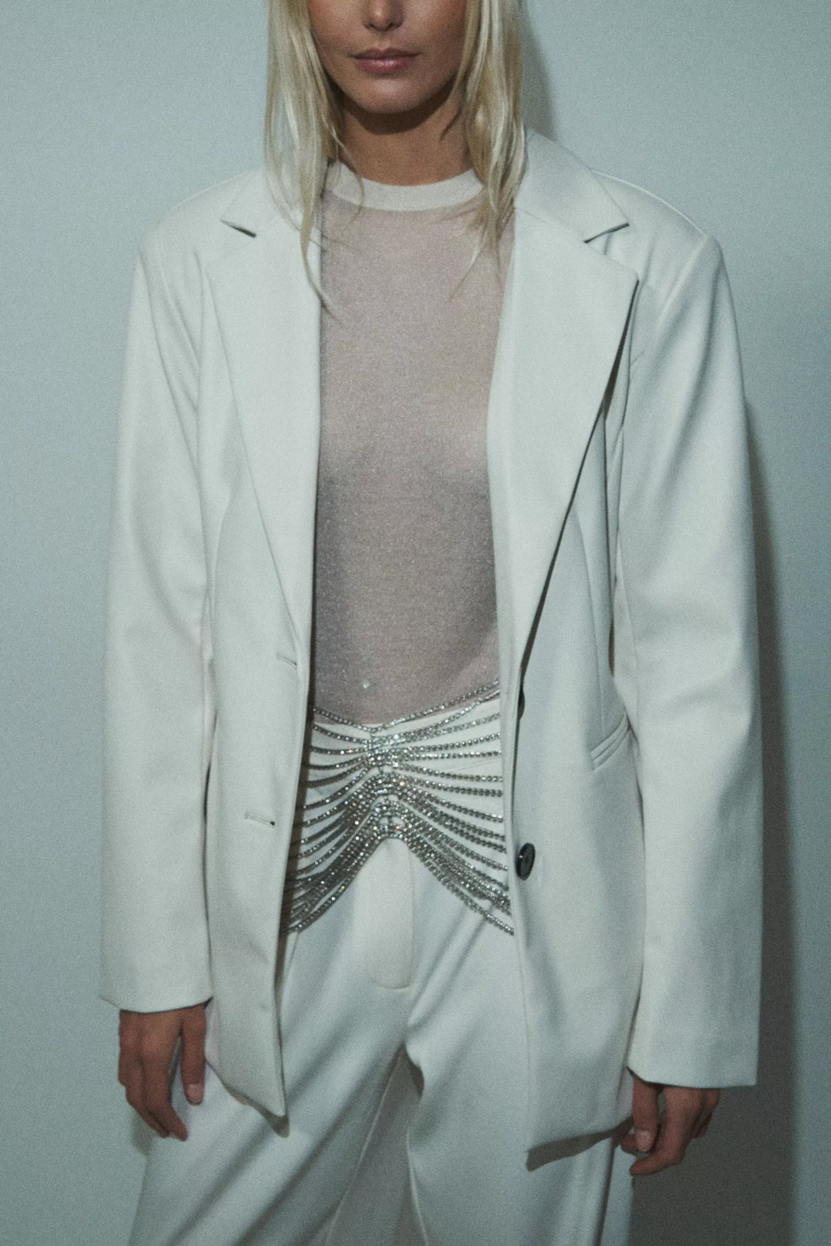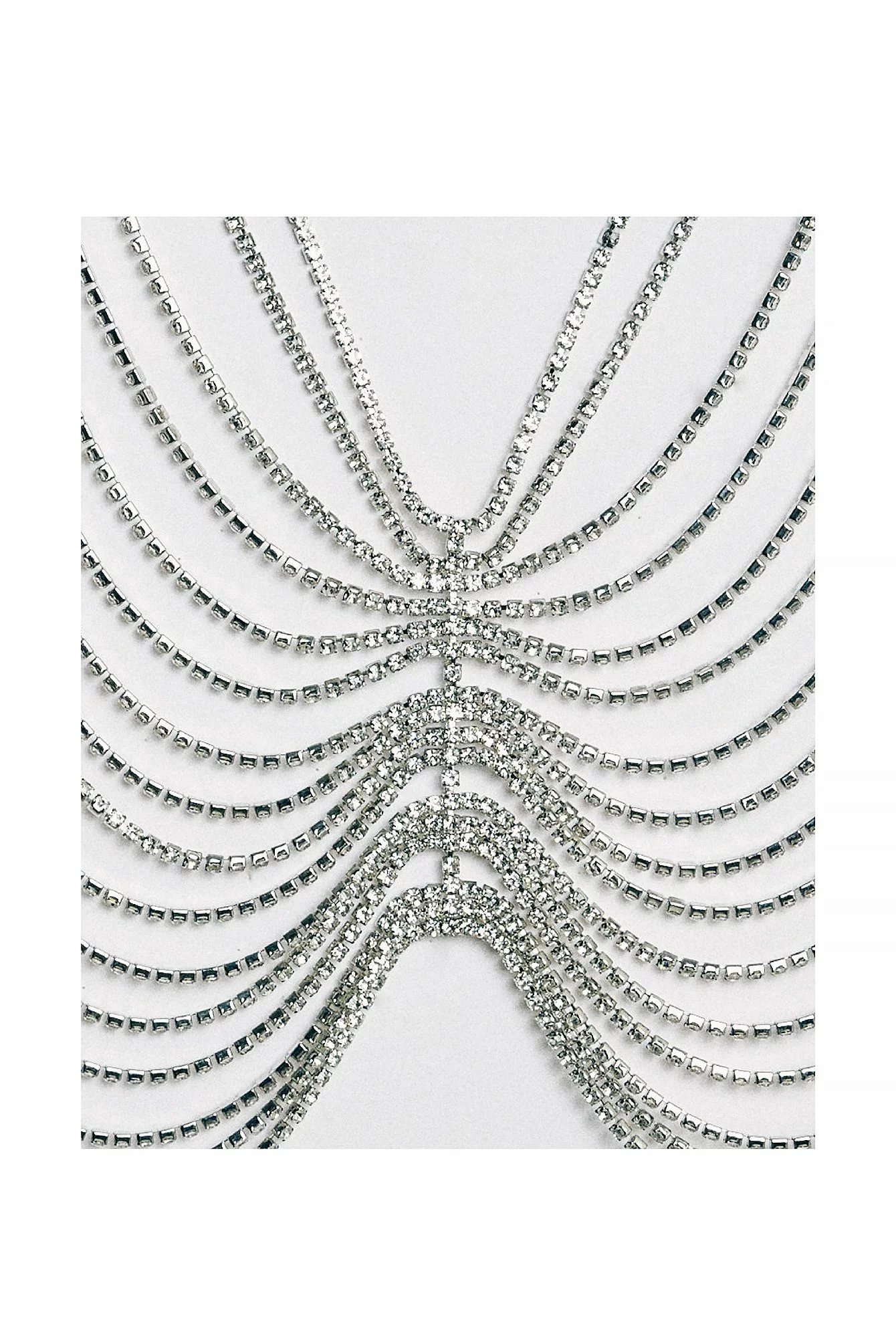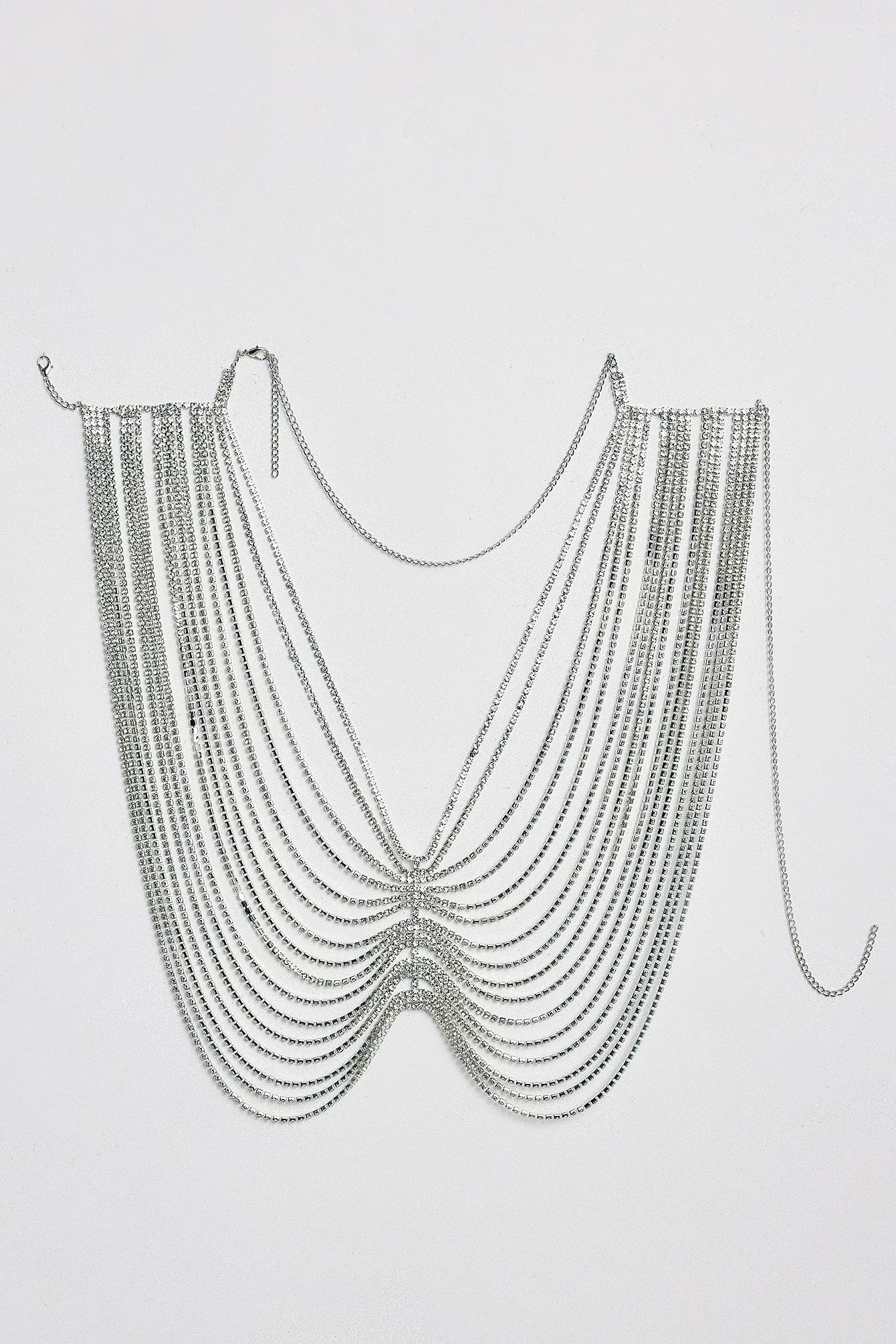 This belly chain features hanging strass along the item. It has a double clasp closure.