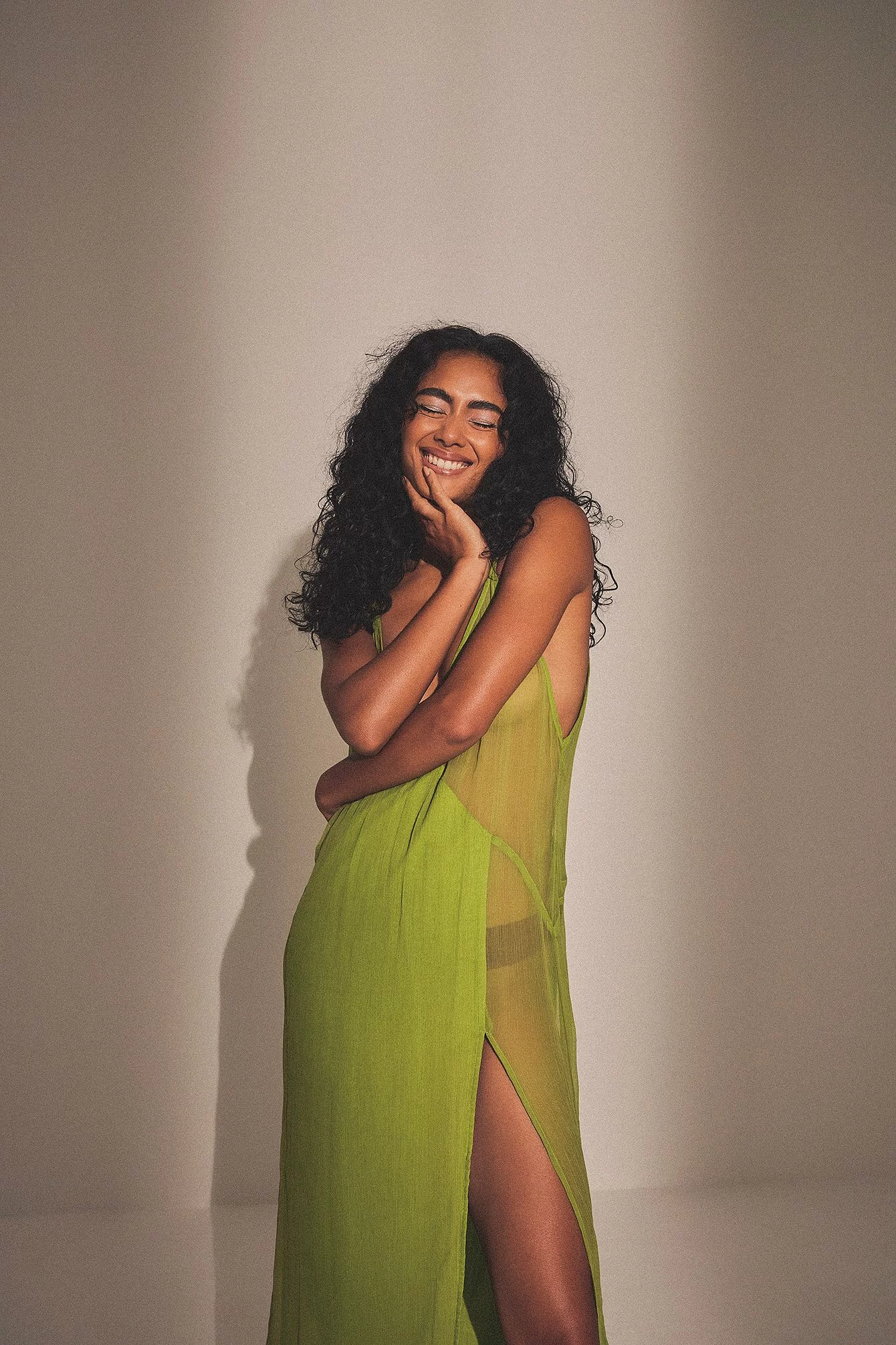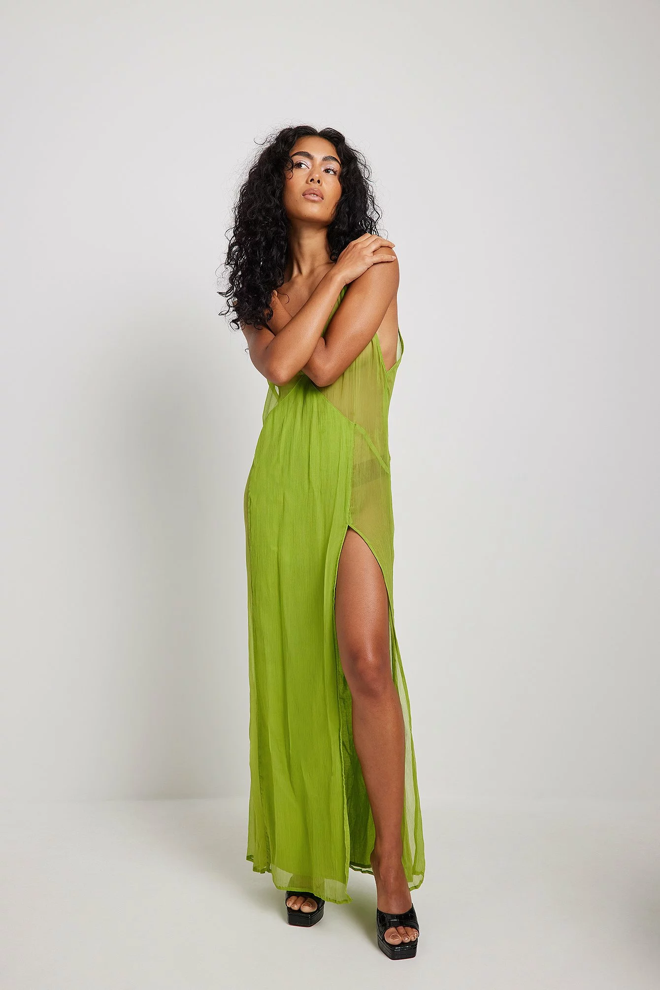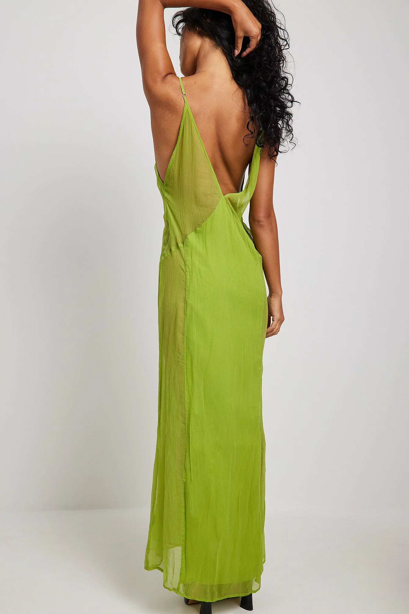 This maxi dress is sheer and partially lined and features thin, non adjustable shoulder straps. It has a v neckline and a high side slit. This maxi dress features an unpadded, removable bra with adjustable shoulder straps.
