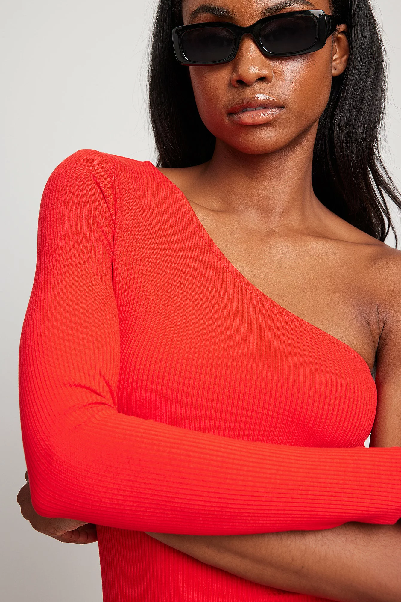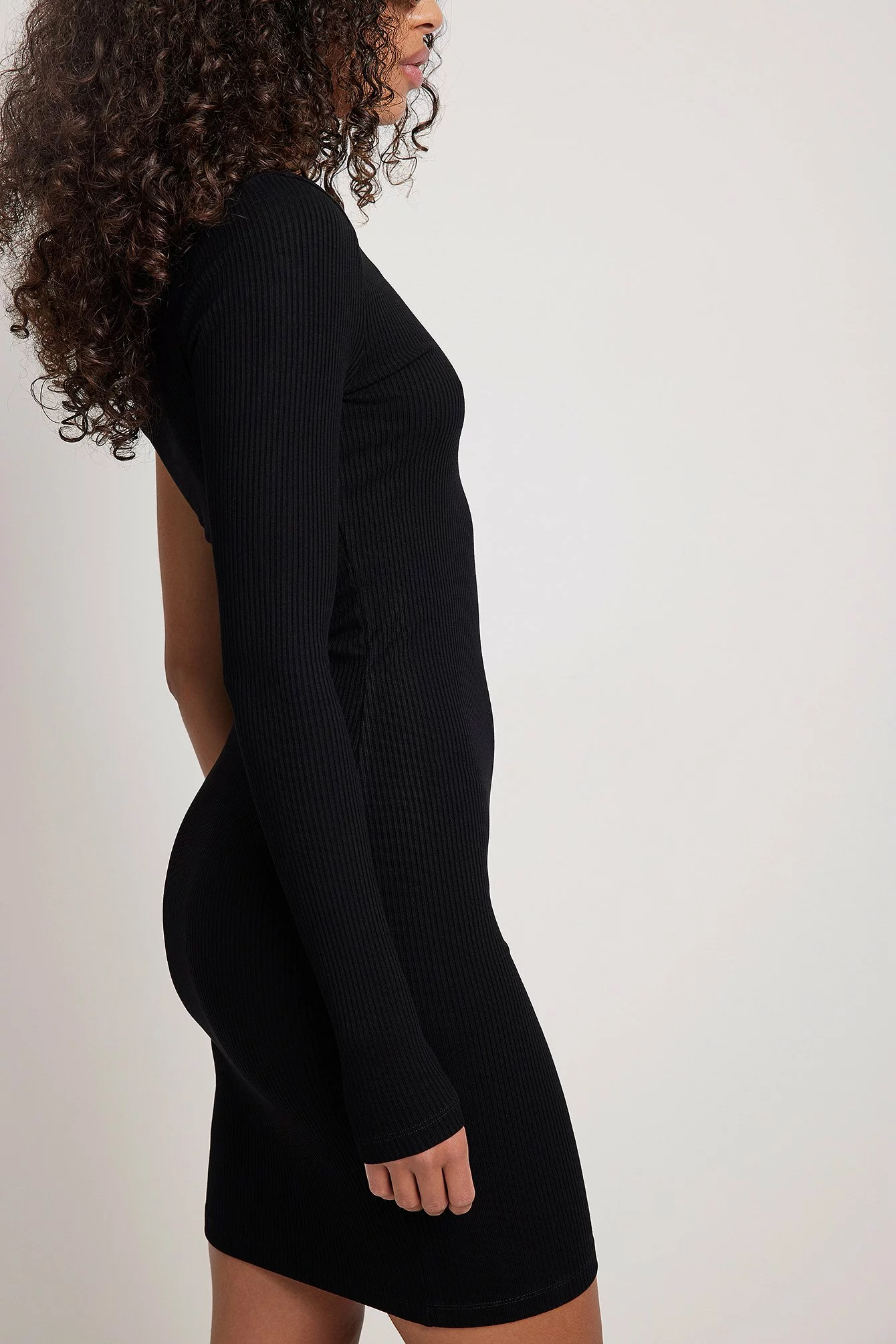 This mini dress features a one shoulder design with a long sleeve, a bodycon fit and a stretchy, ribbed material.