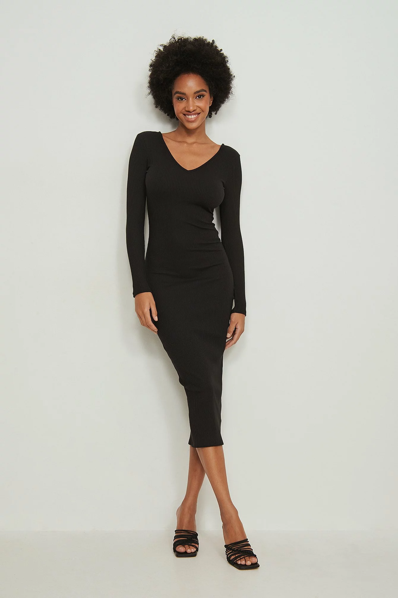 This midi dress features a V-neck with a v backline. It has long sleeves and a rib design. This midi dress features tight fit.
