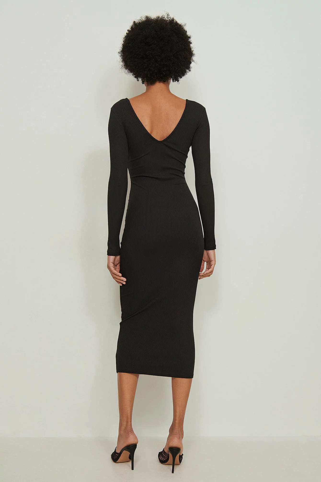 This midi dress features a V-neck with a v backline. It has long sleeves and a rib design. This midi dress features tight fit.