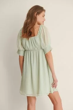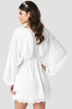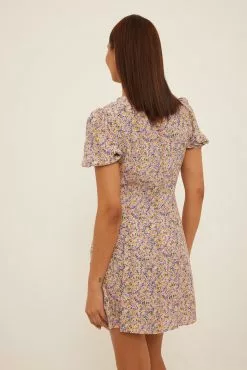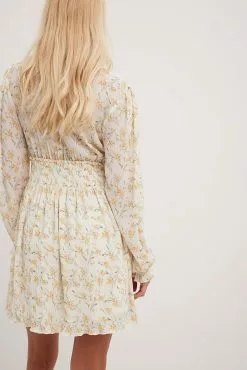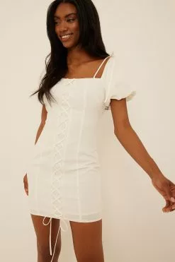 This mini dress features a bandeau design. It has an inner silicone trim on the chest and a button detail down the front. This mini dress features a smocking on the back, a lace dress, a frill skirt and a lining.