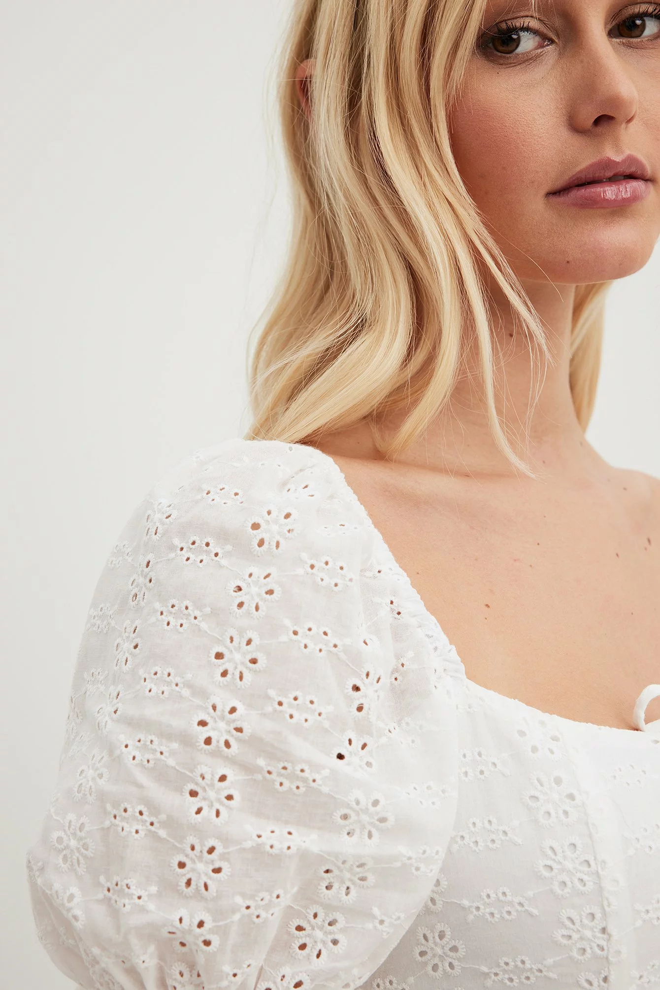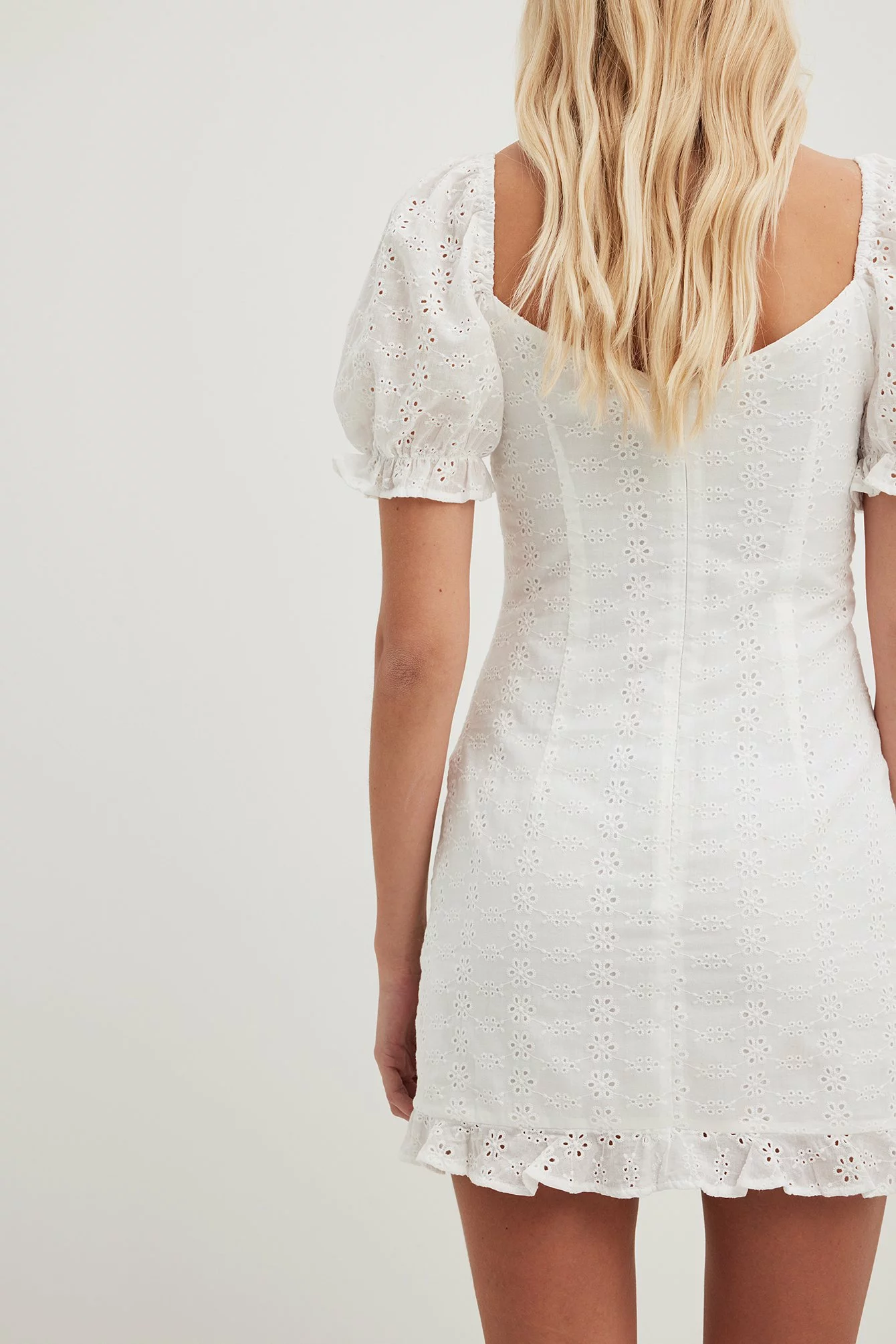 This mini dress is ruched and features broderie anglaise. It has a square neckline with a lace up design and short sleeves. This mini dress features a back zip closure.