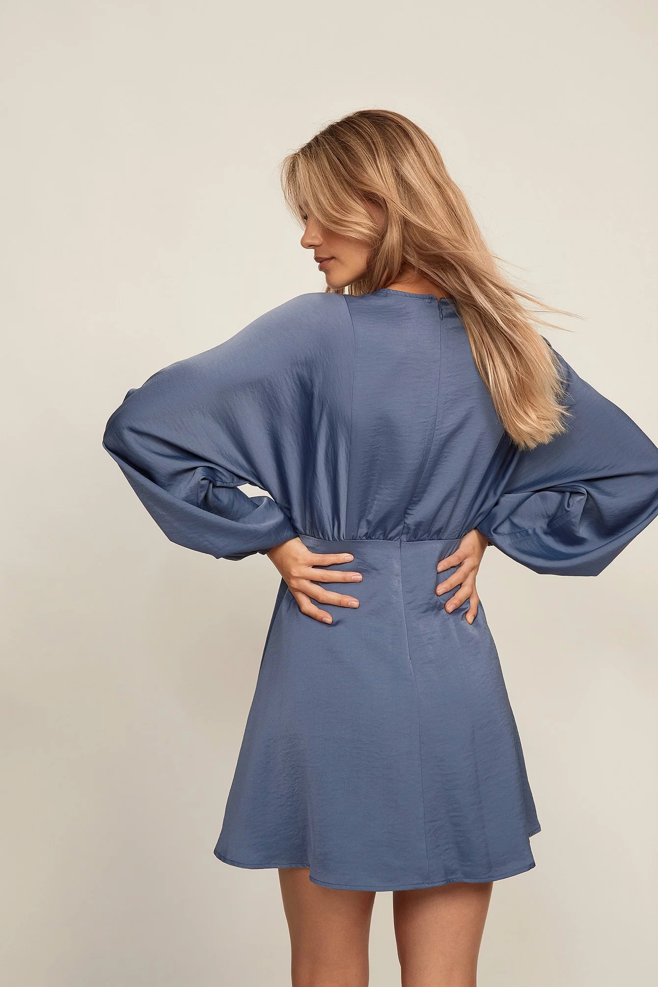This dress features long balloon sleeves, a mini length, a flowy fit, a rounded neckline, a zipper closure at the back and underlining.