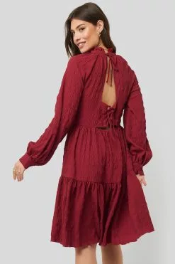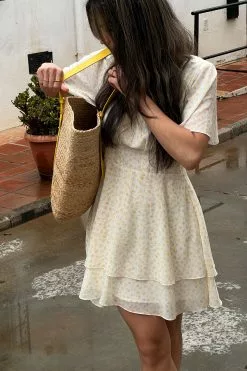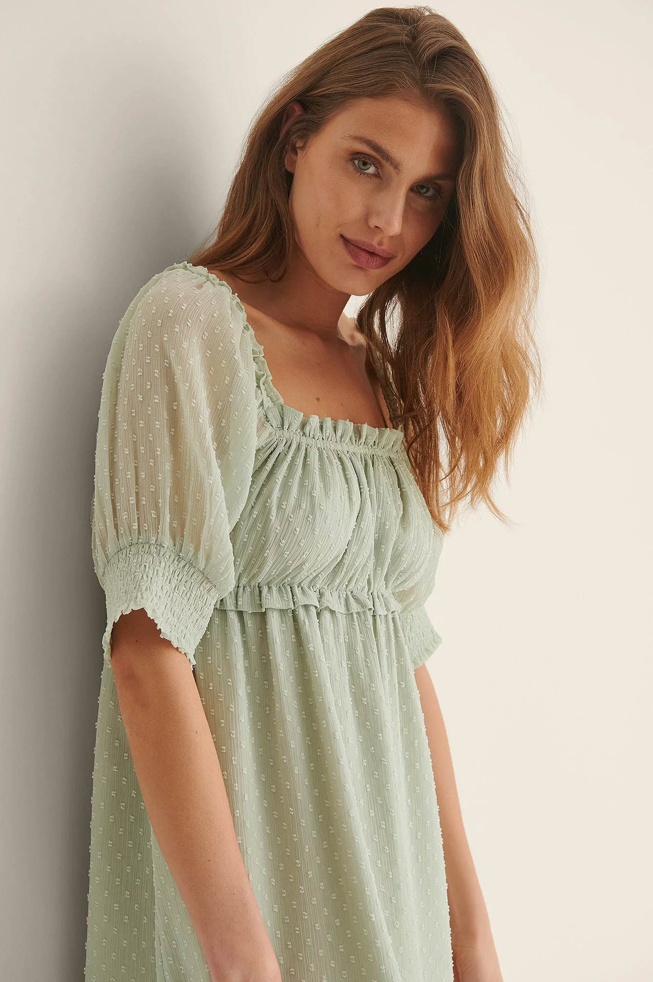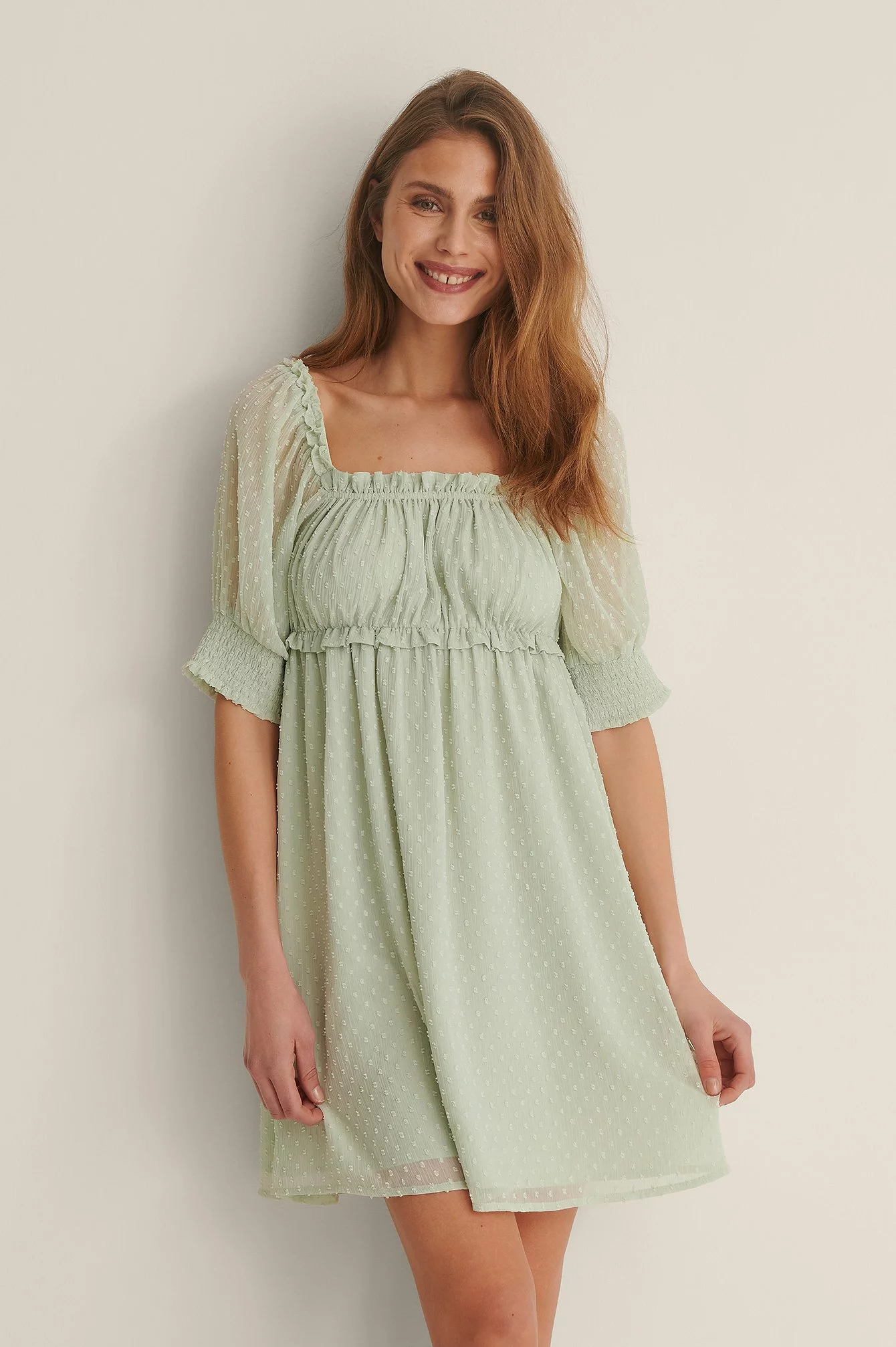 This mini dress features short sleeves with a smocked band, an elasticized waist, frill details, a flowy fit and underlining.