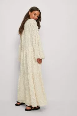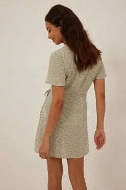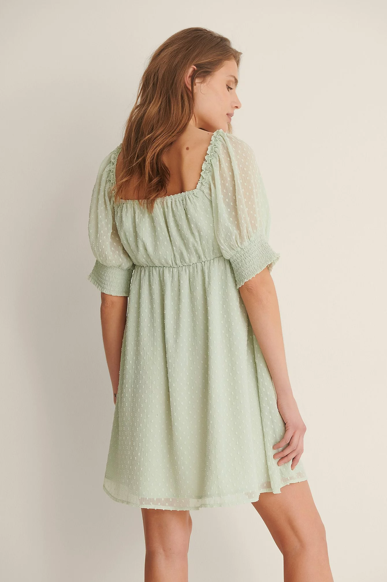 This mini dress features short sleeves with a smocked band, an elasticized waist, frill details, a flowy fit and underlining.