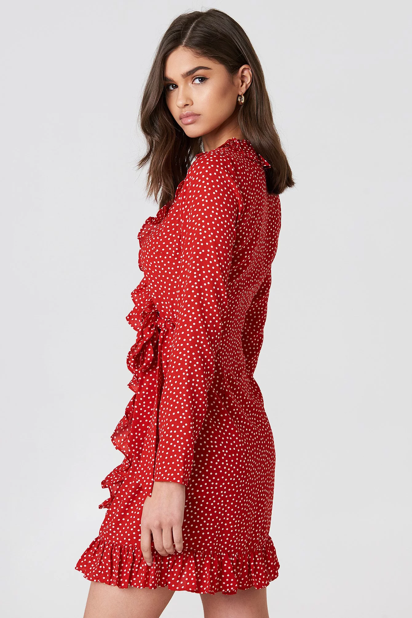 The Dotted Frill Dress by NA-KD Boho features a mini dress with a wrap-around front, frill design at the hems, long sleeve and a self-tie waist and is unlined.