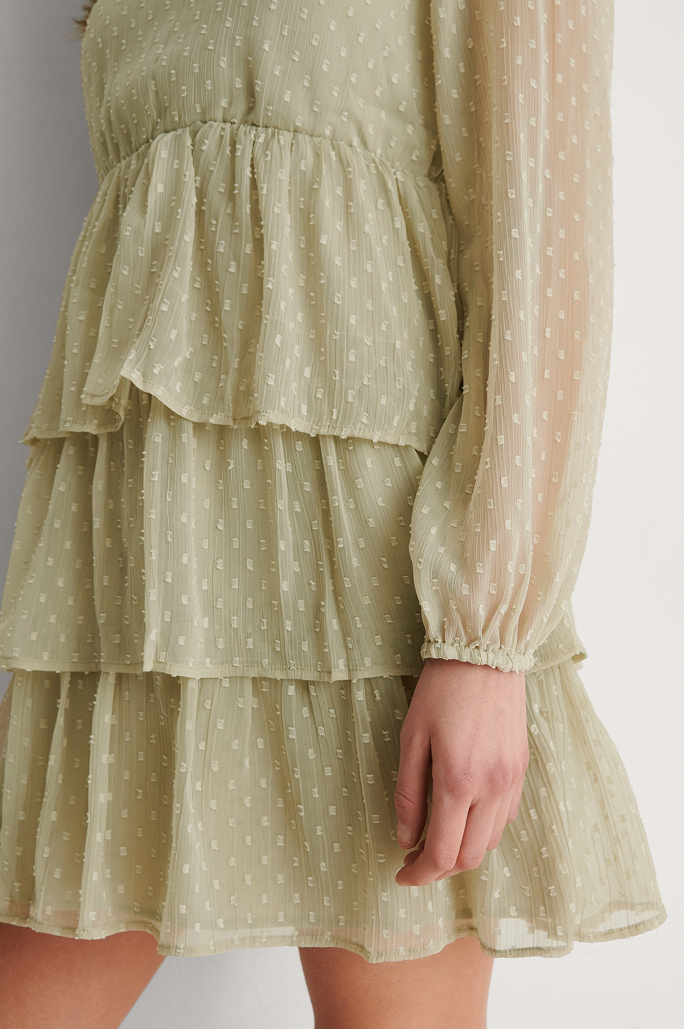 This dress features a round neck with one button closure behind the neck, slightly transparent long sleeves, an elasticized waist, flounced details and a mini length.