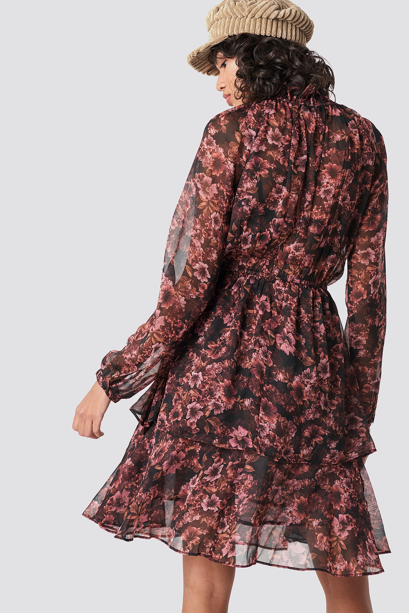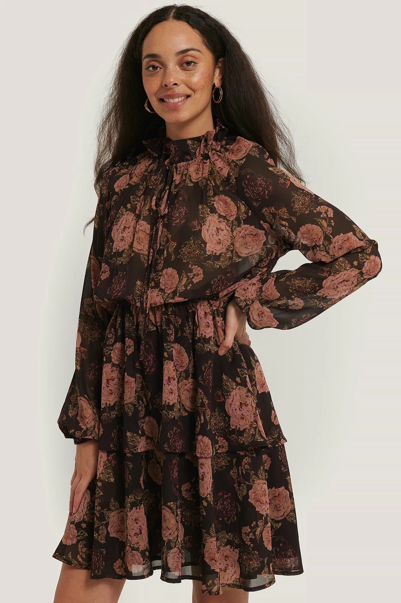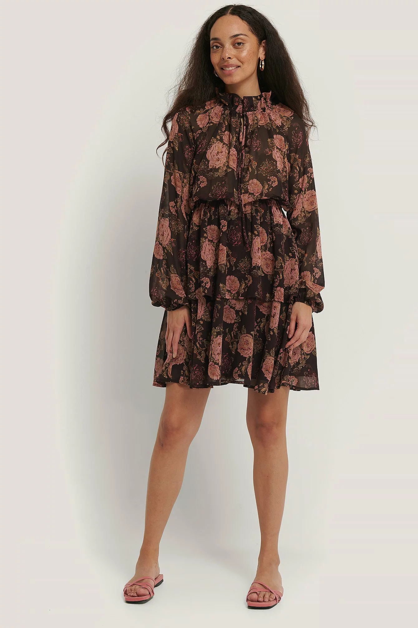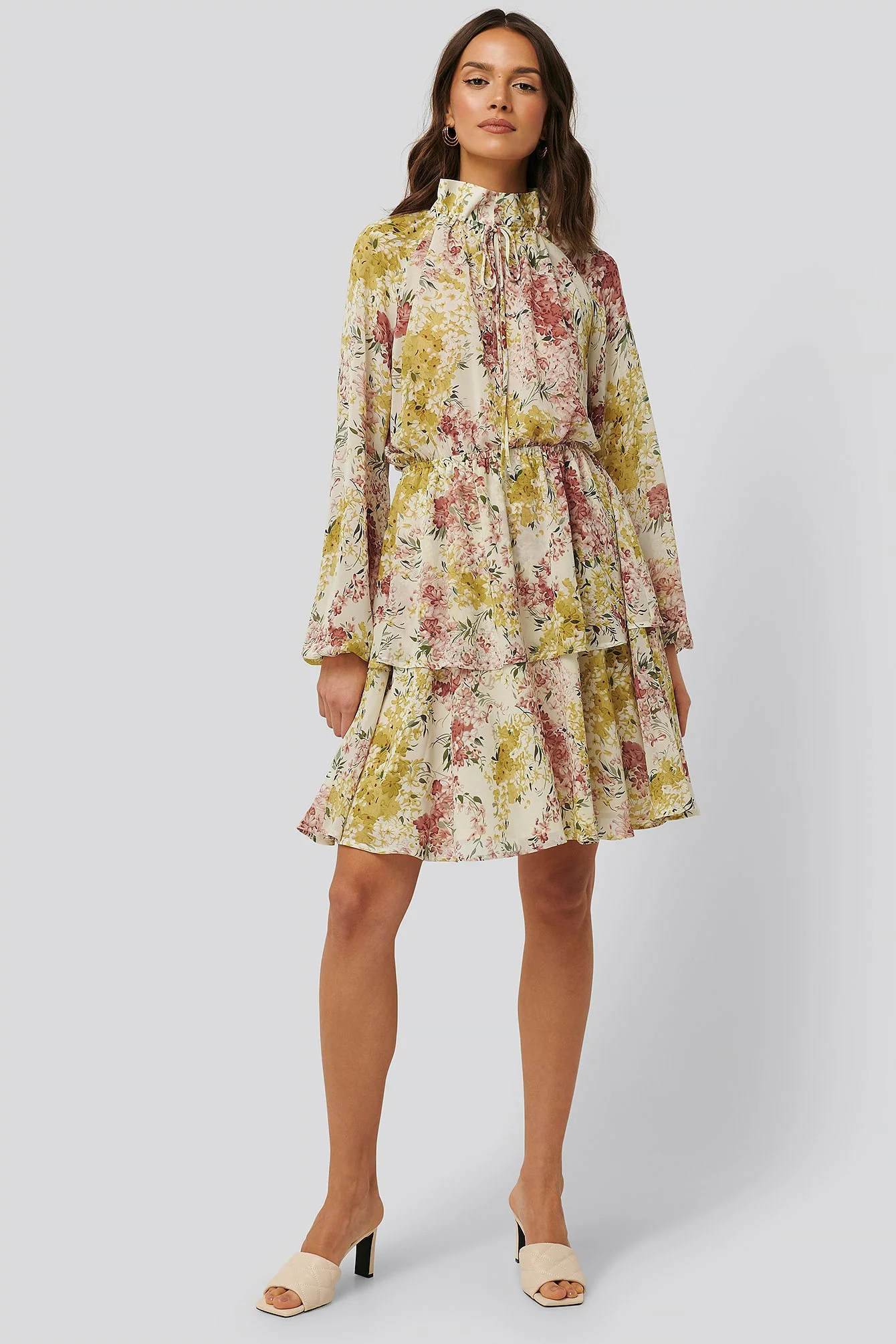 The High Frill Neck Dress by NA-KD Boho features a drawstring frill neckline with two straps that can be tied or hung loosely, a drawstring waistline for a flattering fit, long sleeves with buttoned cuffs and a triple layered skirt. Cut from a sheer woven fabric.
