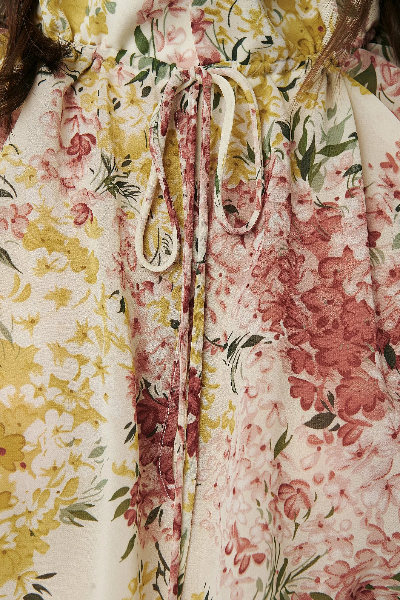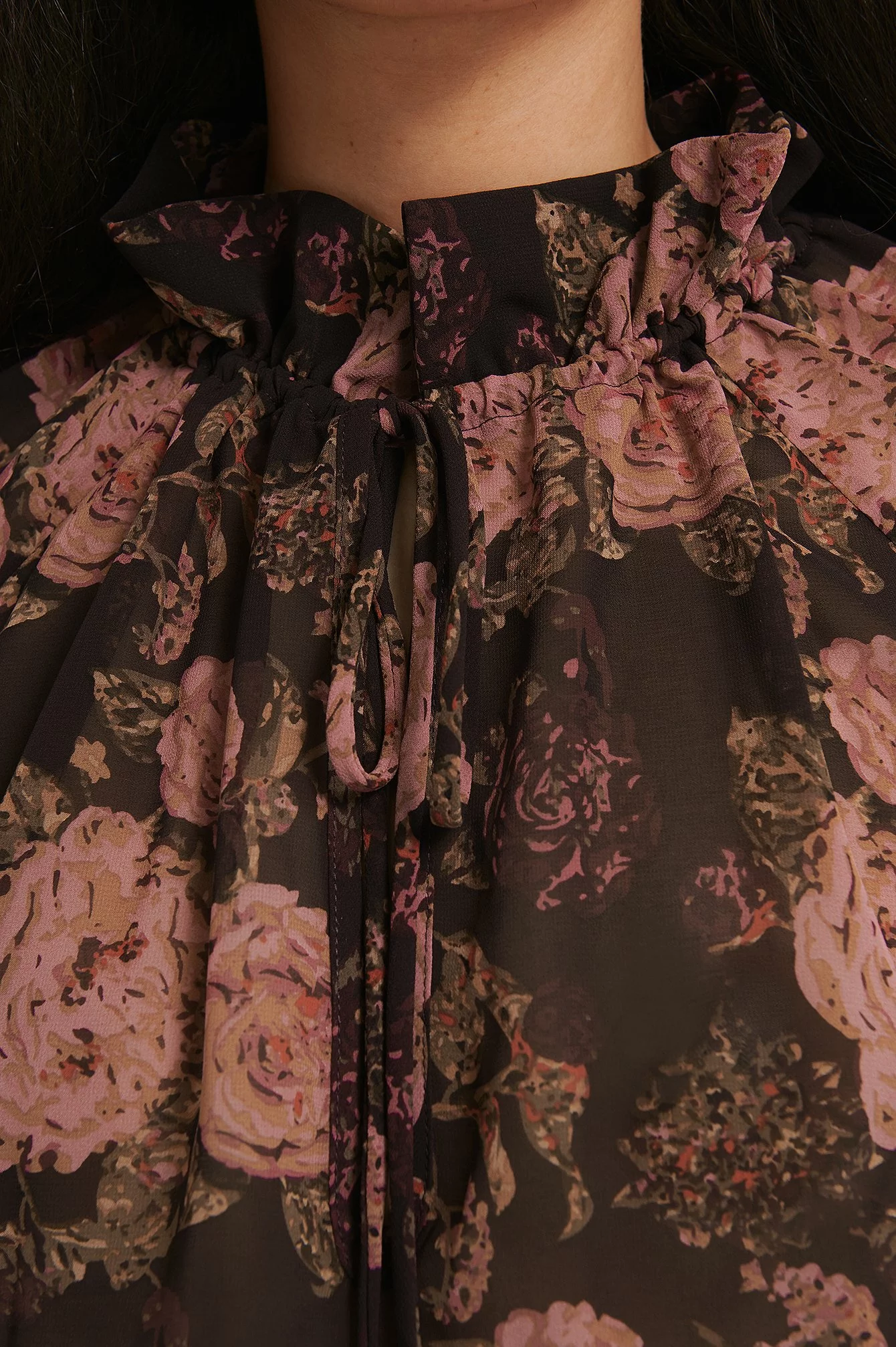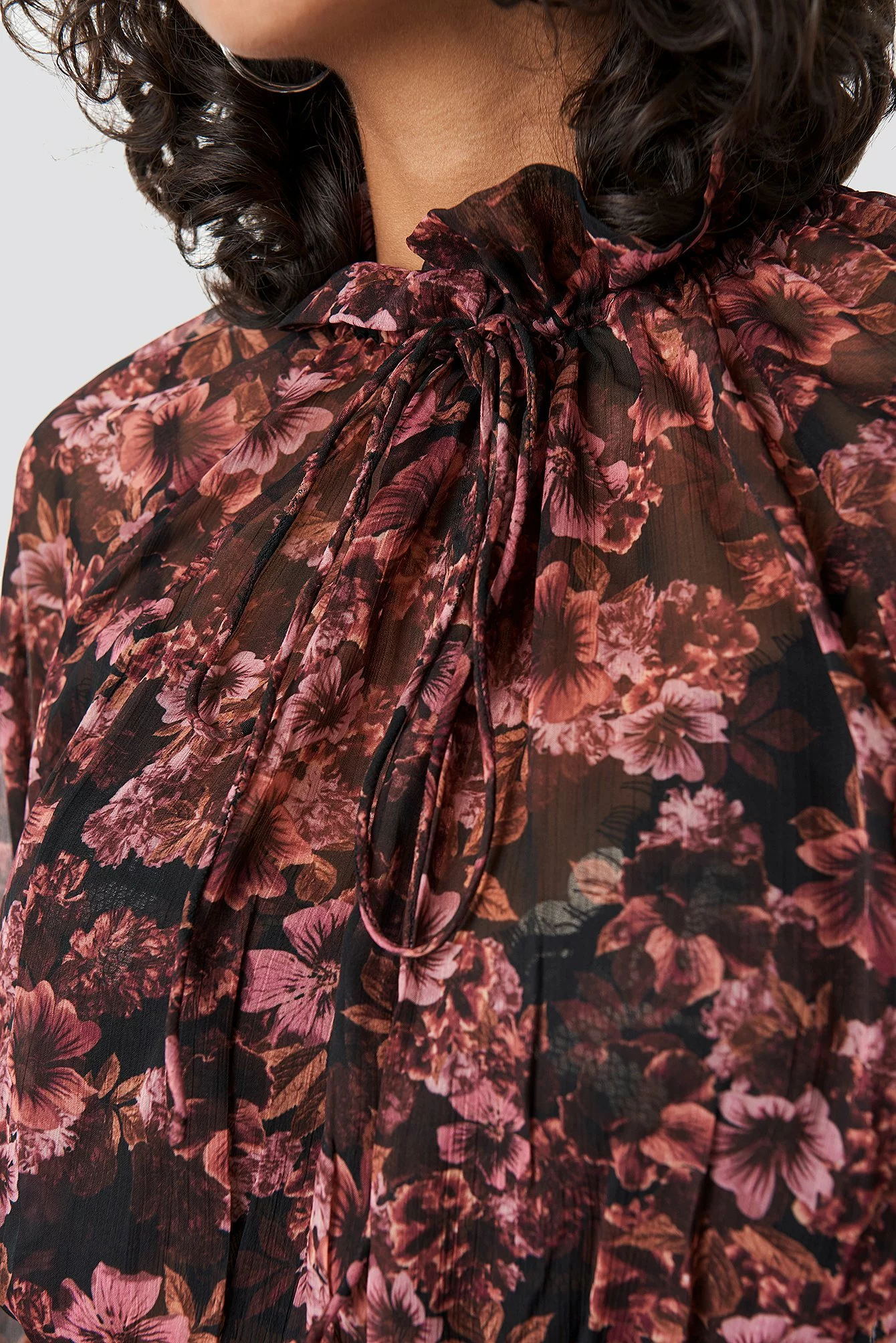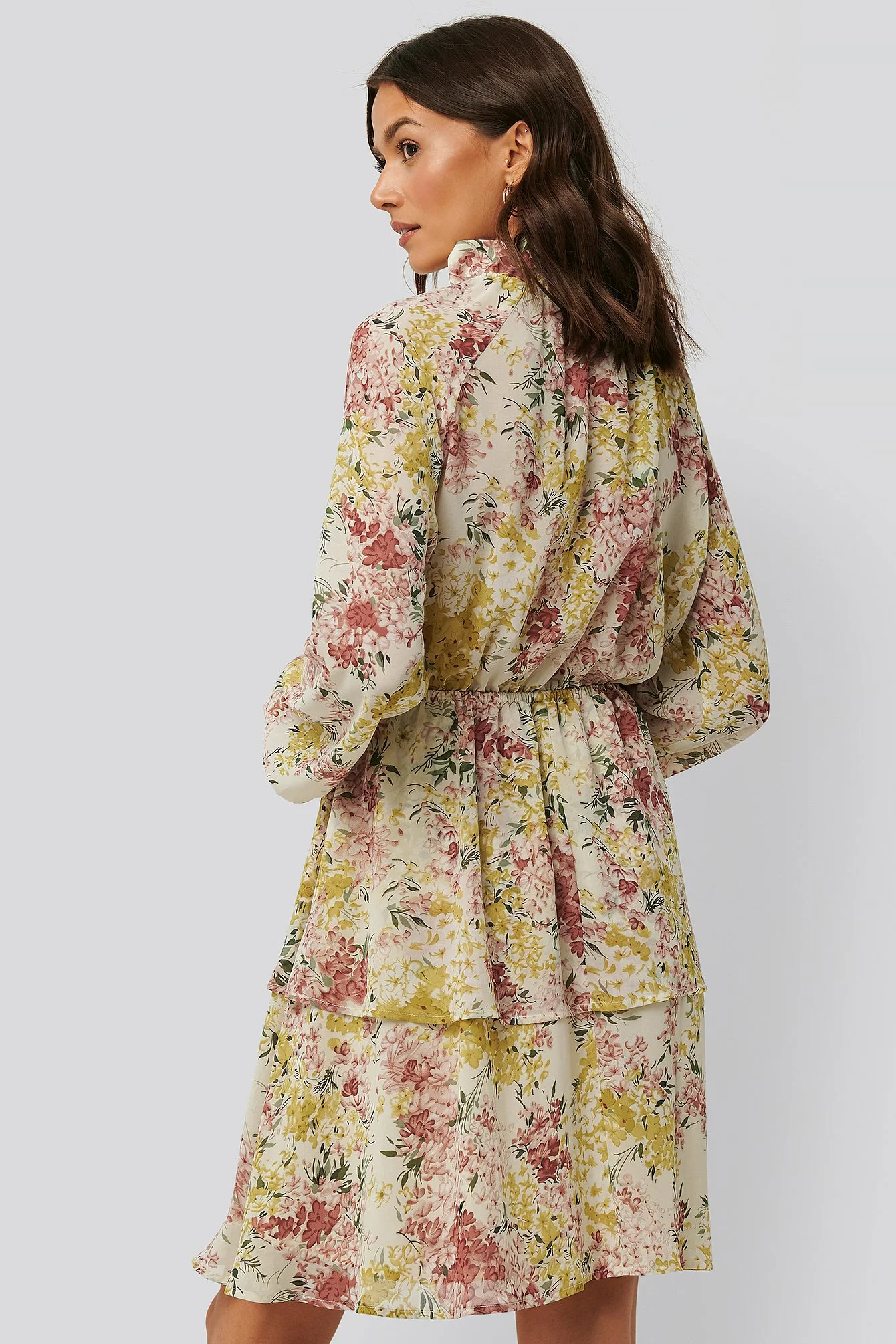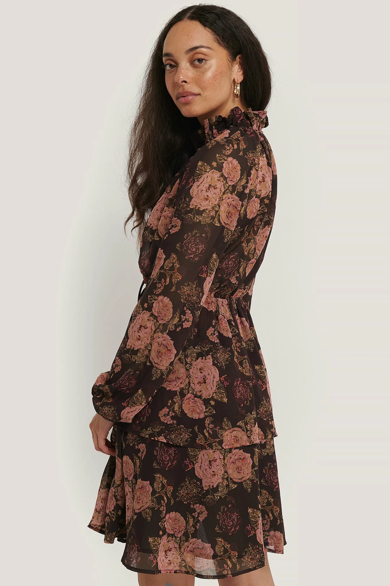 The High Frill Neck Dress by NA-KD Boho features a drawstring frill neckline with two straps that can be tied or hung loosely, a drawstring waistline for a flattering fit, long sleeves with buttoned cuffs and a triple layered skirt. Cut from a sheer woven fabric.