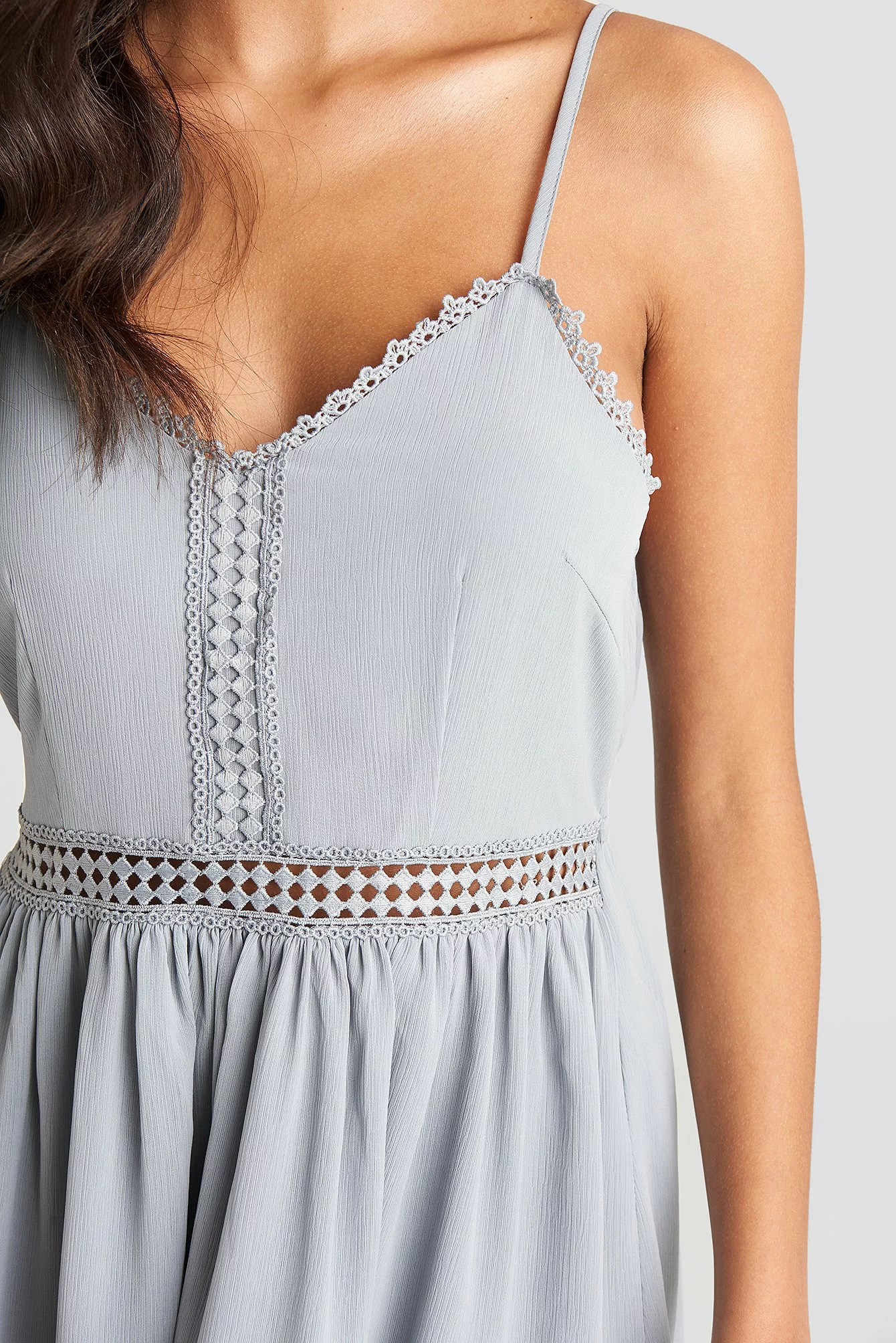 This dress features a mini length, embroidered details, a lace trim and adjustable shoulder straps.