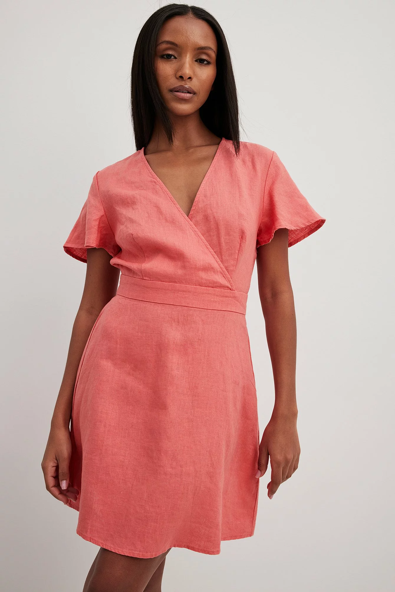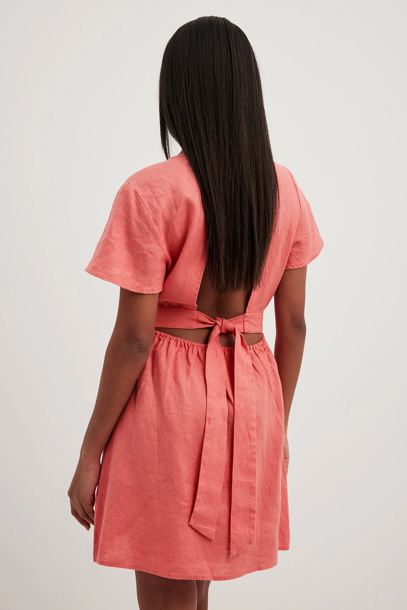 This mini dress is made of linen and features a flowy fit. It has a v neckline with an overlap detail and an open back design with a self-tie knot, a button closure at the back of the neck and an elasticized seam.