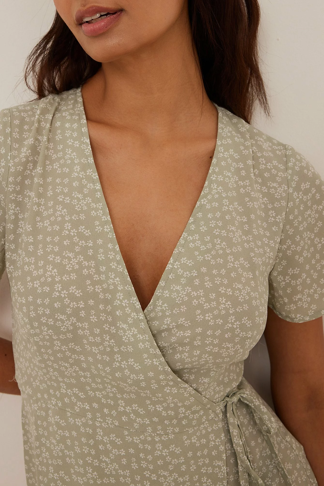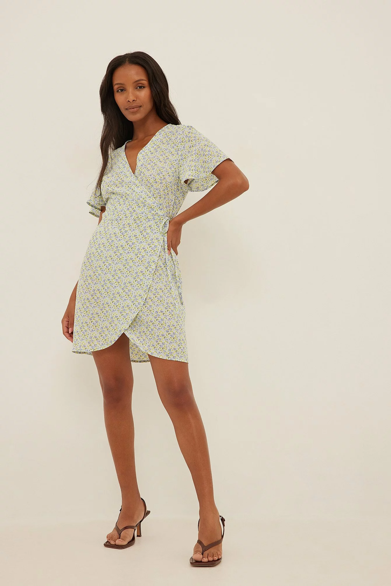 This mini dress features short sleeves and a wrap design with a self-tie.