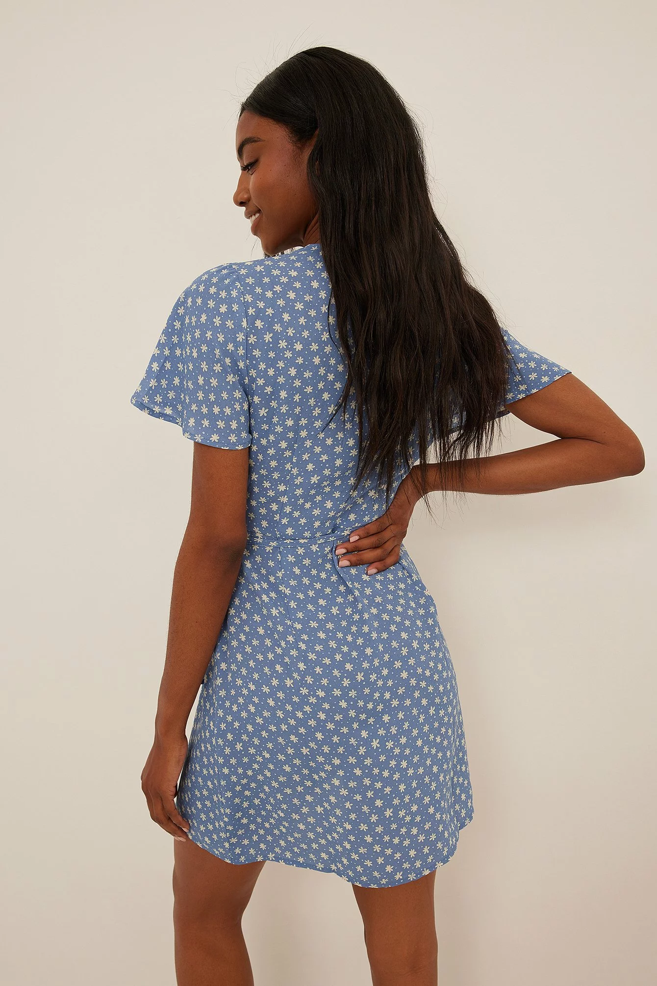 This mini dress features short sleeves and a wrap design with a self-tie.