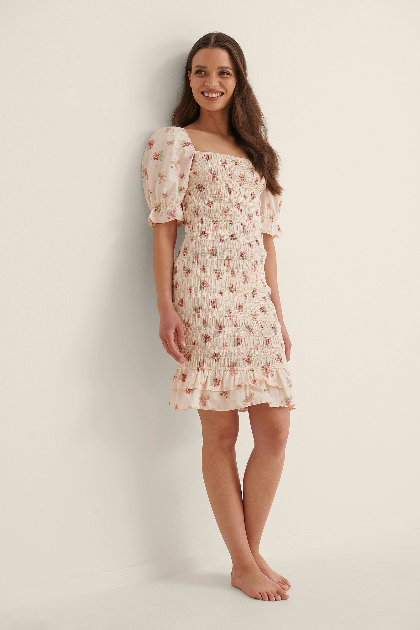This dress features a squared neckline. It has puffy short sleeves with elasticized cuffs and a smocked design. This dress features frill details at the bottom and a mini length.