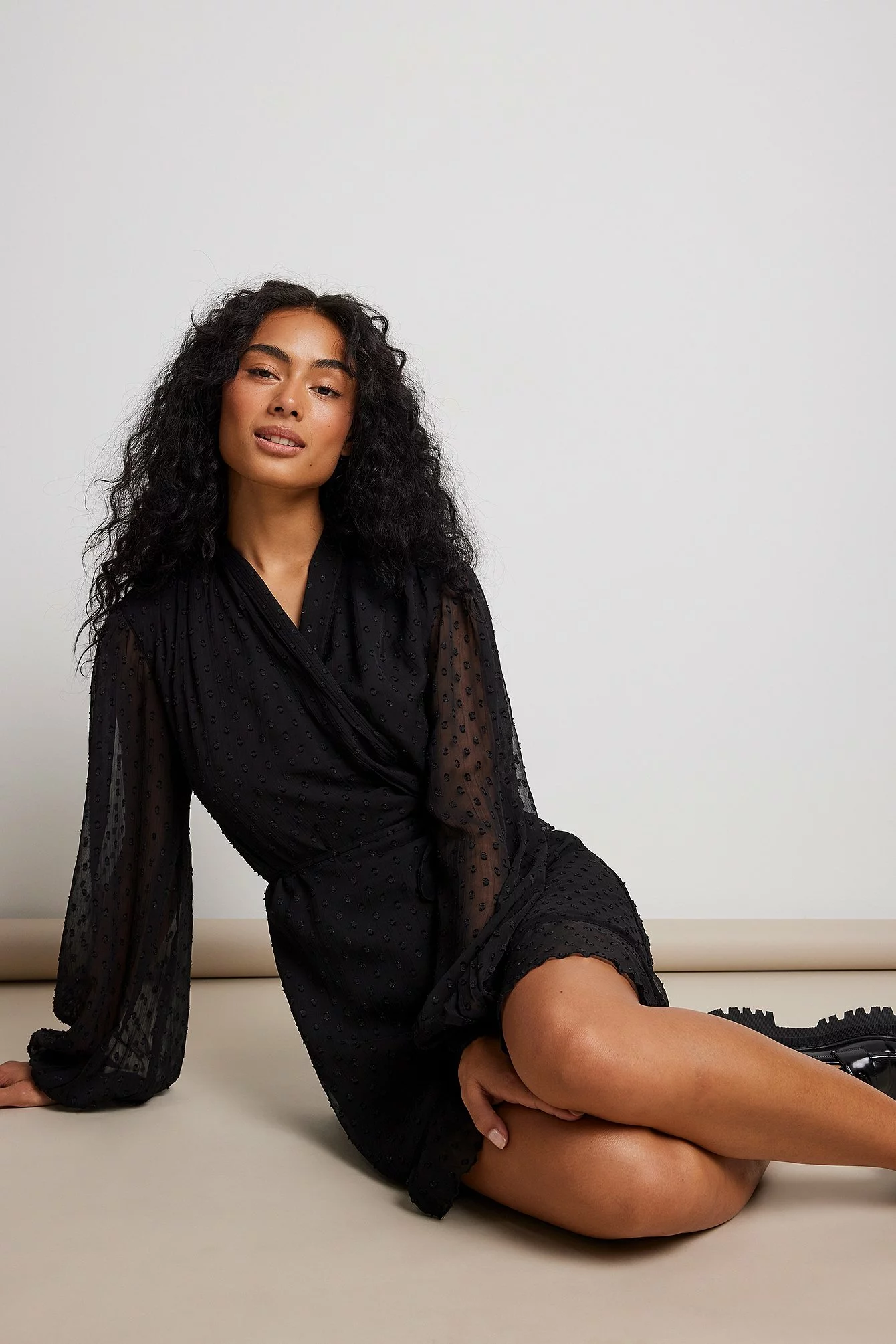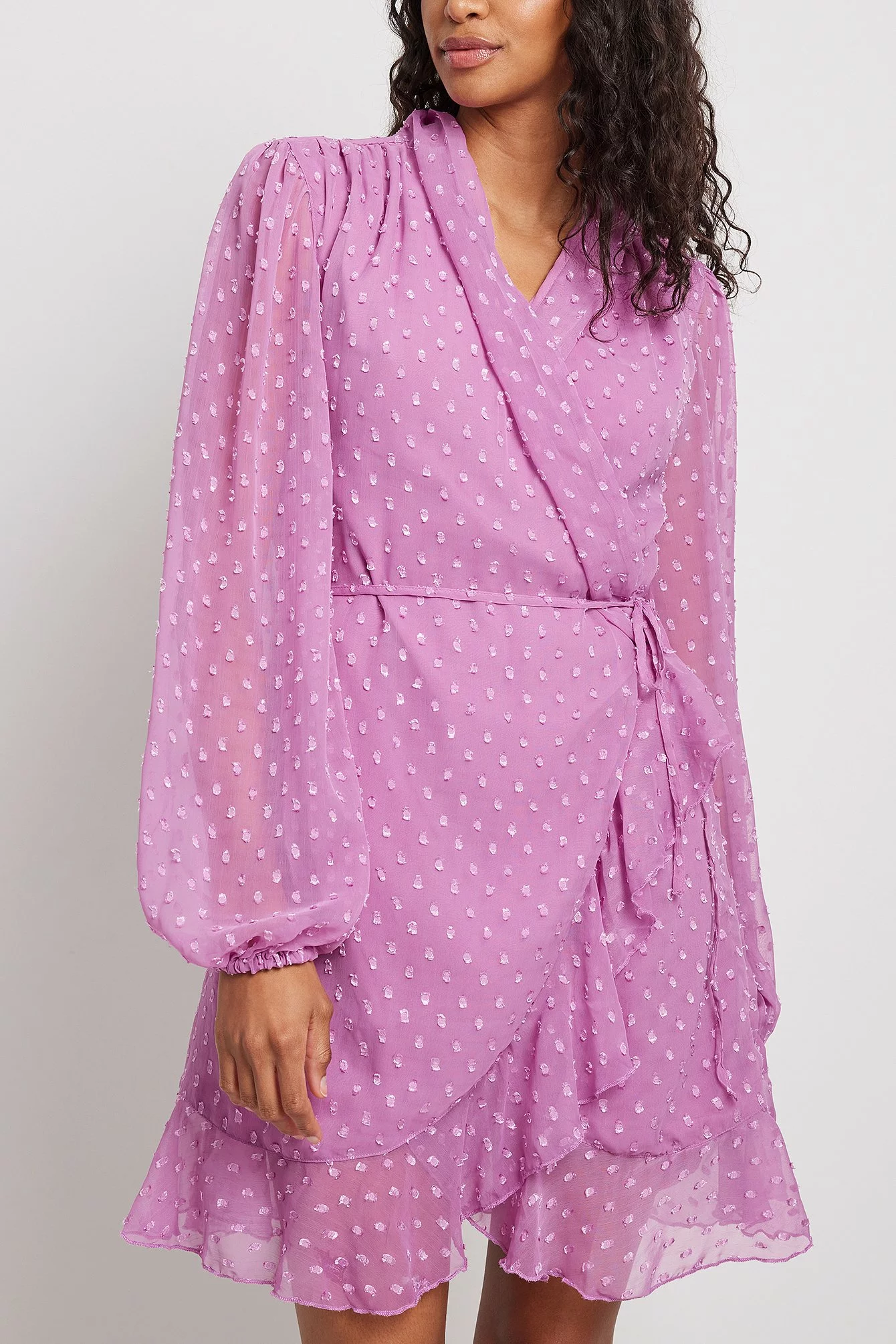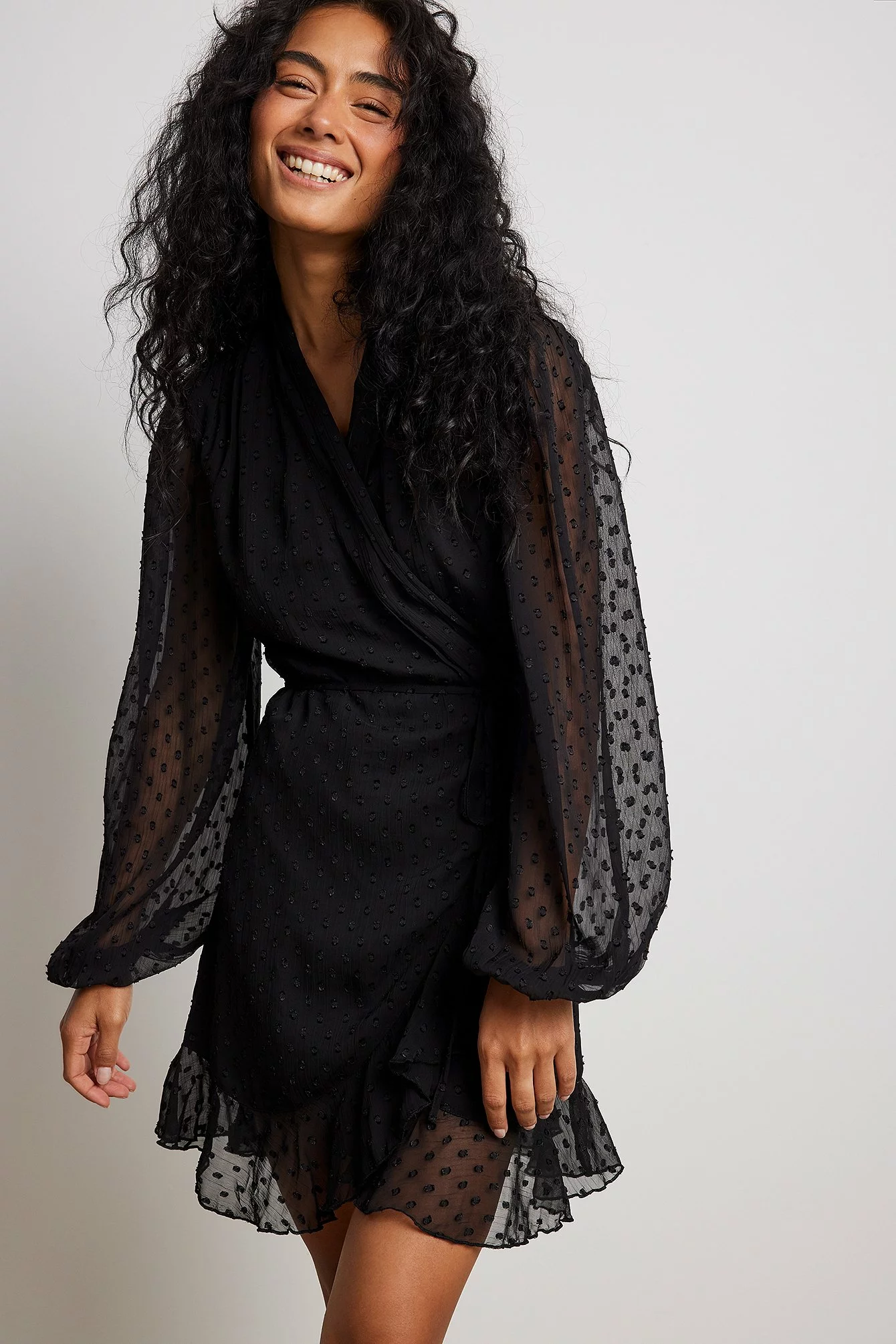 This mini dress features long sleeves with gathering at the shoulders and gathered elasticized cuffs, a wrap front with a self tie closure, frills at the hems and a chiffon material with dotted pattern and lining.