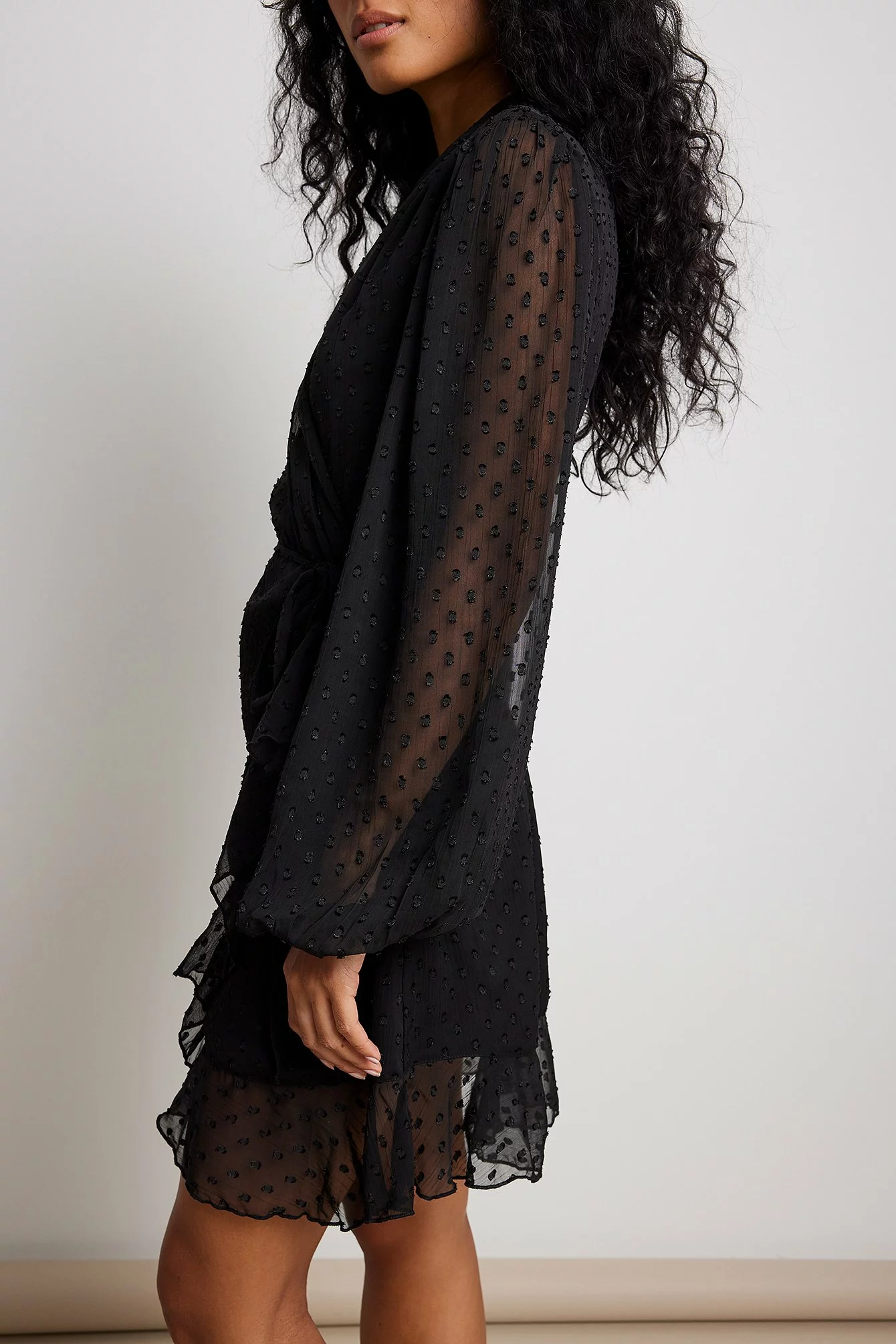 This mini dress features long sleeves with gathering at the shoulders and gathered elasticized cuffs, a wrap front with a self tie closure, frills at the hems and a chiffon material with dotted pattern and lining.