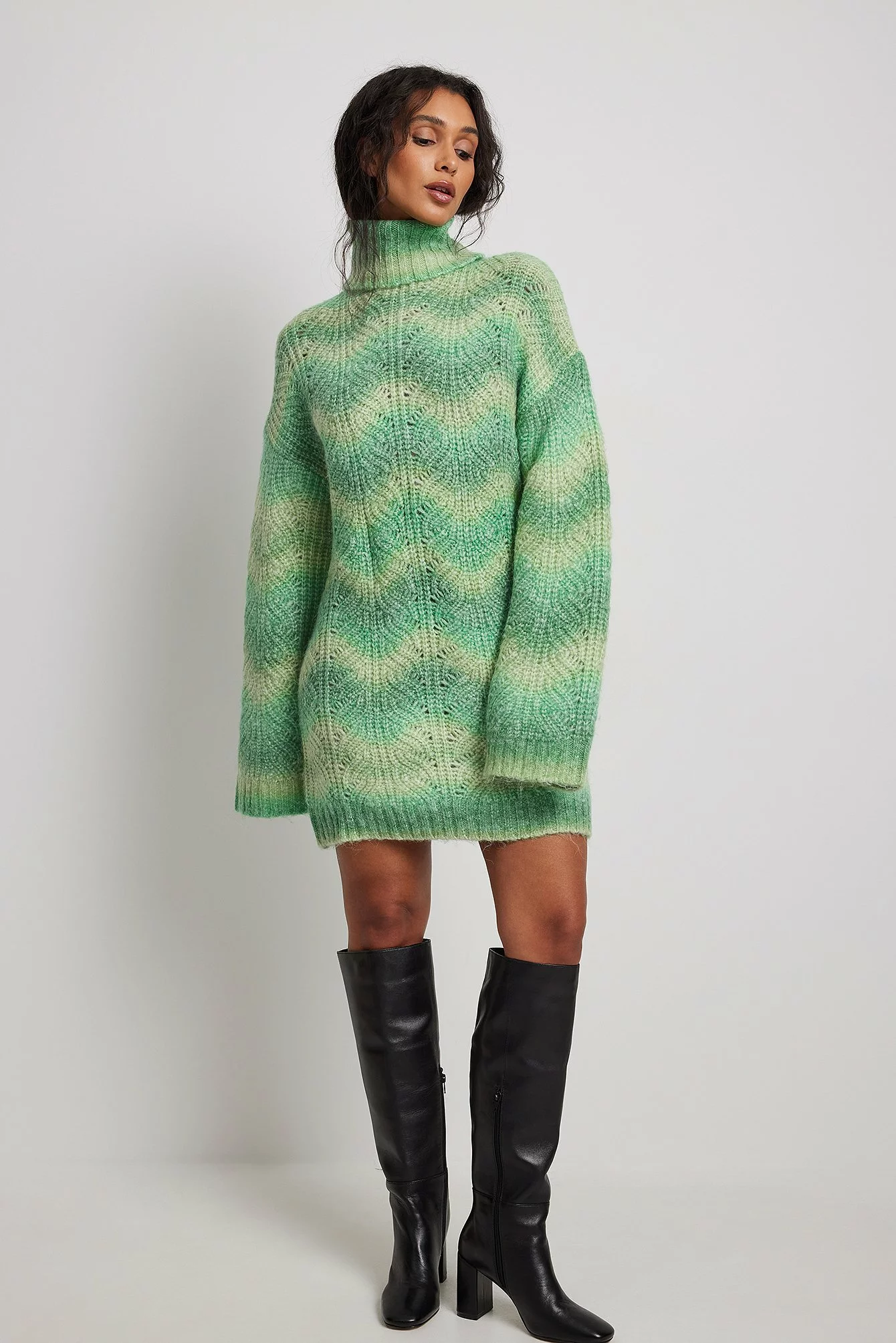 This knit sweater is long and features long sleeves. It has a turtleneck and oversize fit. 58%, 29% Acrylic, 9% Polyester, 4% Polyamide Wool.