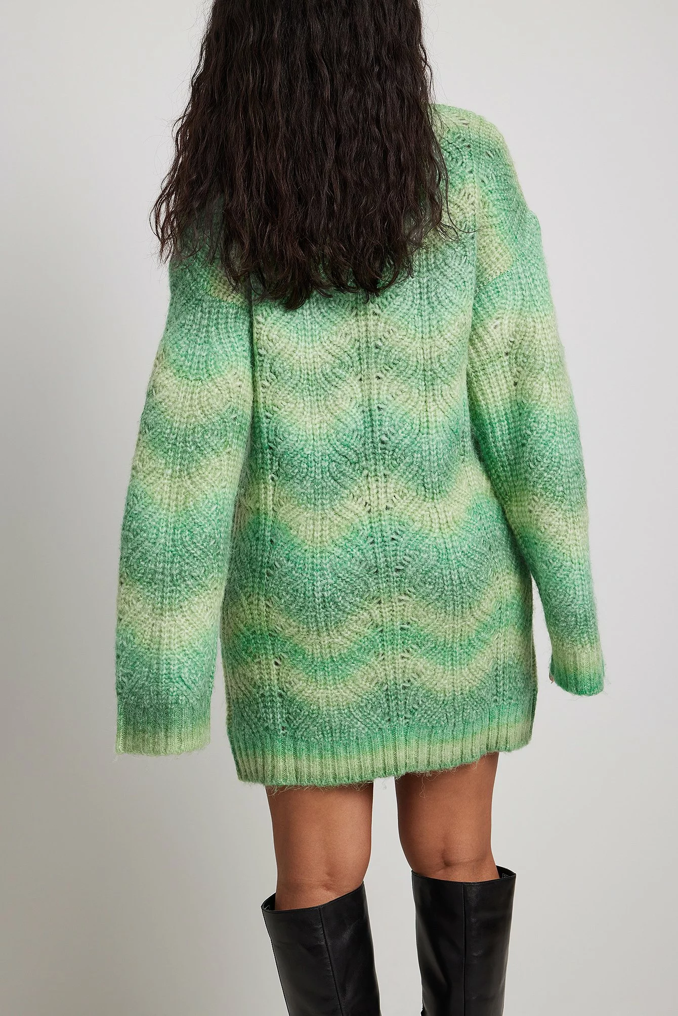 This knit sweater is long and features long sleeves. It has a turtleneck and oversize fit. 58%, 29% Acrylic, 9% Polyester, 4% Polyamide Wool.