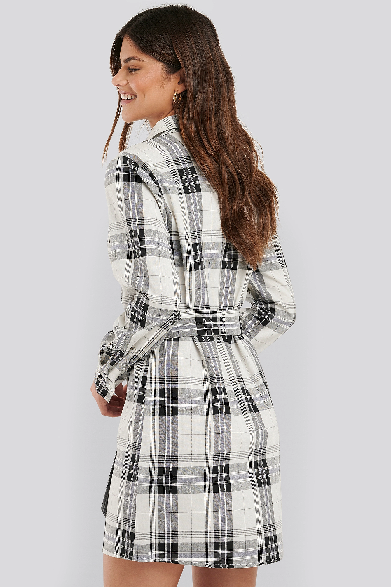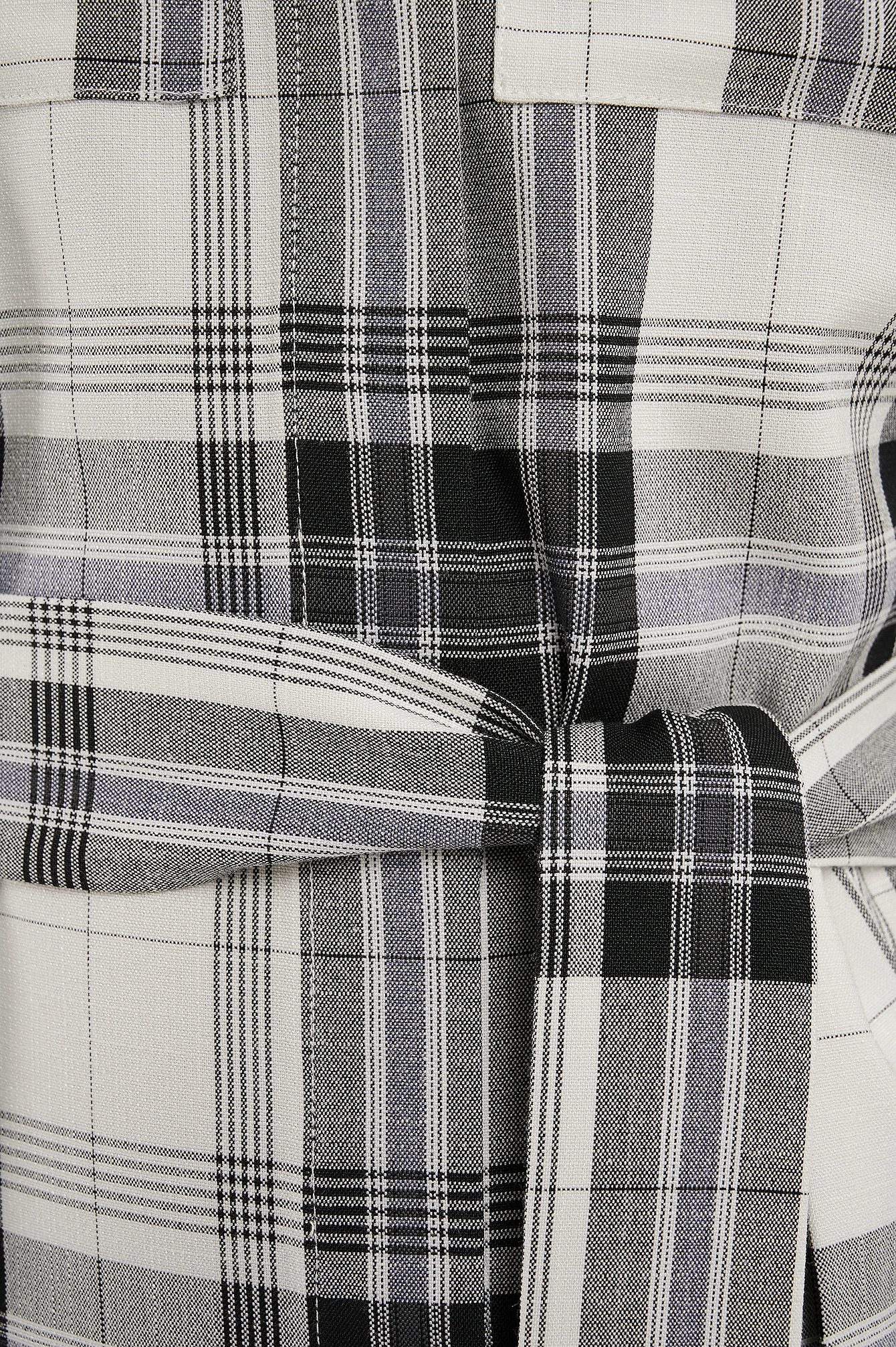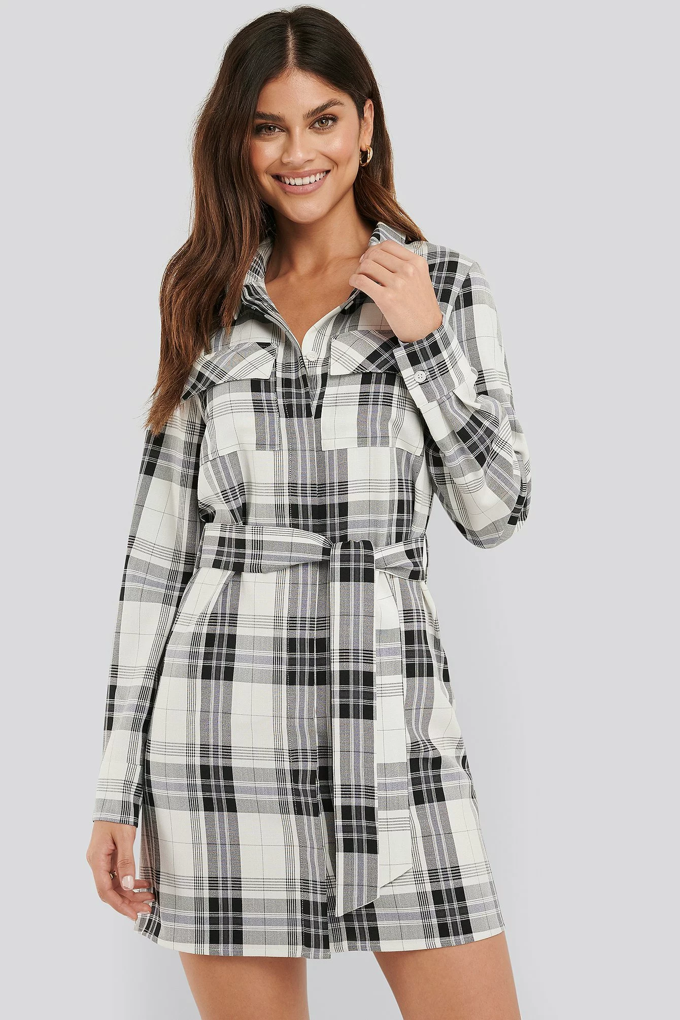 This mini dress features a classic collar, two front pockets, long sleeves with single button cuffs, button closures down the front and a self tie waist belt.