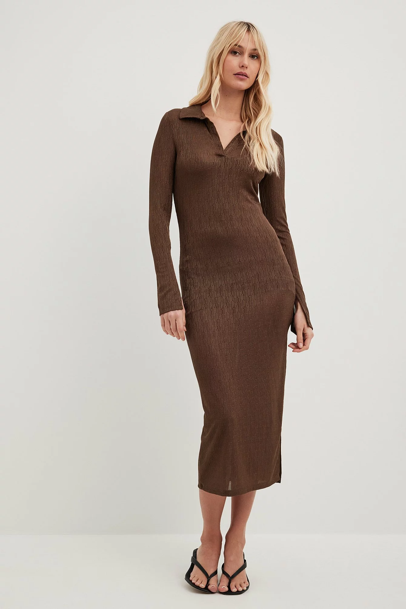 This midi dress is elasticized and features a textured material. It has a bodycon fit and an open collar. This midi dress features long sleeves with a slit detail and a side slit.