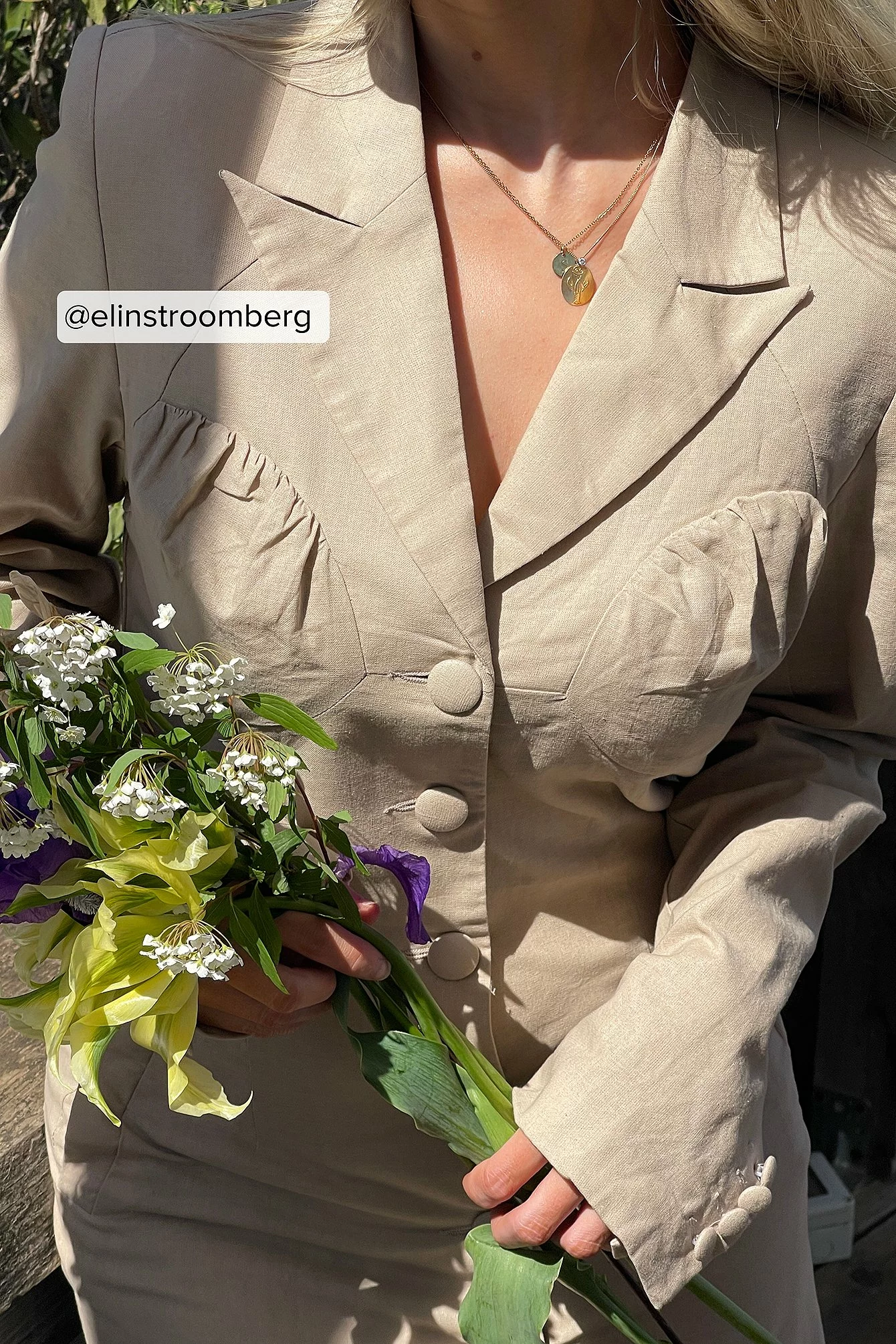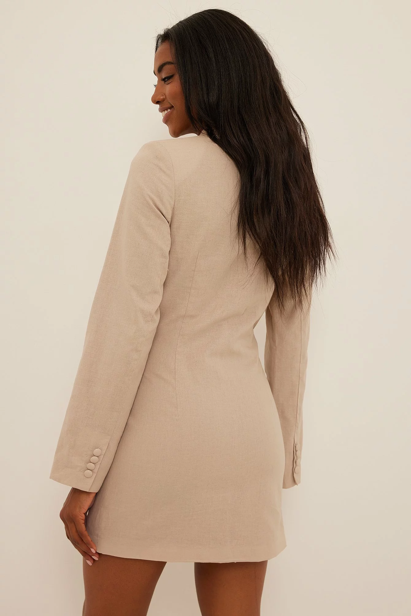 This mini dress features a lapel neckline, ruched cup details on the chest, padded shoulders, long sleeves with button cuffs, button closure down the front and mock pockets on the front.