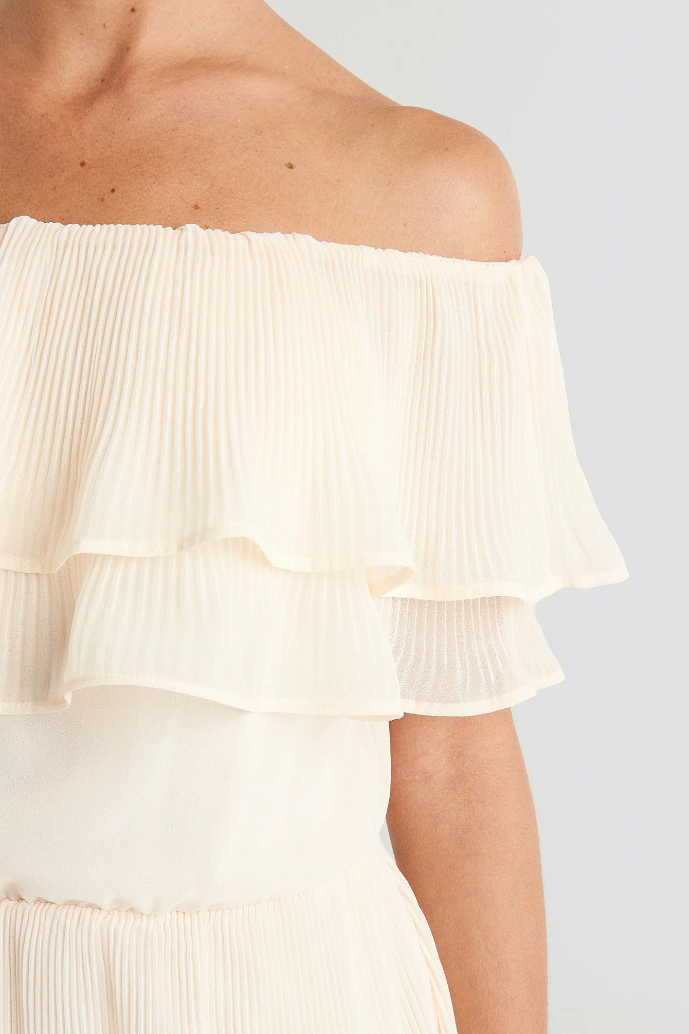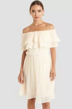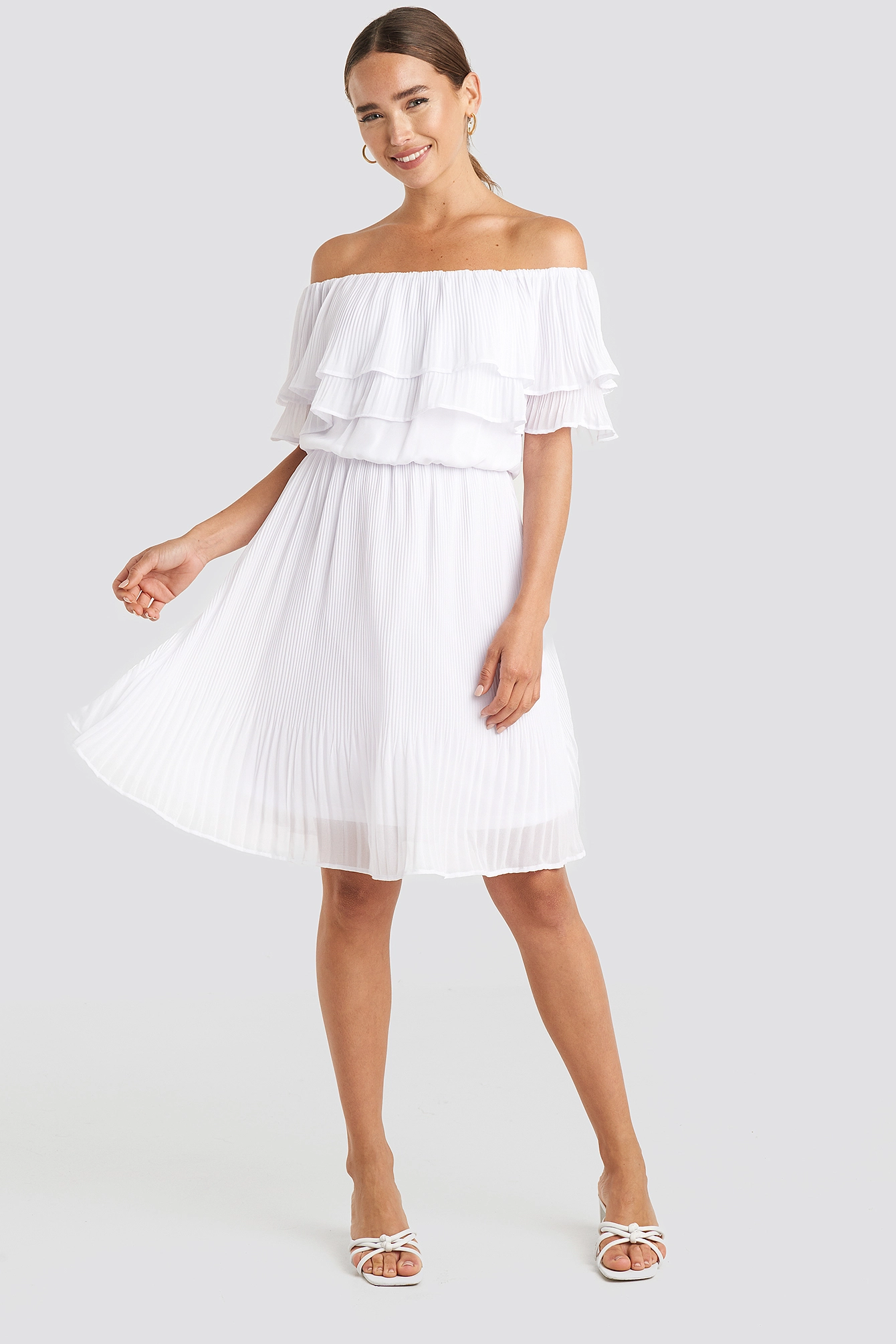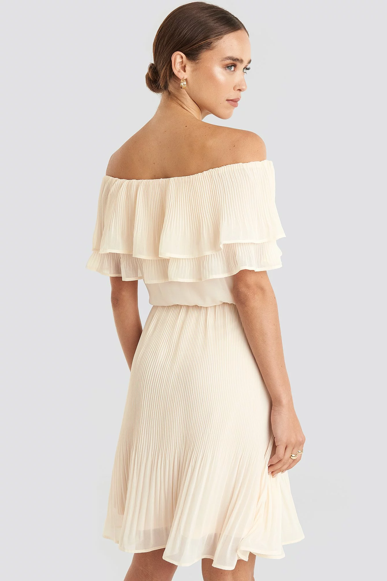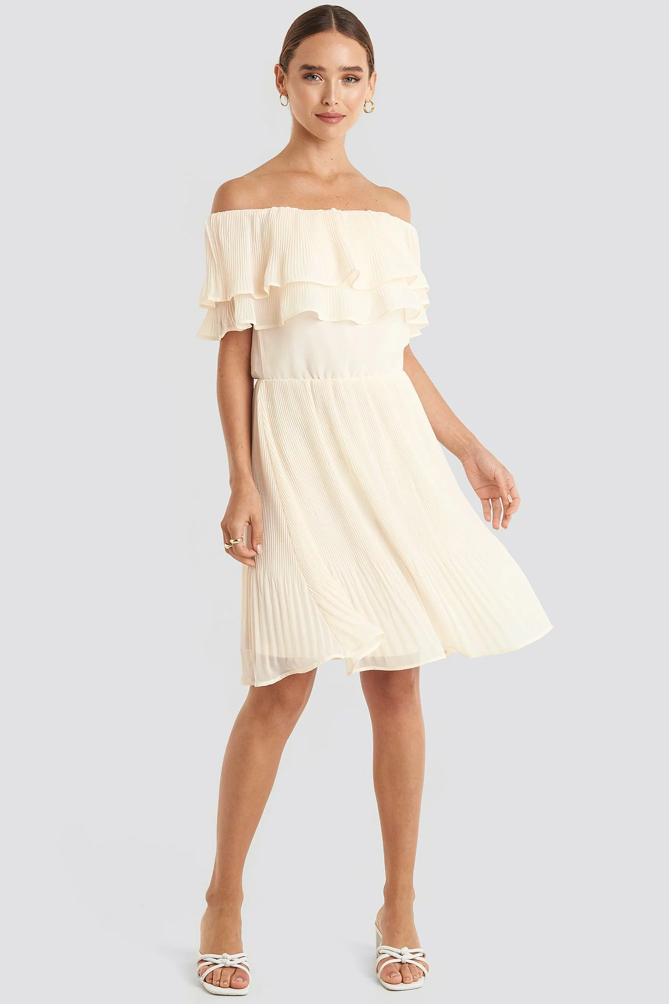 This dress features a mini length, a layered off shoulder design, a pleated material, a flounced detail on the bottom and an elasticized waistband. This product is big in size, we recommend you to choose a size smaller than your usual.