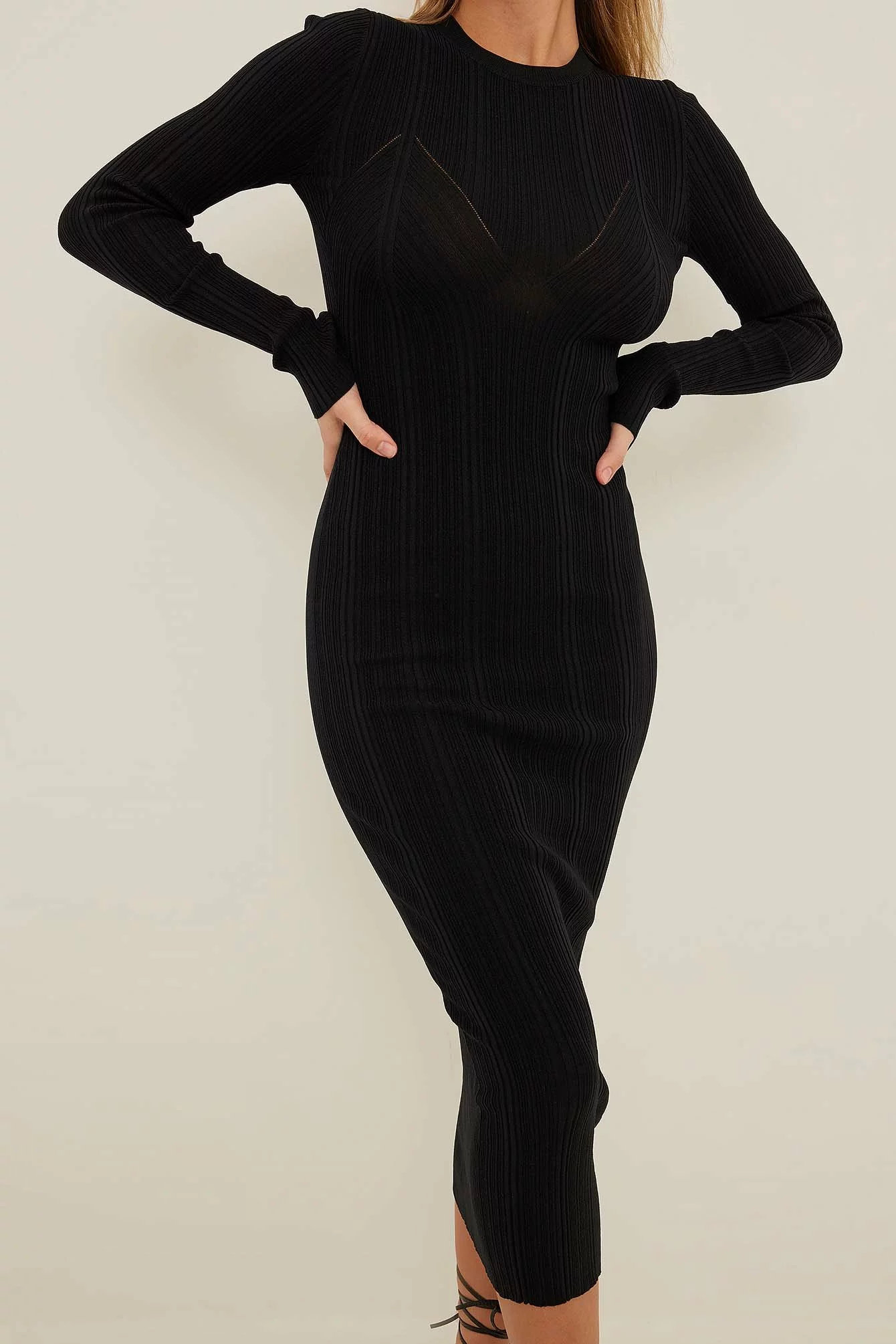 This midi dress is knitted, ribbed and stretchy and features a rounded neckline, long sleeves and a cut-out on the back.
