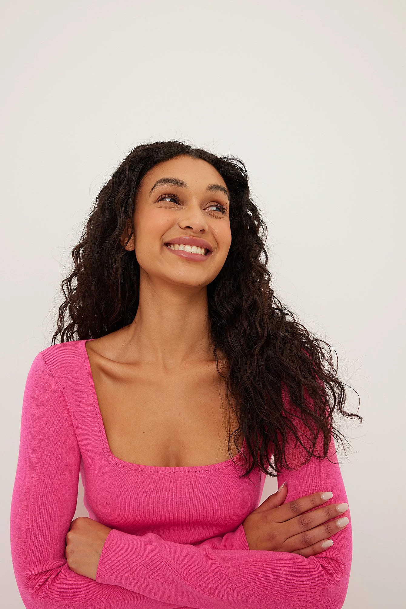 This mini dress features a square neckline, long sleeves and a stretchy material with a fine knit.
