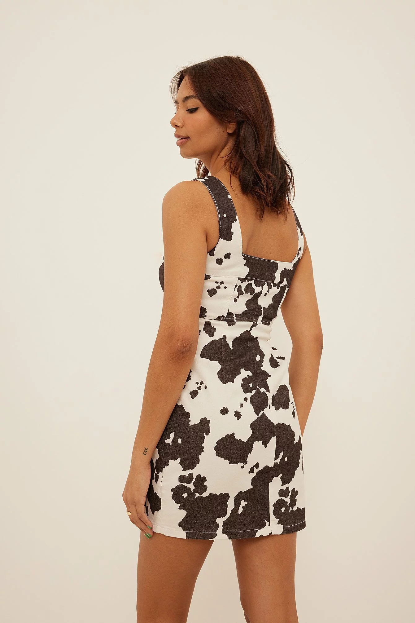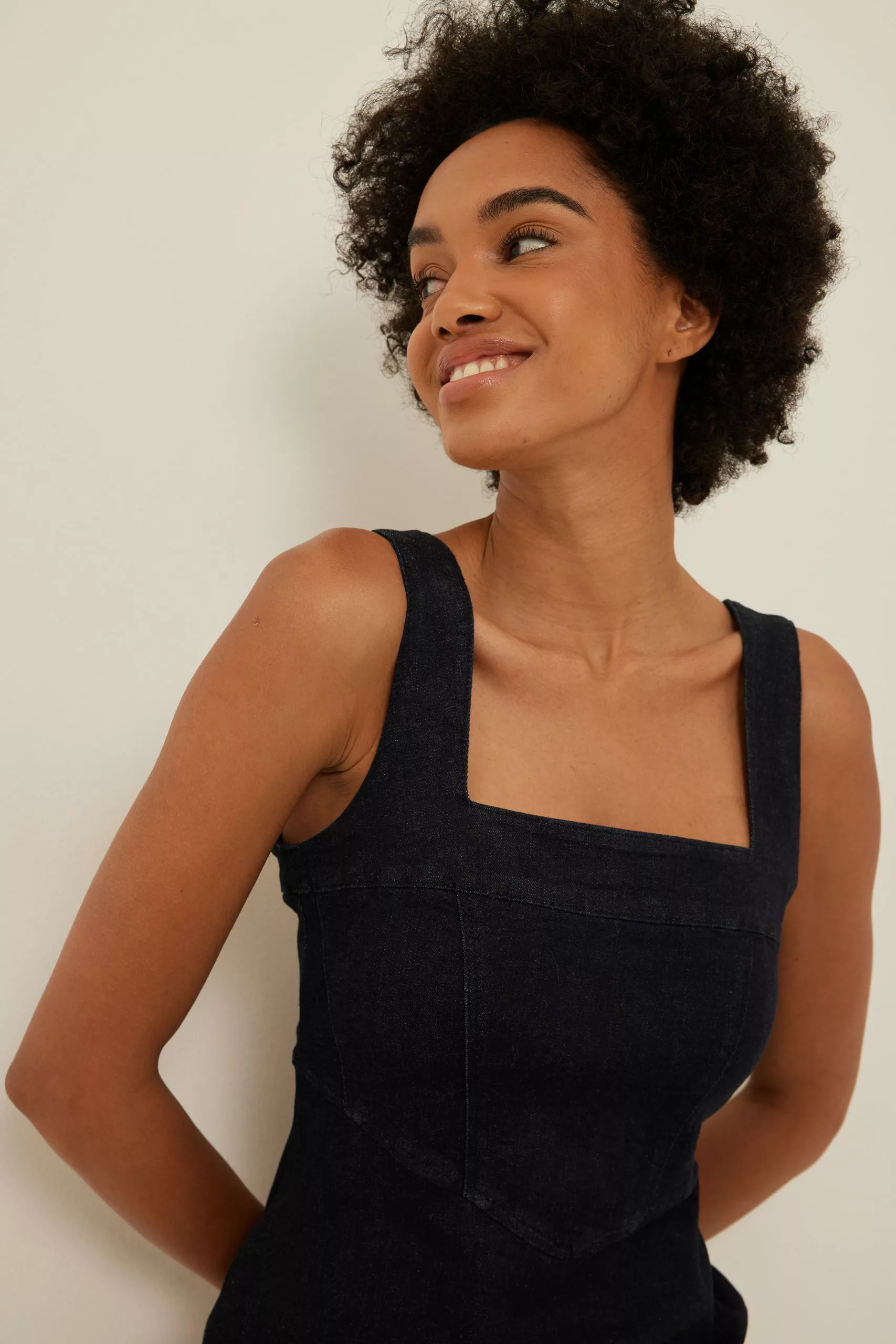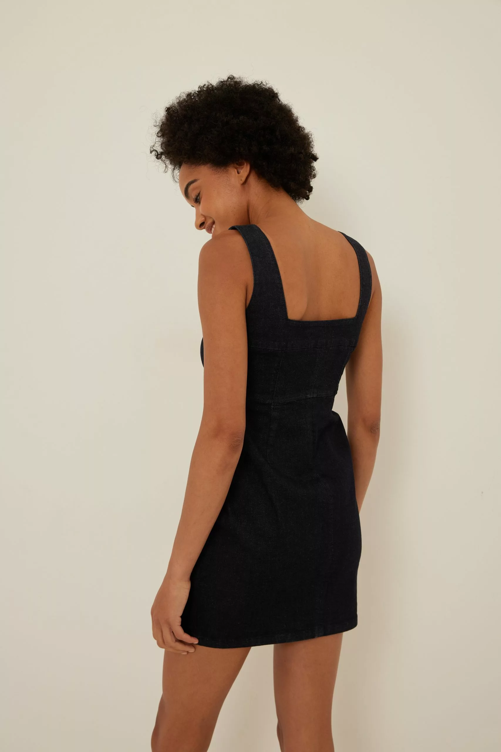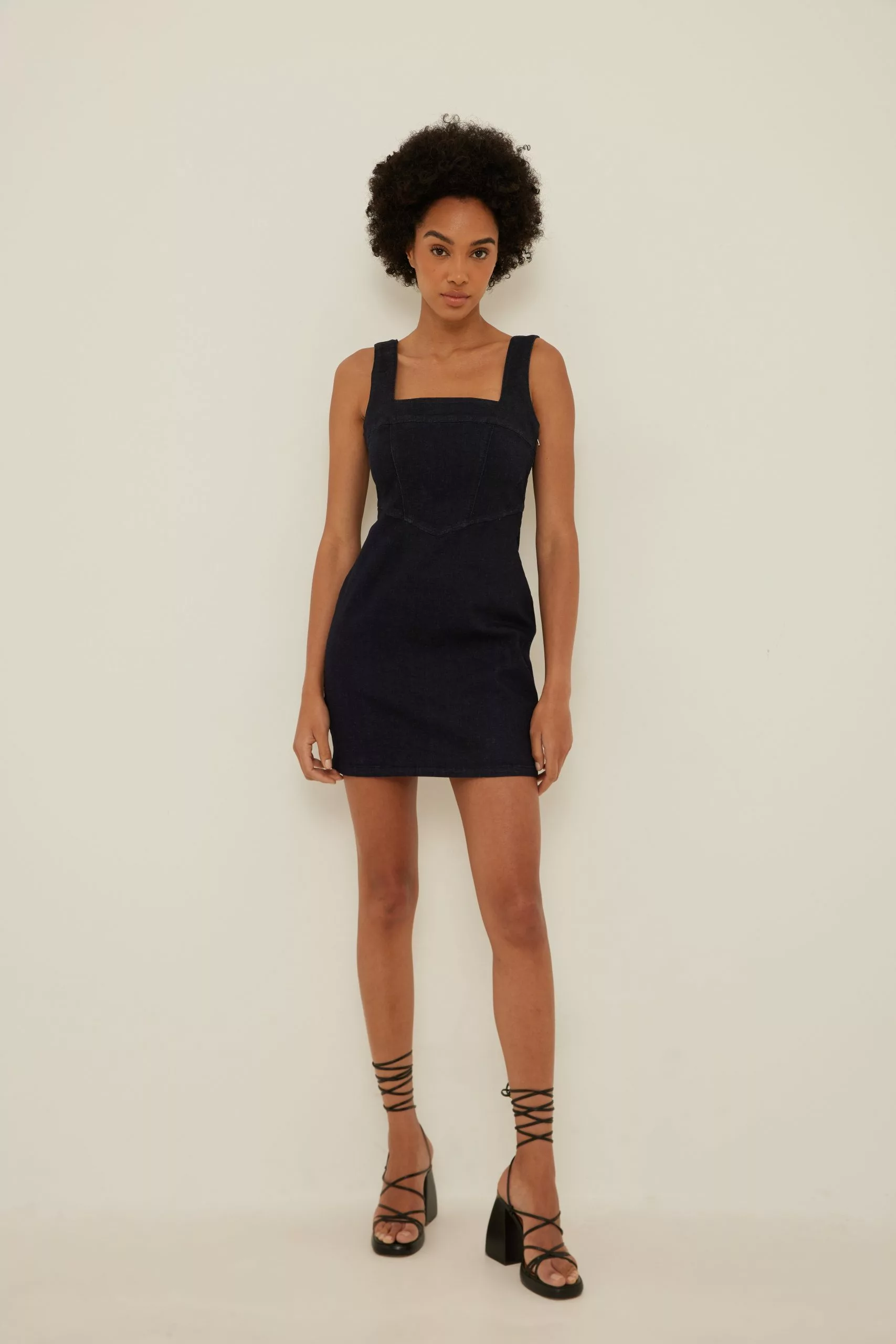 This mini dress is fitted and features shoulder straps, a side zipper closure and a stretchy material in denim.