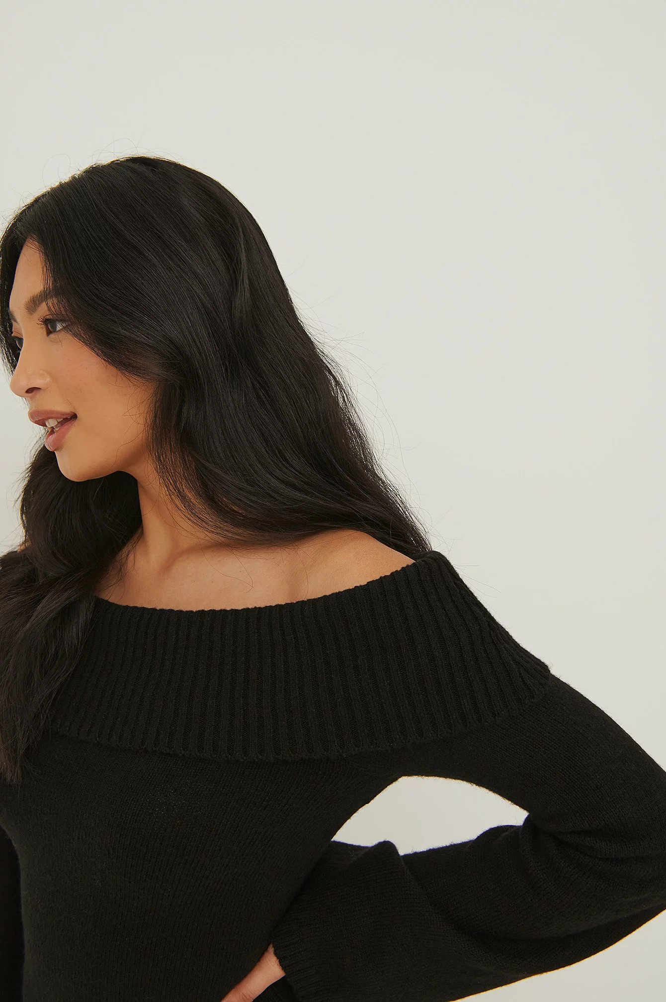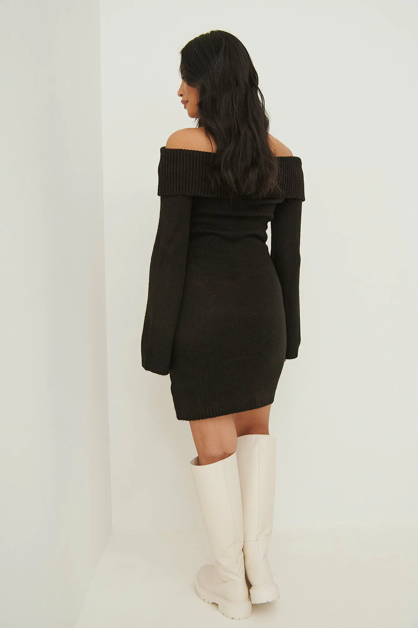 This dress features a long sleeve, an off shoulder look, a folded over design and a knitted material.