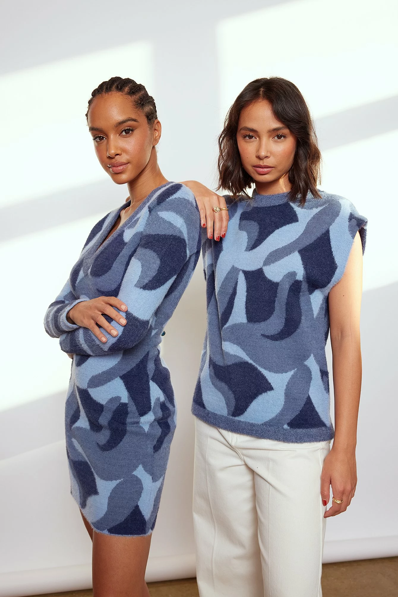 This mini dress features a V-neck. It has long sleeves and a knitted material.